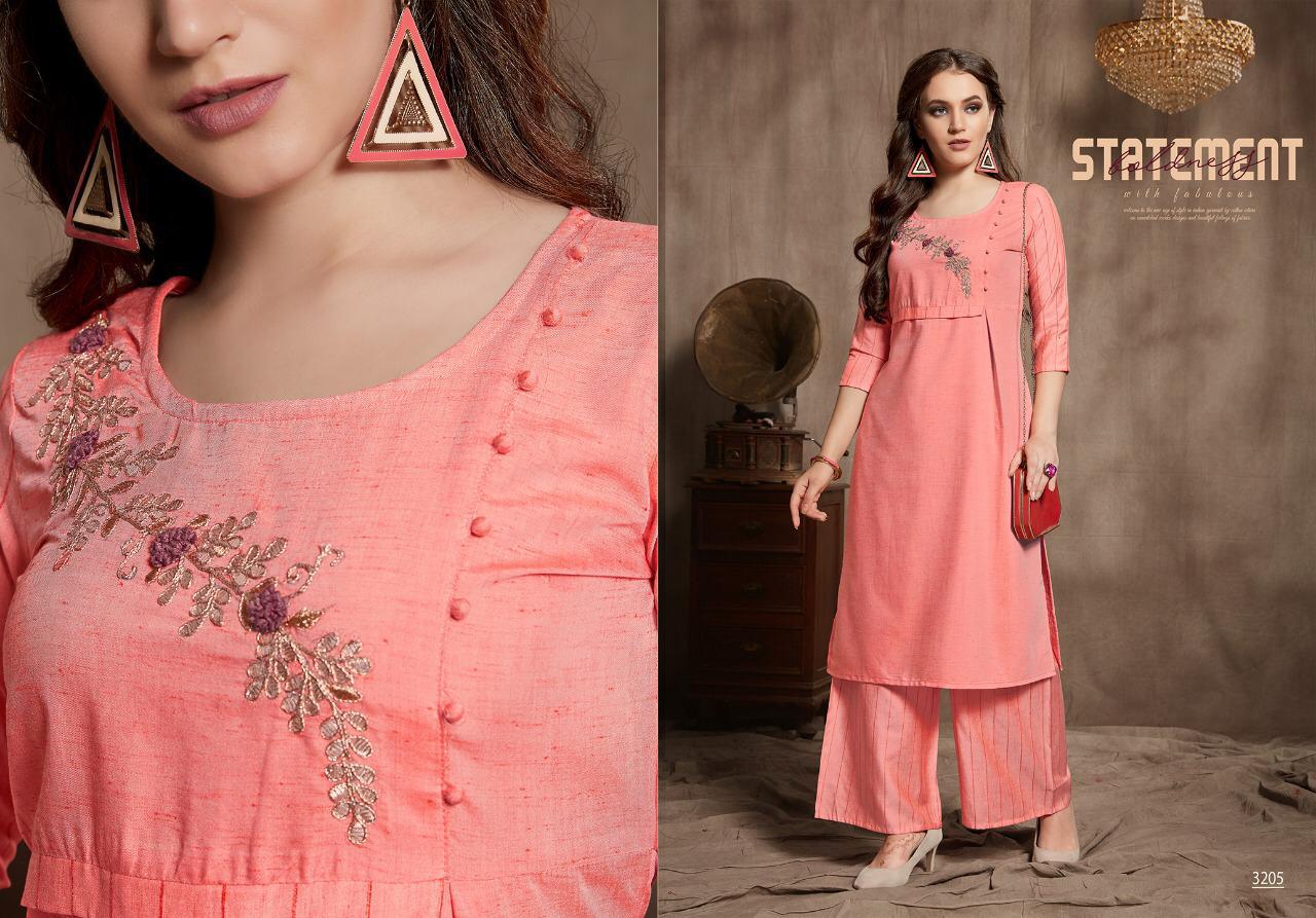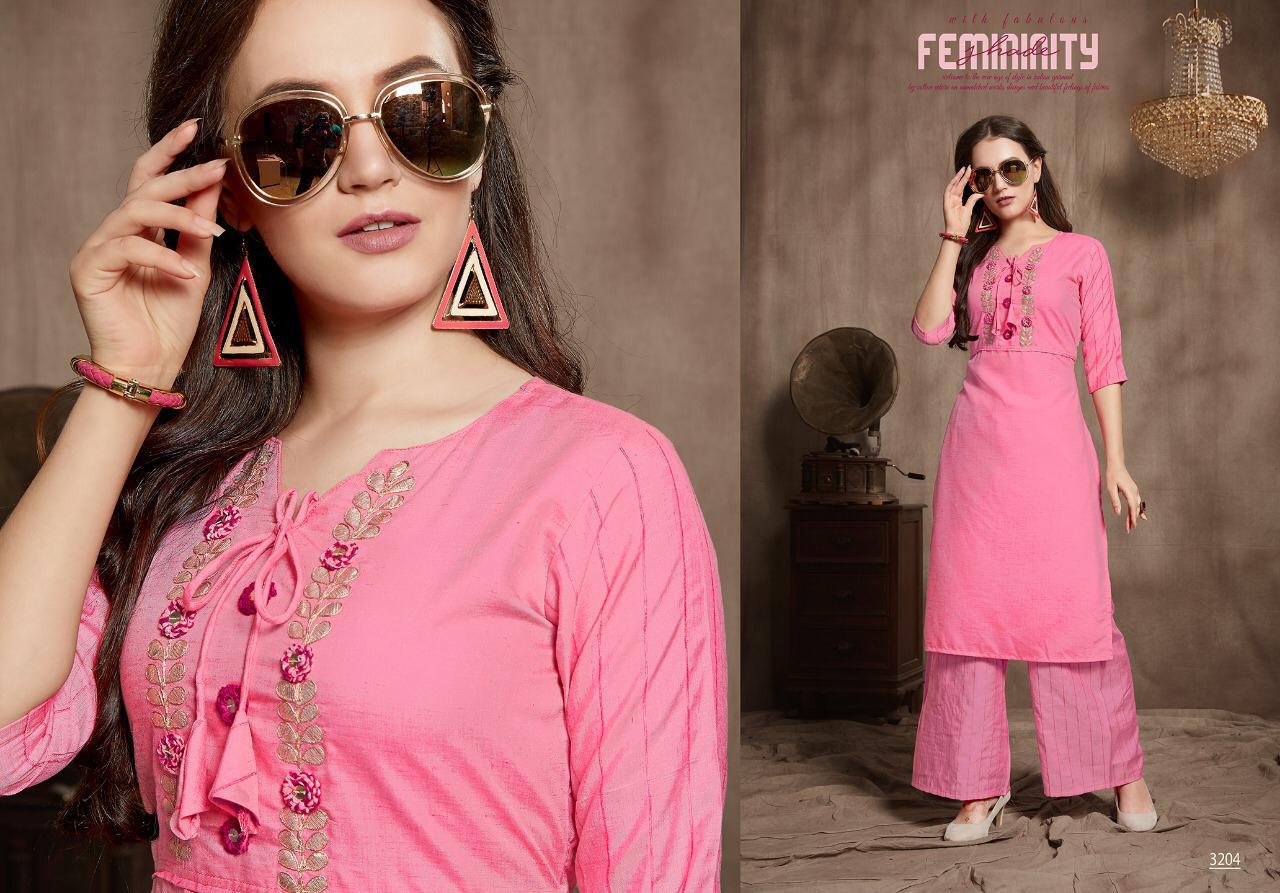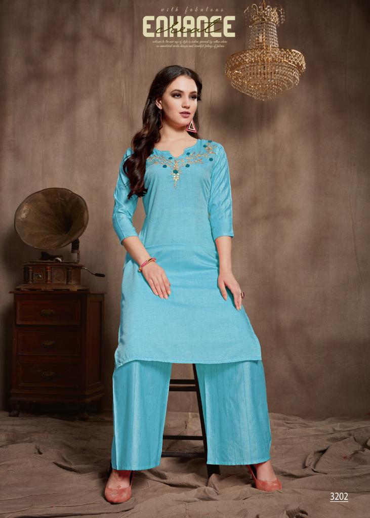 Catalog name : ELITE Size : M L XL XXL 38 40 42 44 Fabric : Two piece concept Top- Fancy Wiscose Silk fabric with Gota Patti work Palazo- Wiscose silk lining Length : 43â Avg rate- â¹750/- Pieces : 6 per bag AMAAYA GARMENTS Set to set . |