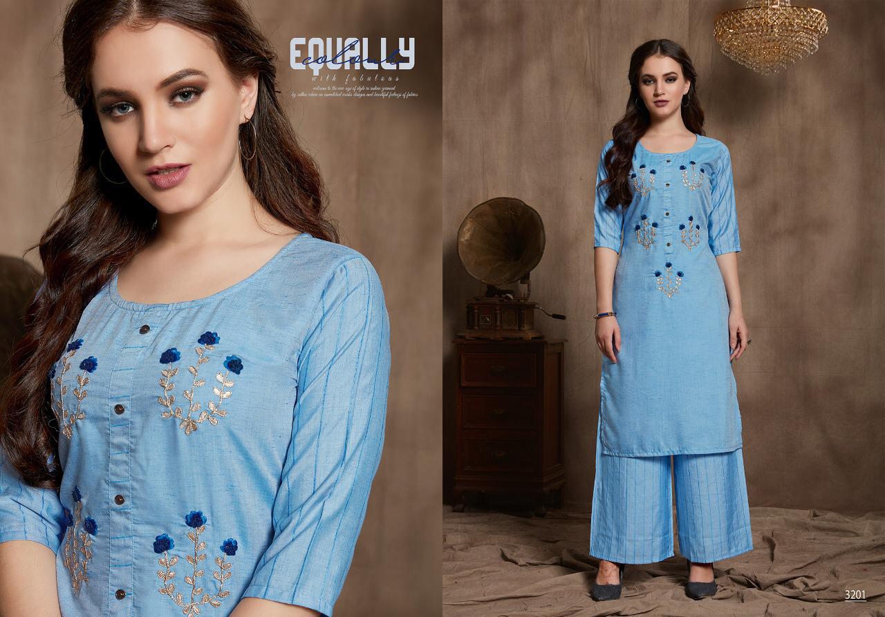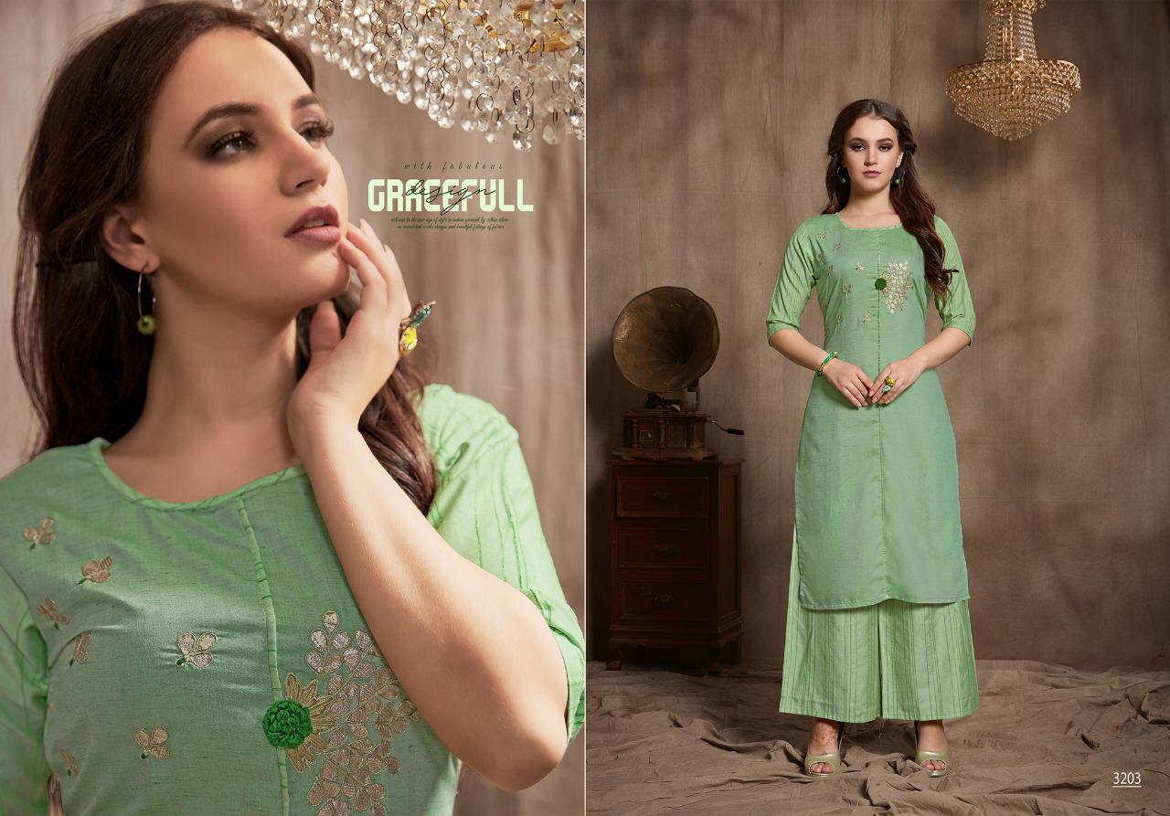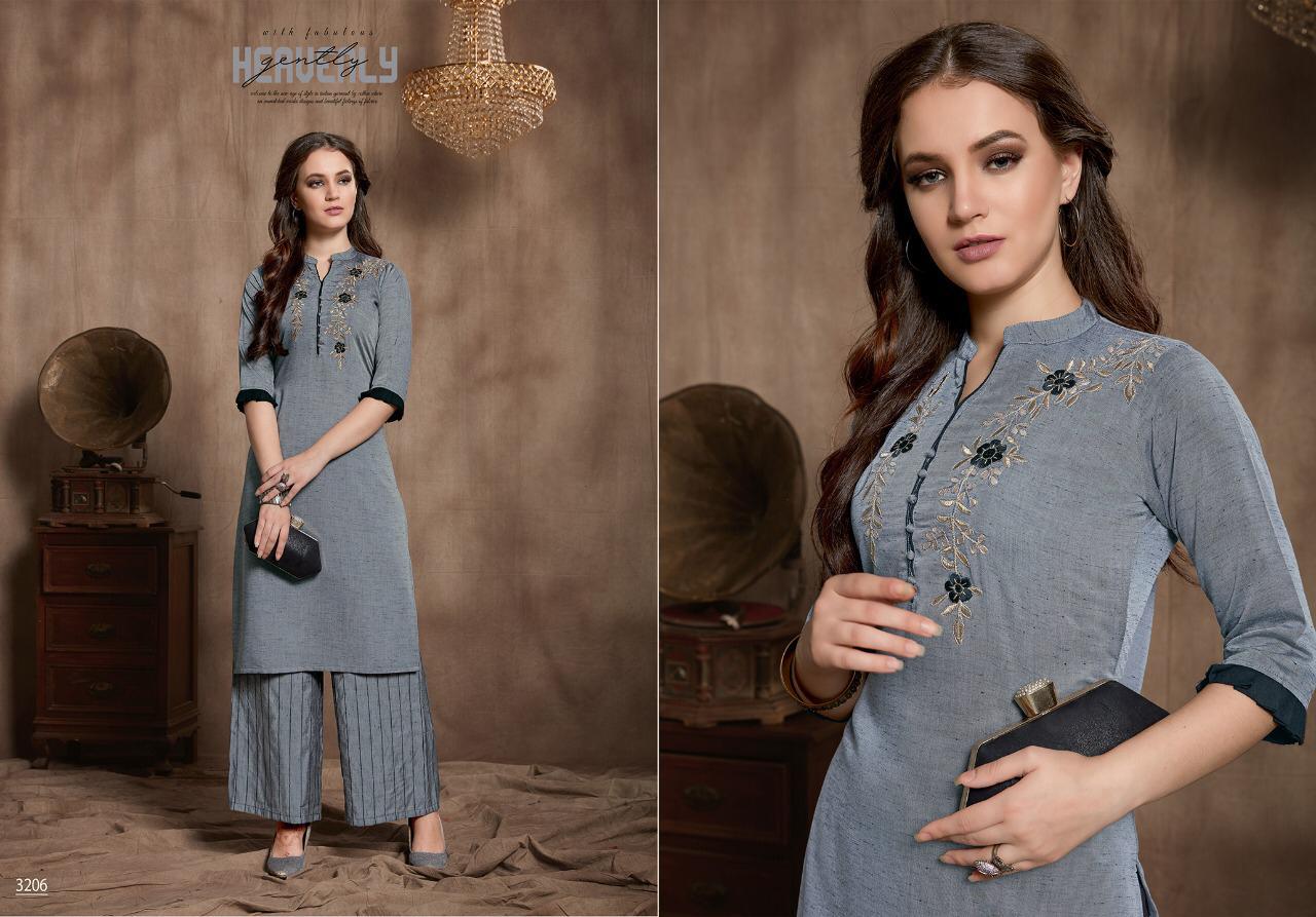 Catalog name : ELITE Size : M L XL XXL 38 40 42 44 Fabric : Two piece concept Top- Fancy Wiscose Silk fabric with Gota Patti work Palazo- Wiscose silk lining Length : 43â Avg rate- â¹750/- Pieces : 6 per bag AMAAYA GARMENTS Set to set . |