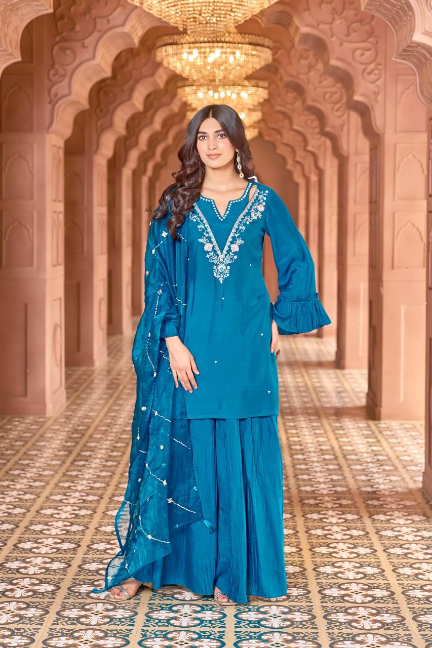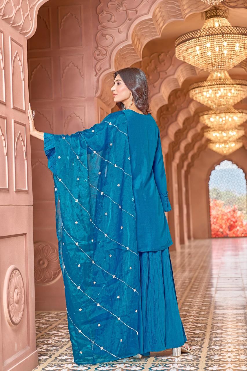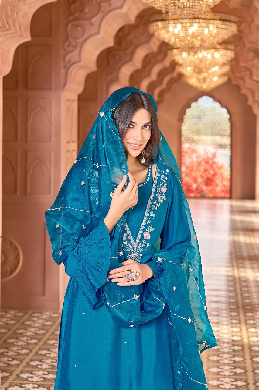 TEAL BLUE Fabric - Bottom - PURE MUSLIN CRUSH WITH COTTON LINING Dupatta - Organeza with Handwork Price : 1870/- + GST Size - M (38) , L (40) , XL ( 42 ) , XXL ( 44 ) |