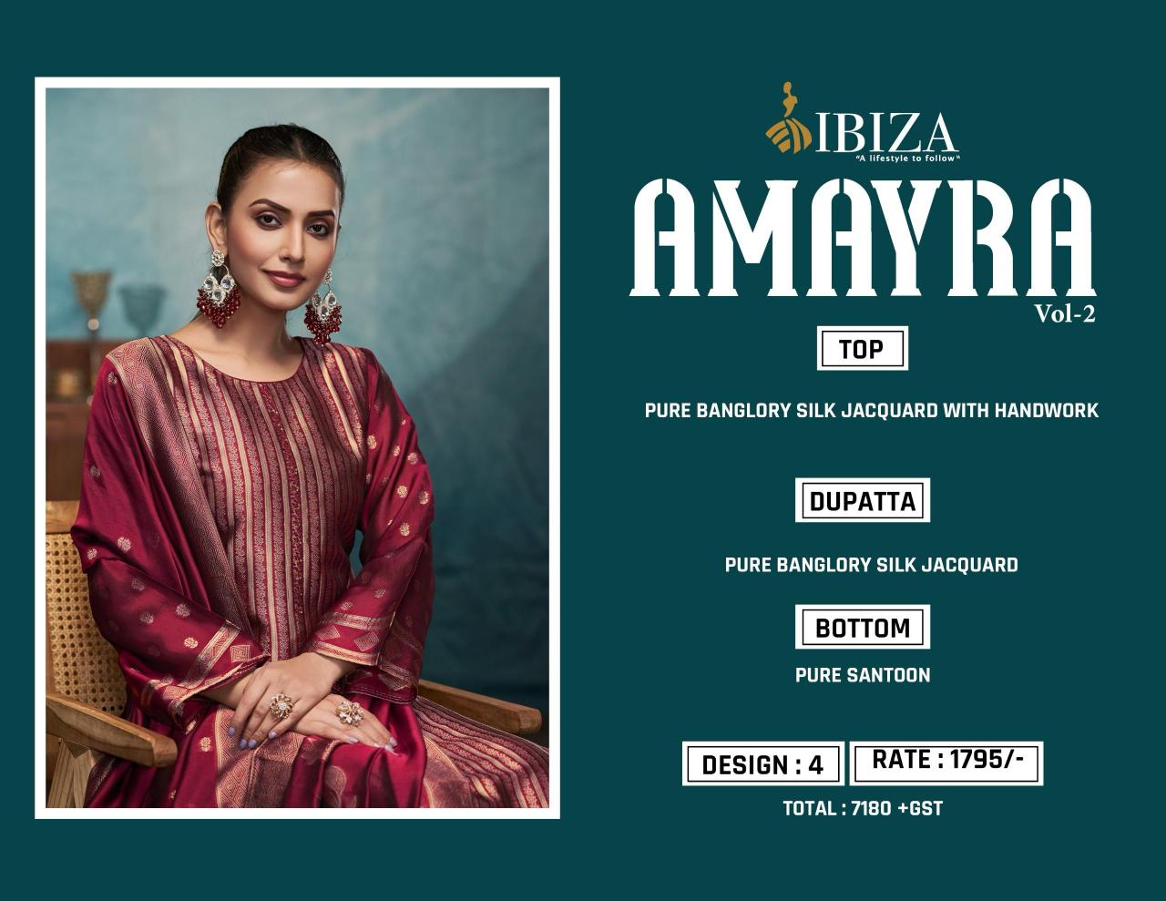 🙏🙏🙏IBIZA🙏🙏🙏 NEW SERIES ✌🏻AMAYRA VOL- 2 ✌🏻 👊Fabric Details👊 👗Top:-PURE BANGLORY SILK JACQUARD WITH HANDWORK 👖Bottom:- PURE SANTOON 🔻Designs:- 4 PCS Rate: 1795/- Regards |