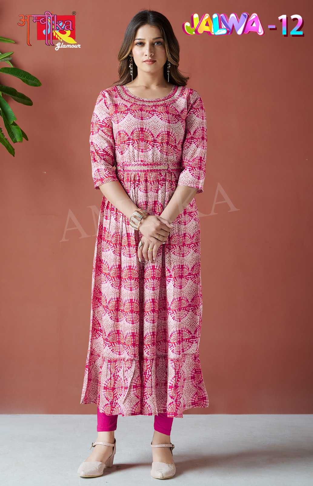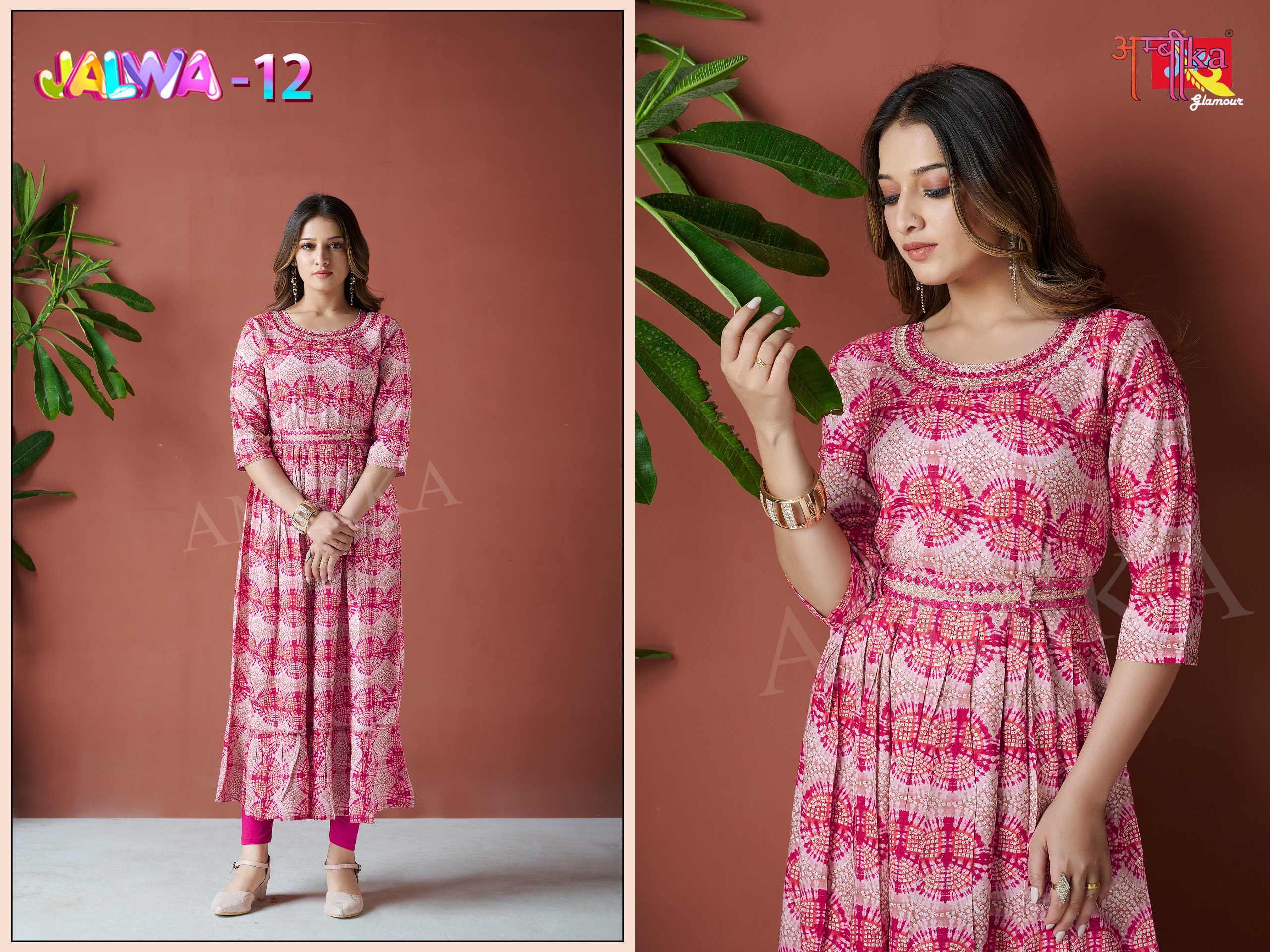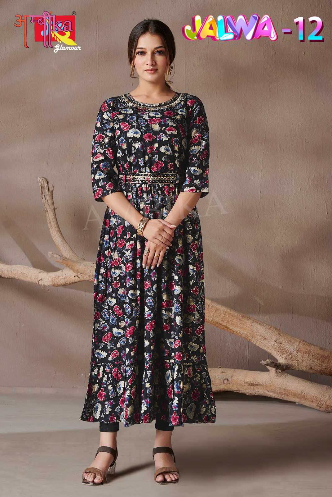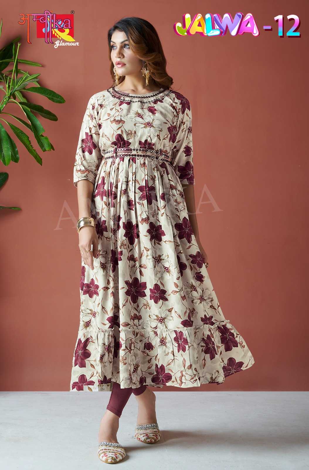 ambika kurtis jalwa vol 12 exclusive nayra full ghera with belt full stitch dress combo set