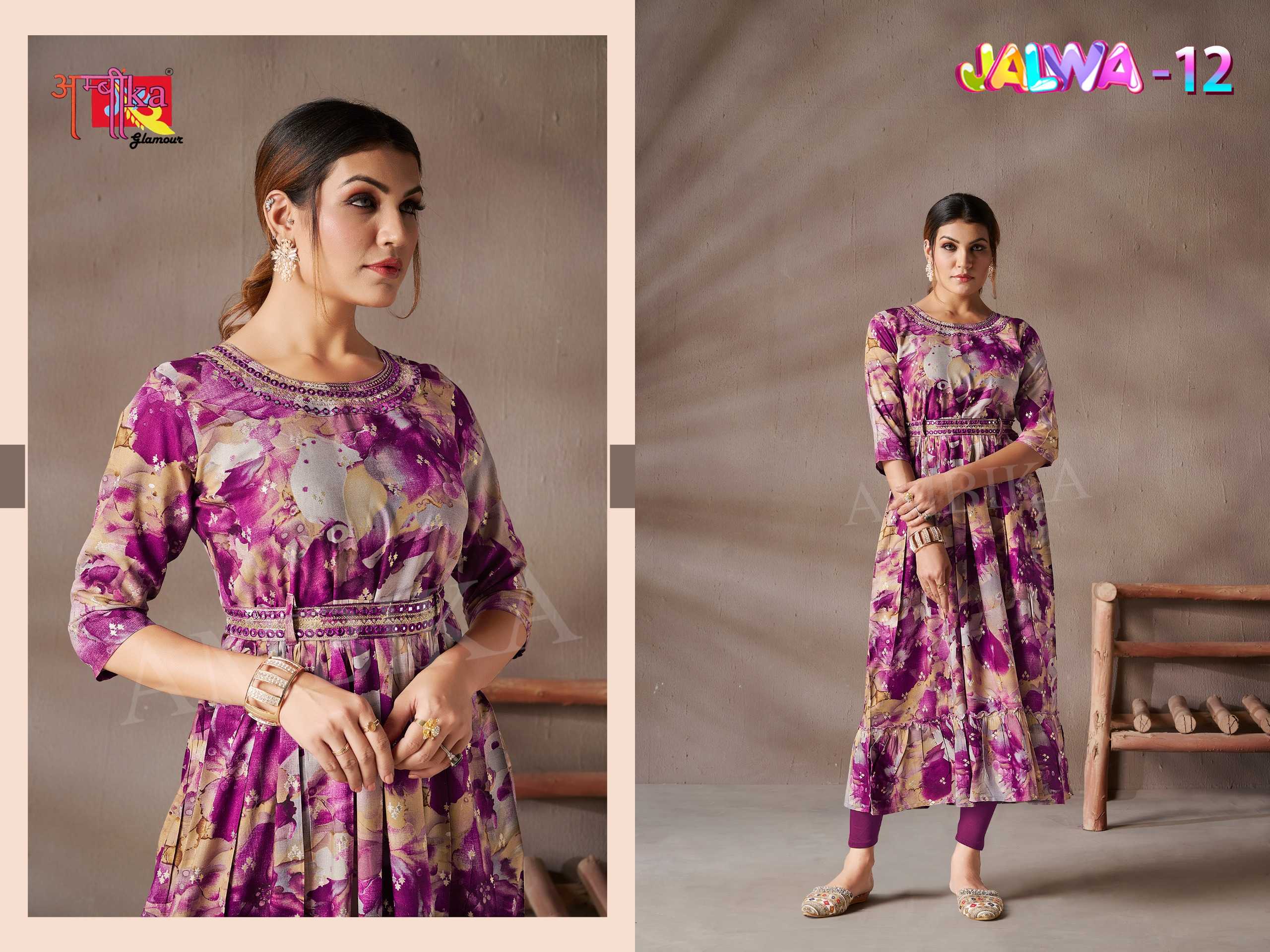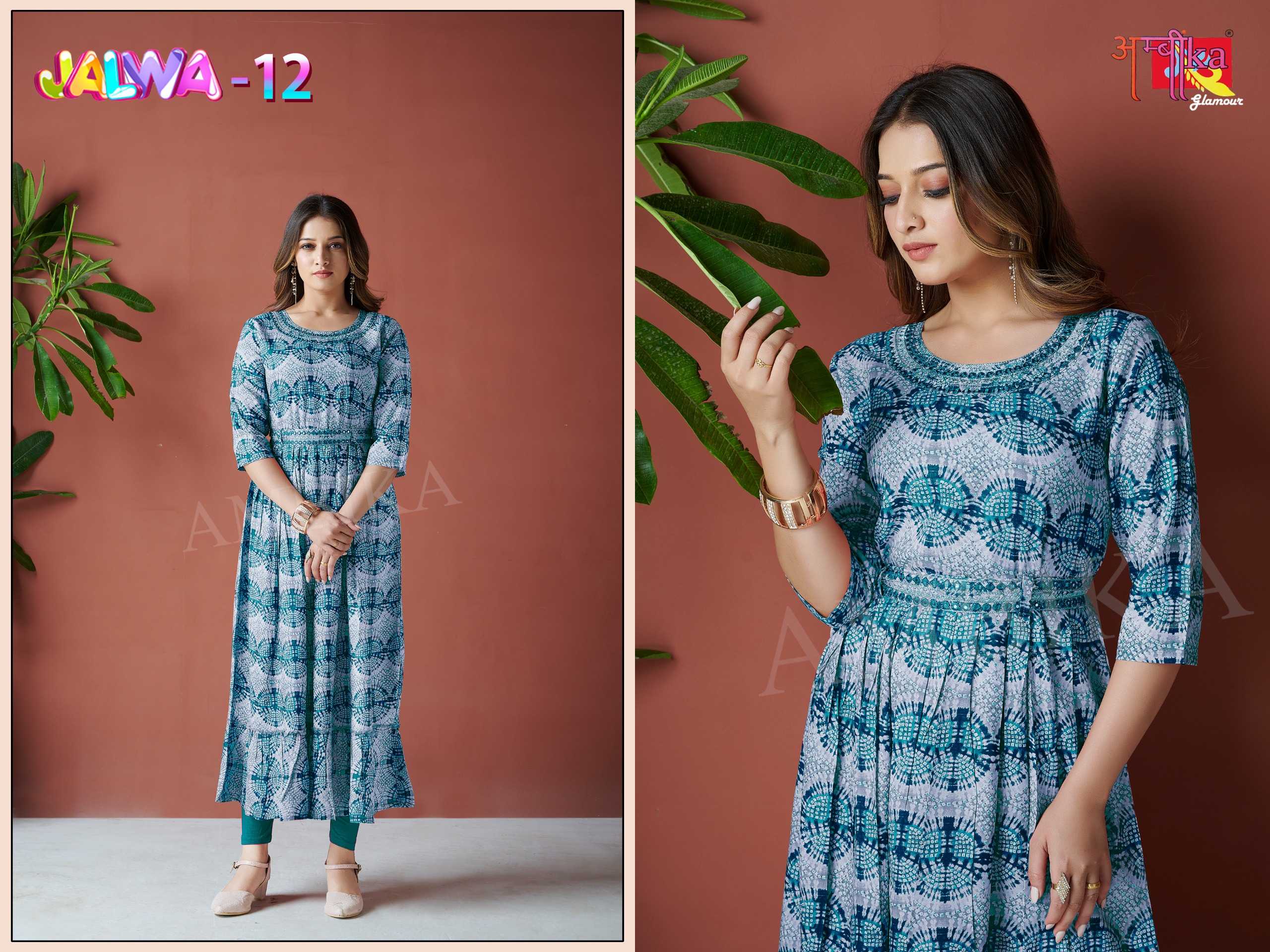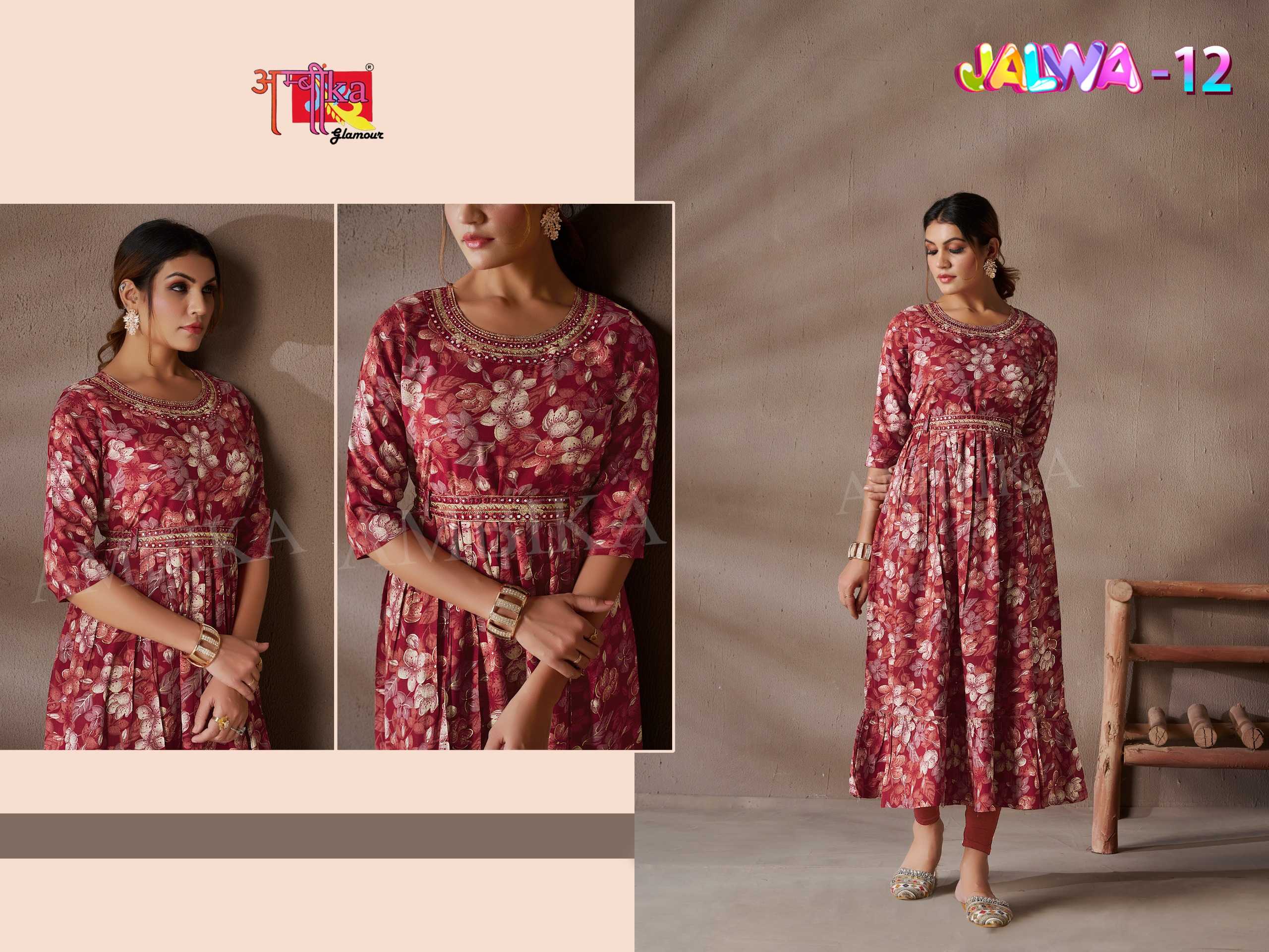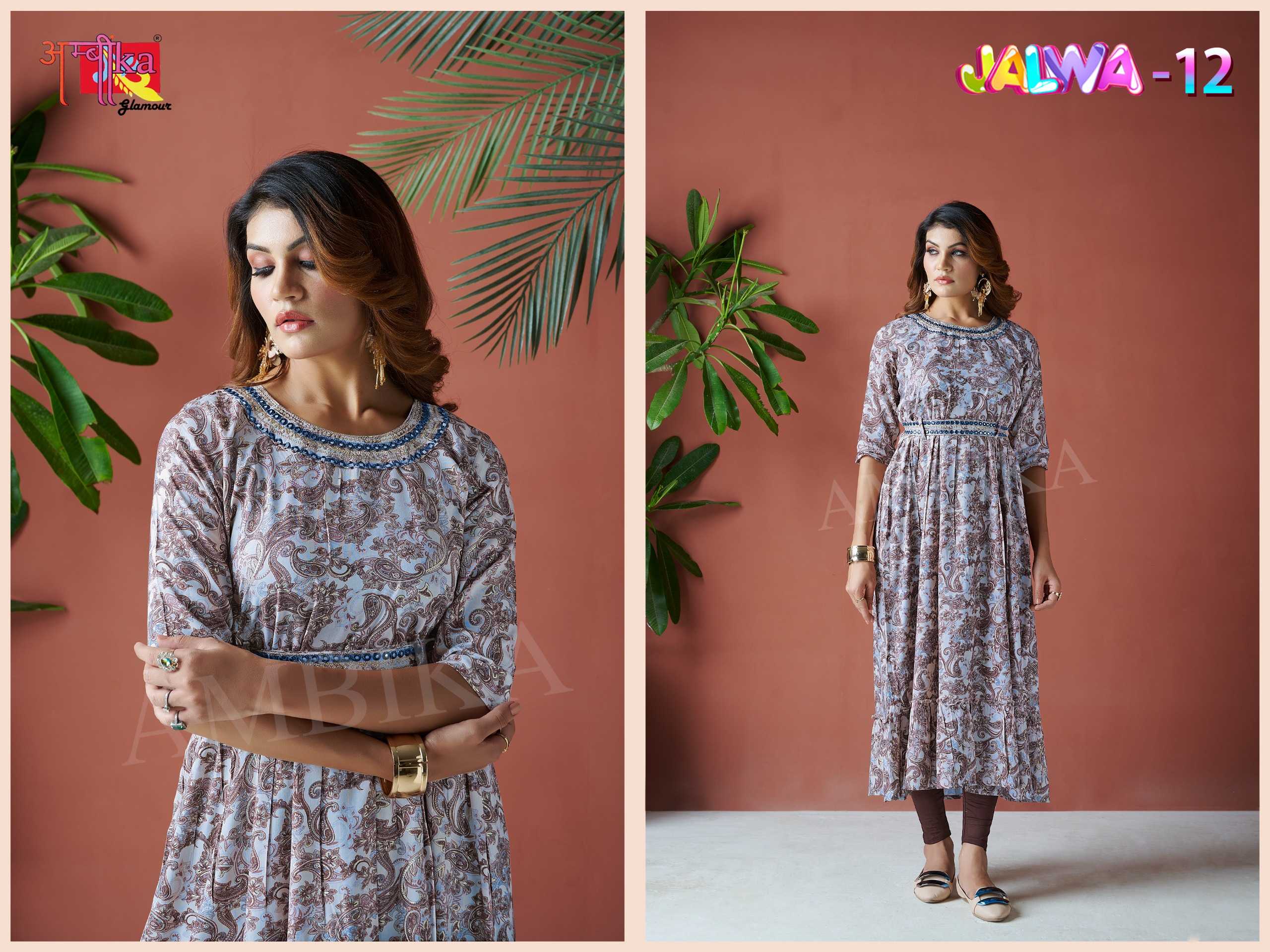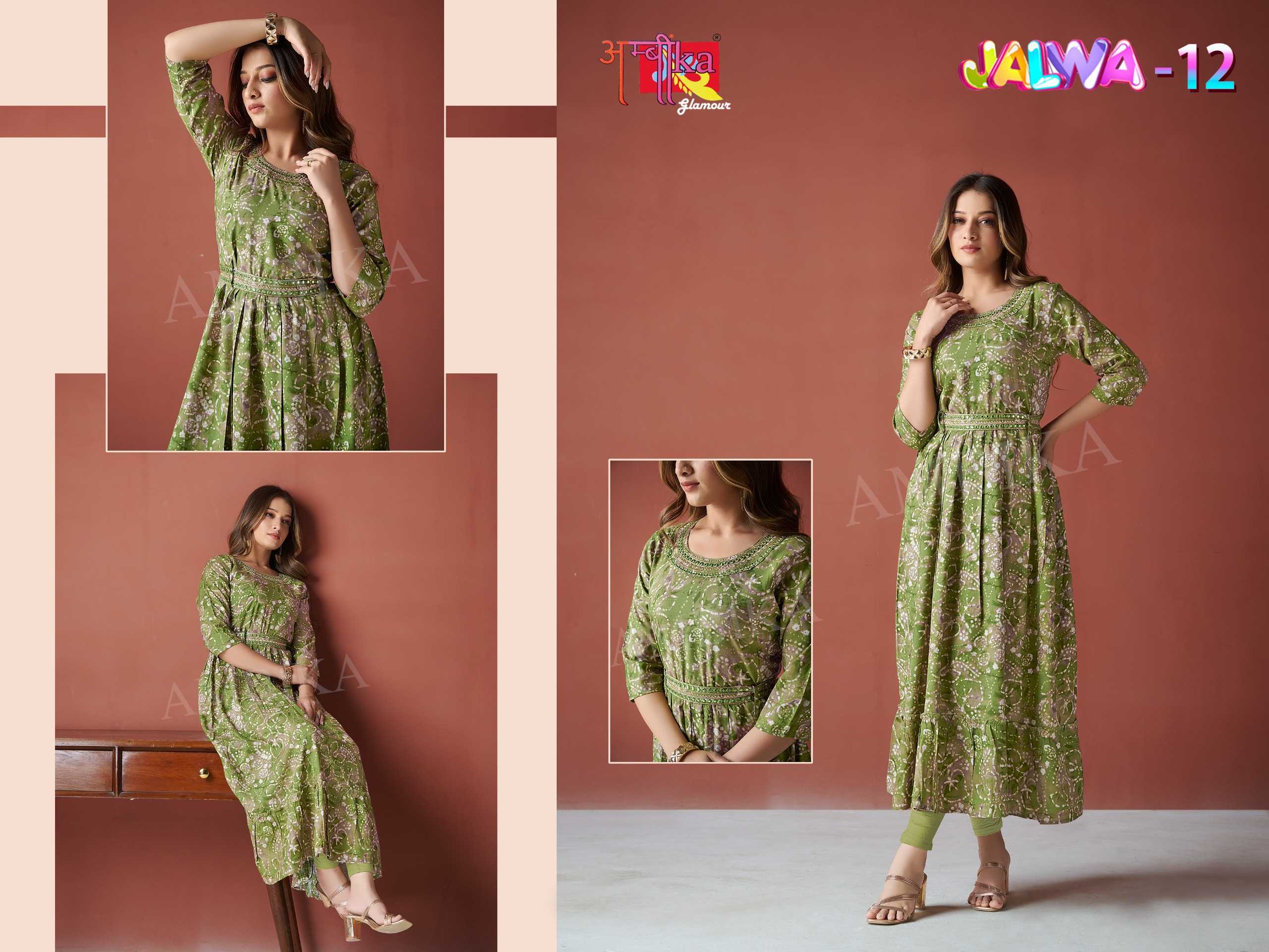 ambika kurtis jalwa vol 12 exclusive nayra full ghera with belt full stitch dress combo set