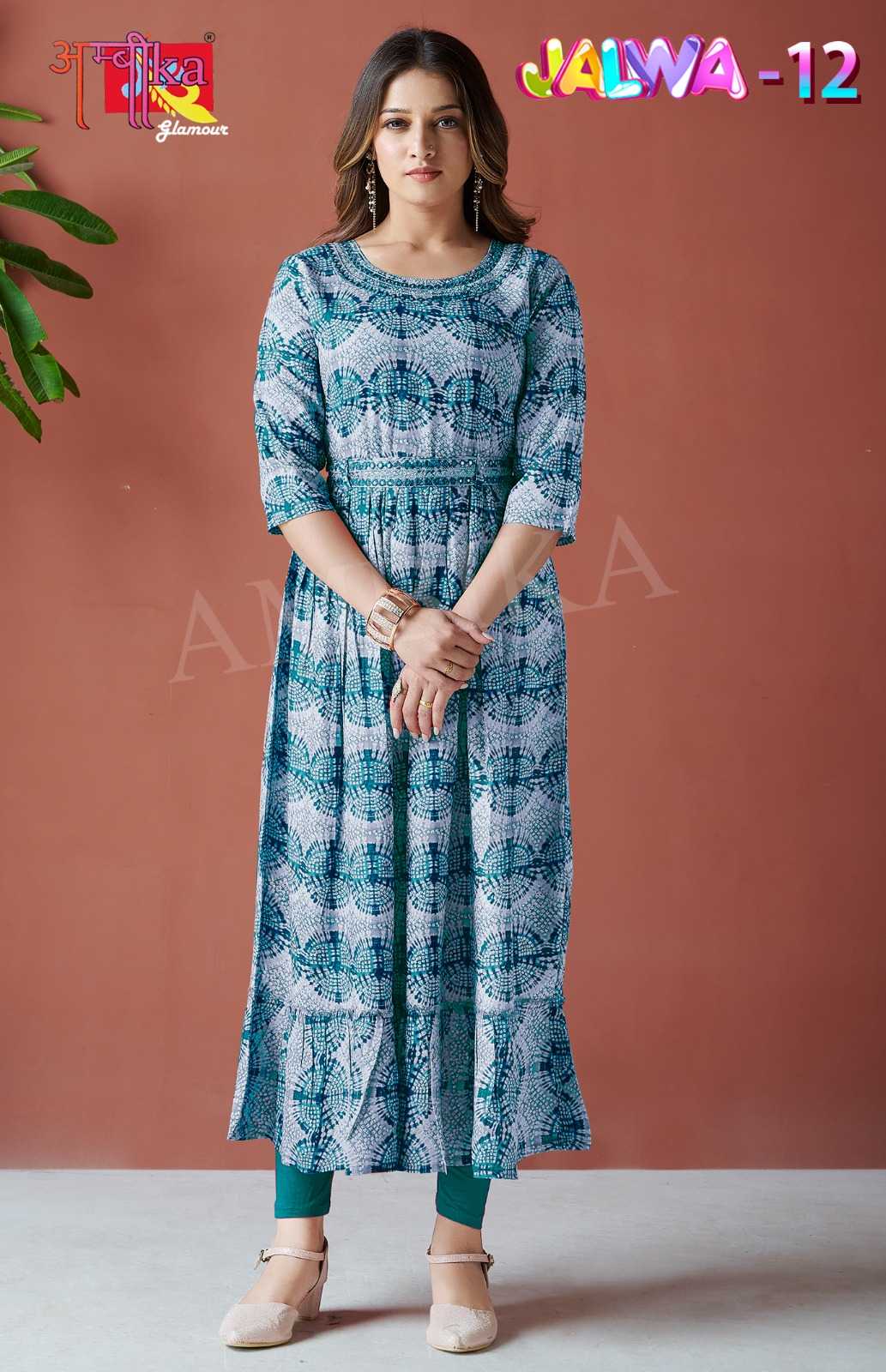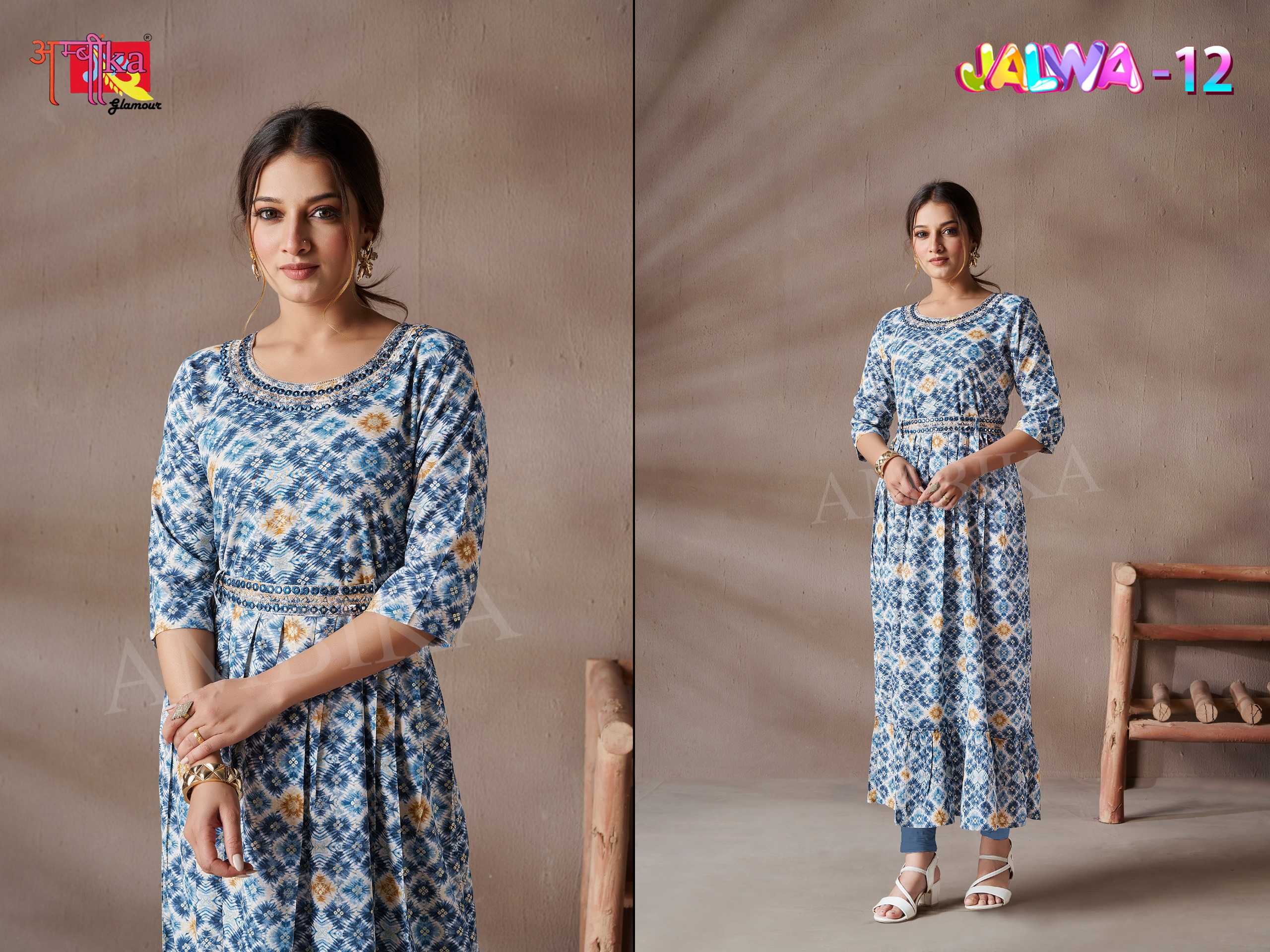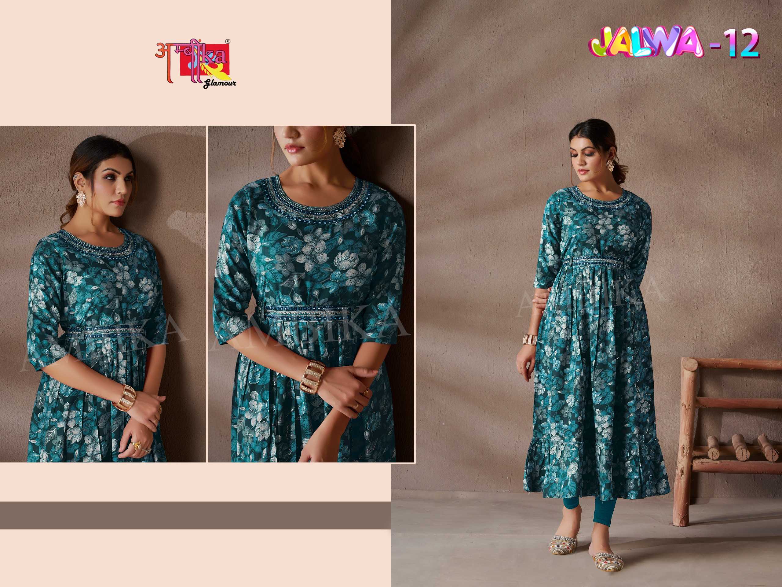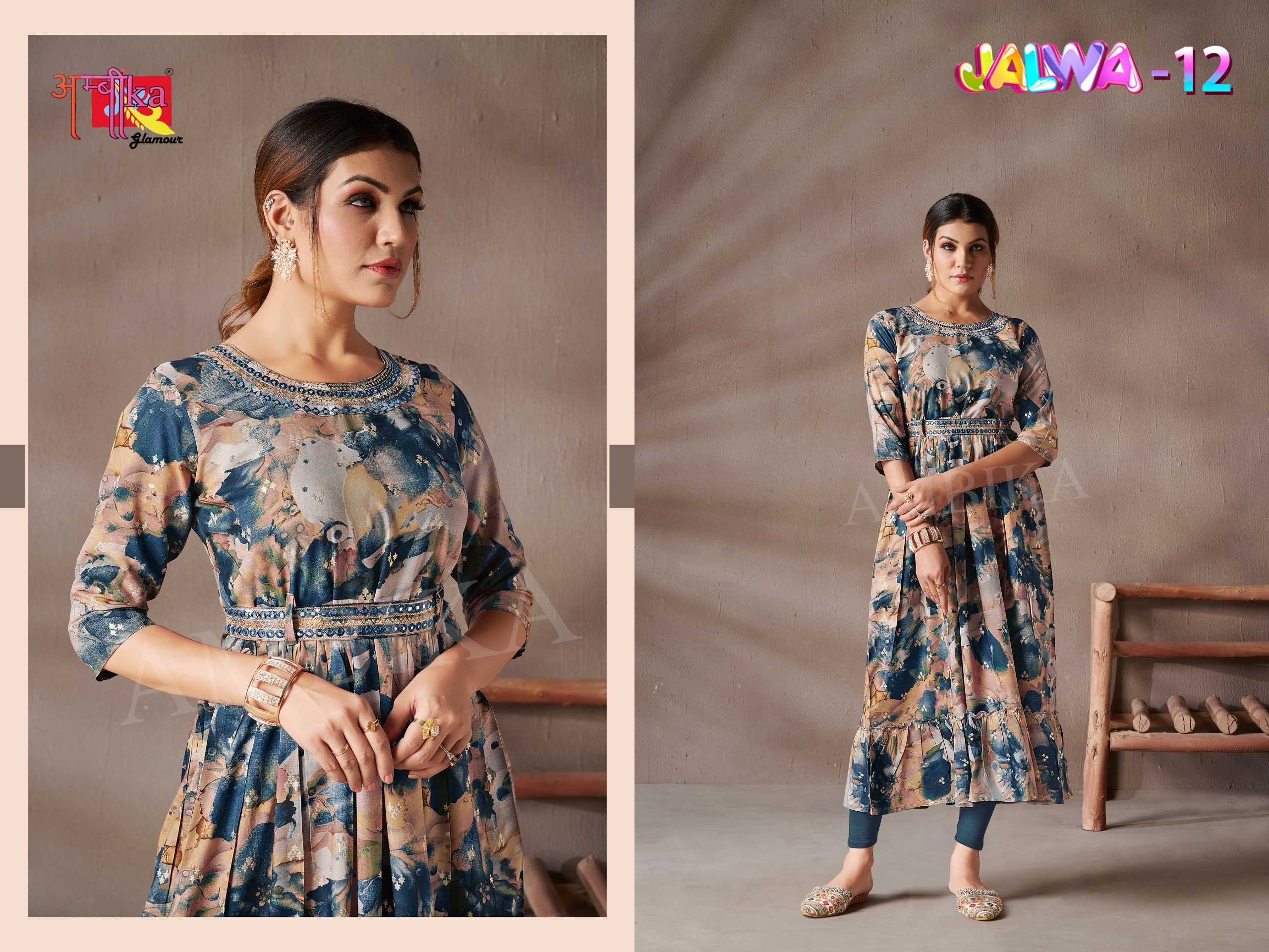 ambika kurtis jalwa vol 12 exclusive nayra full ghera with belt full stitch dress combo set