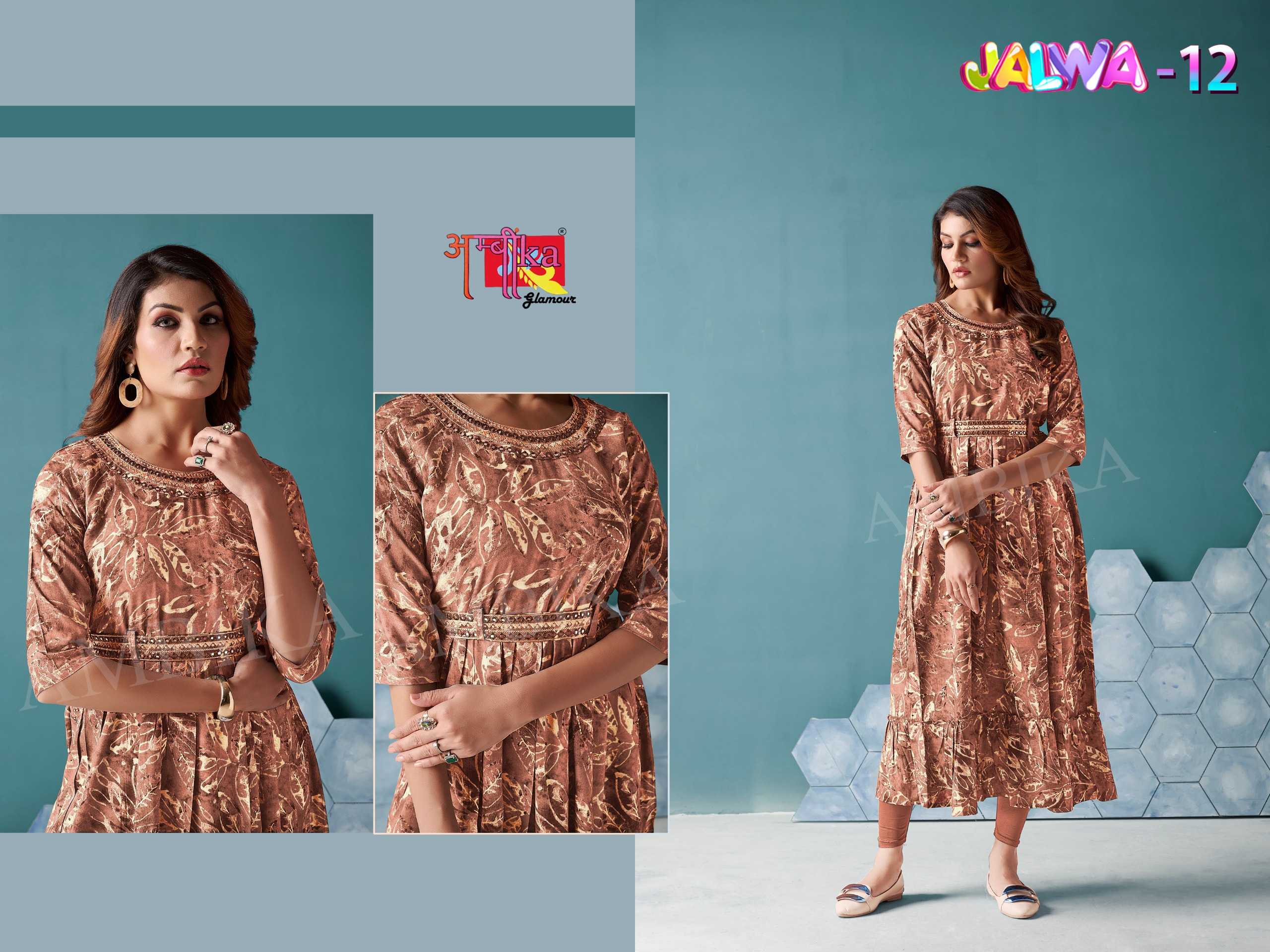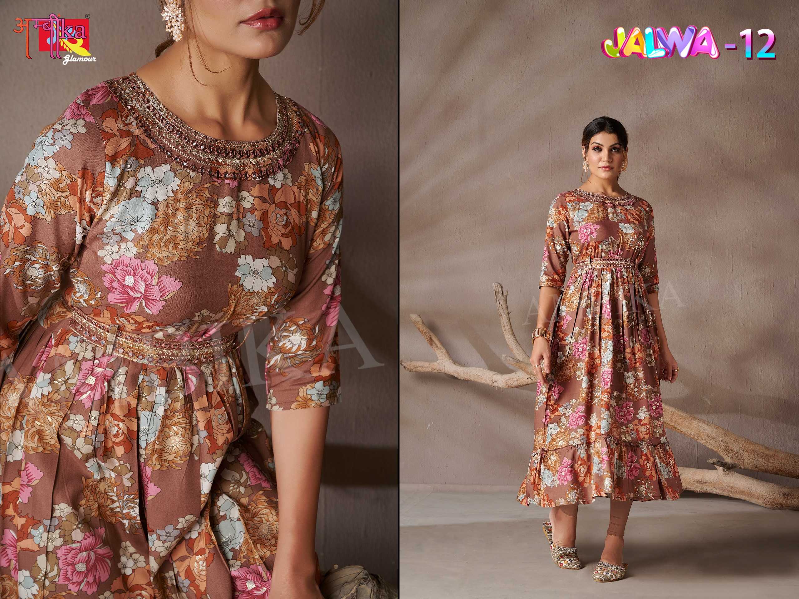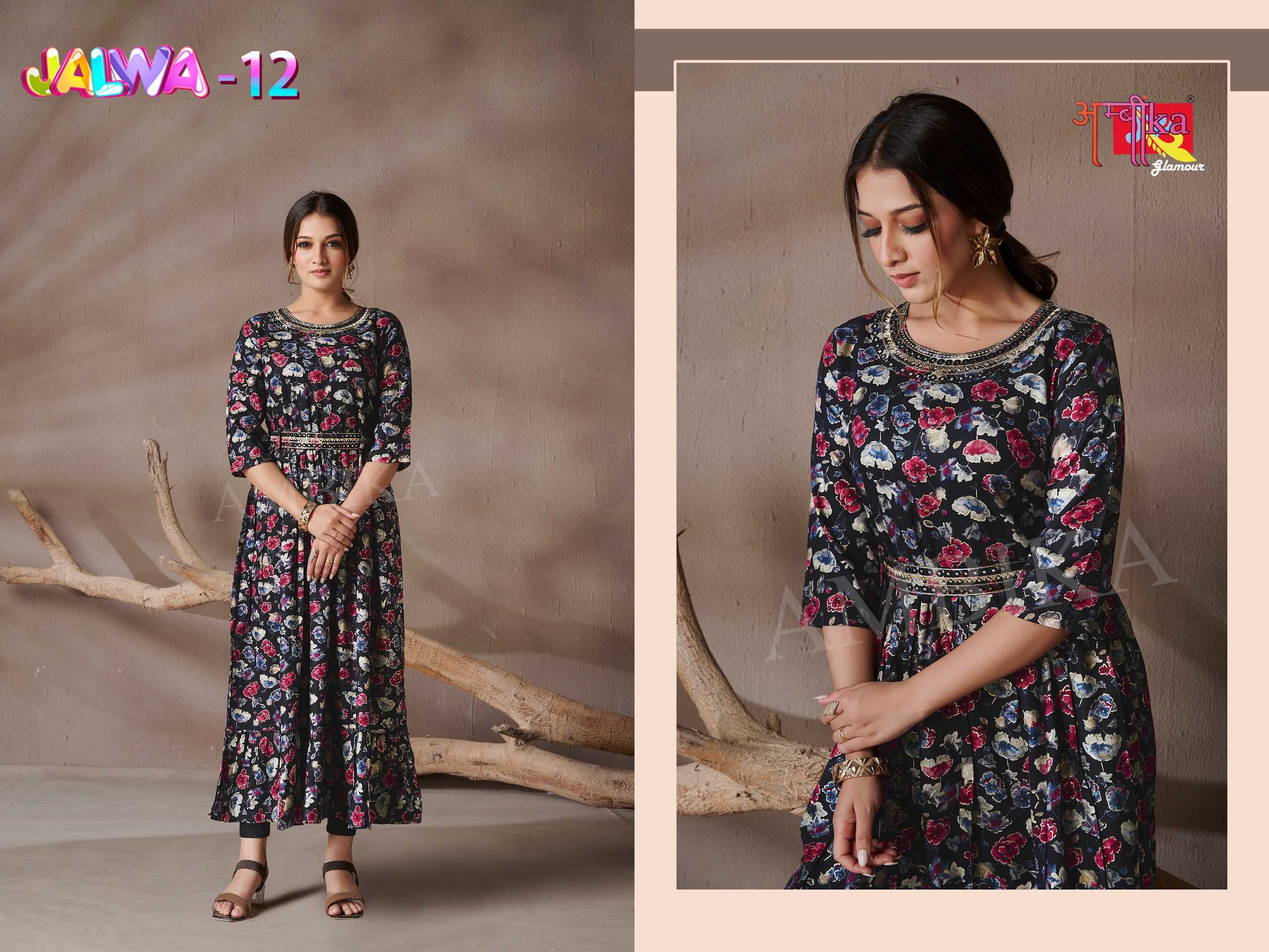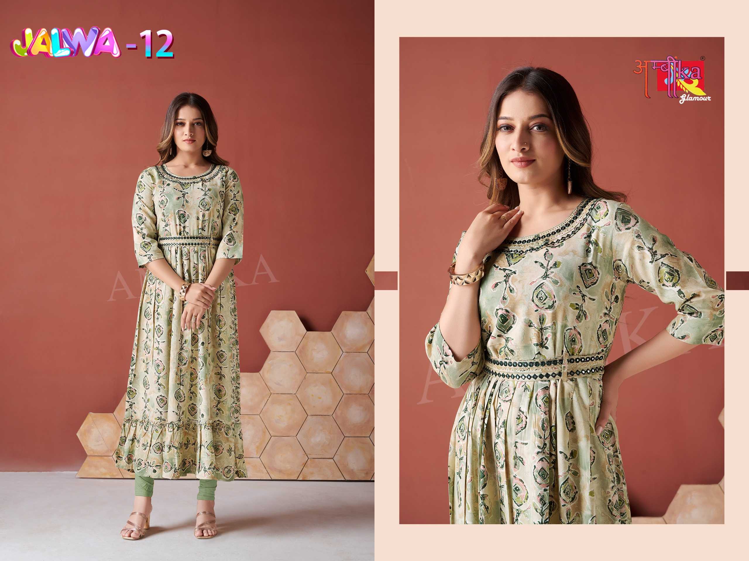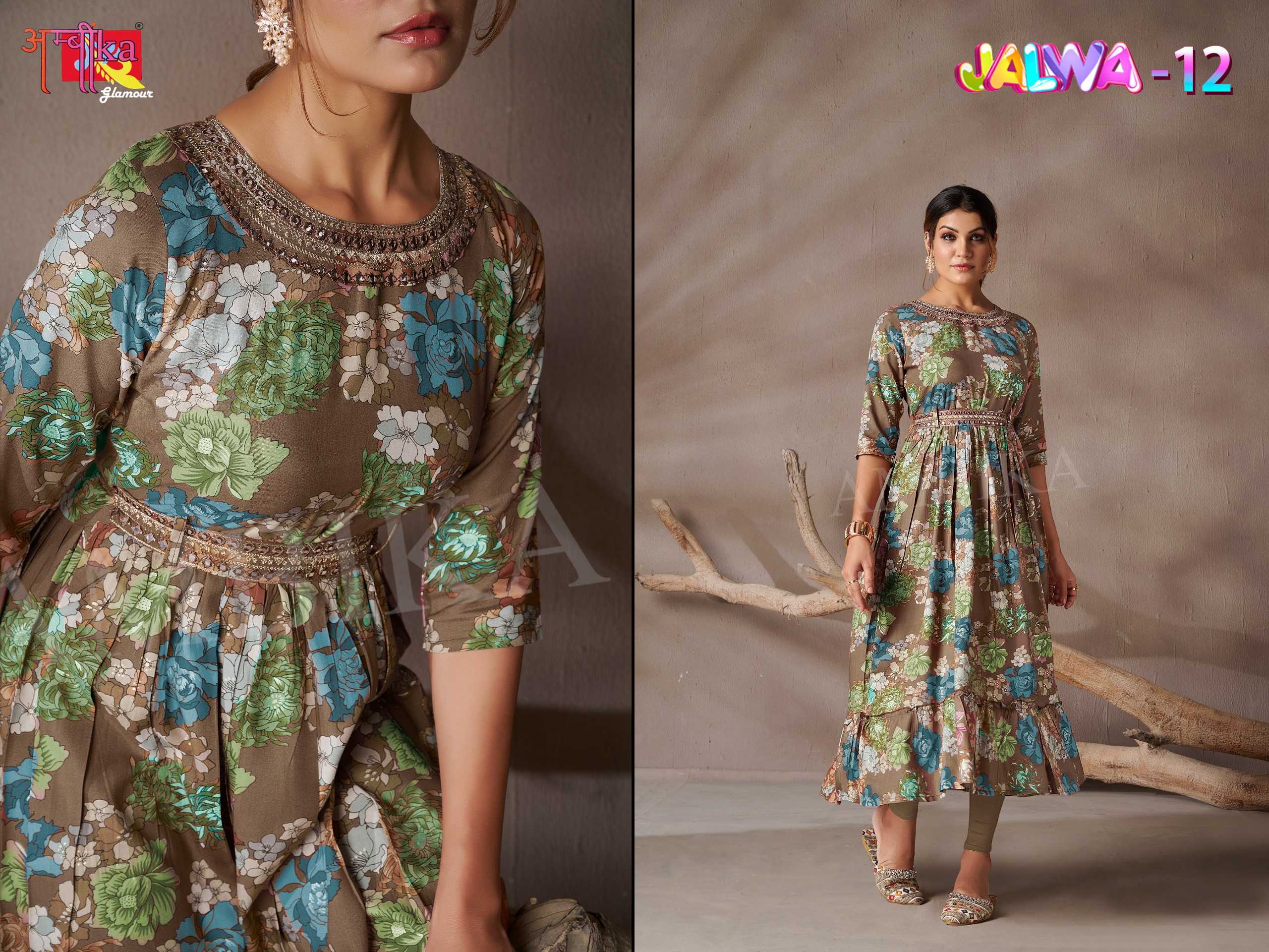 ambika kurtis jalwa vol 12 exclusive nayra full ghera with belt full stitch dress combo set