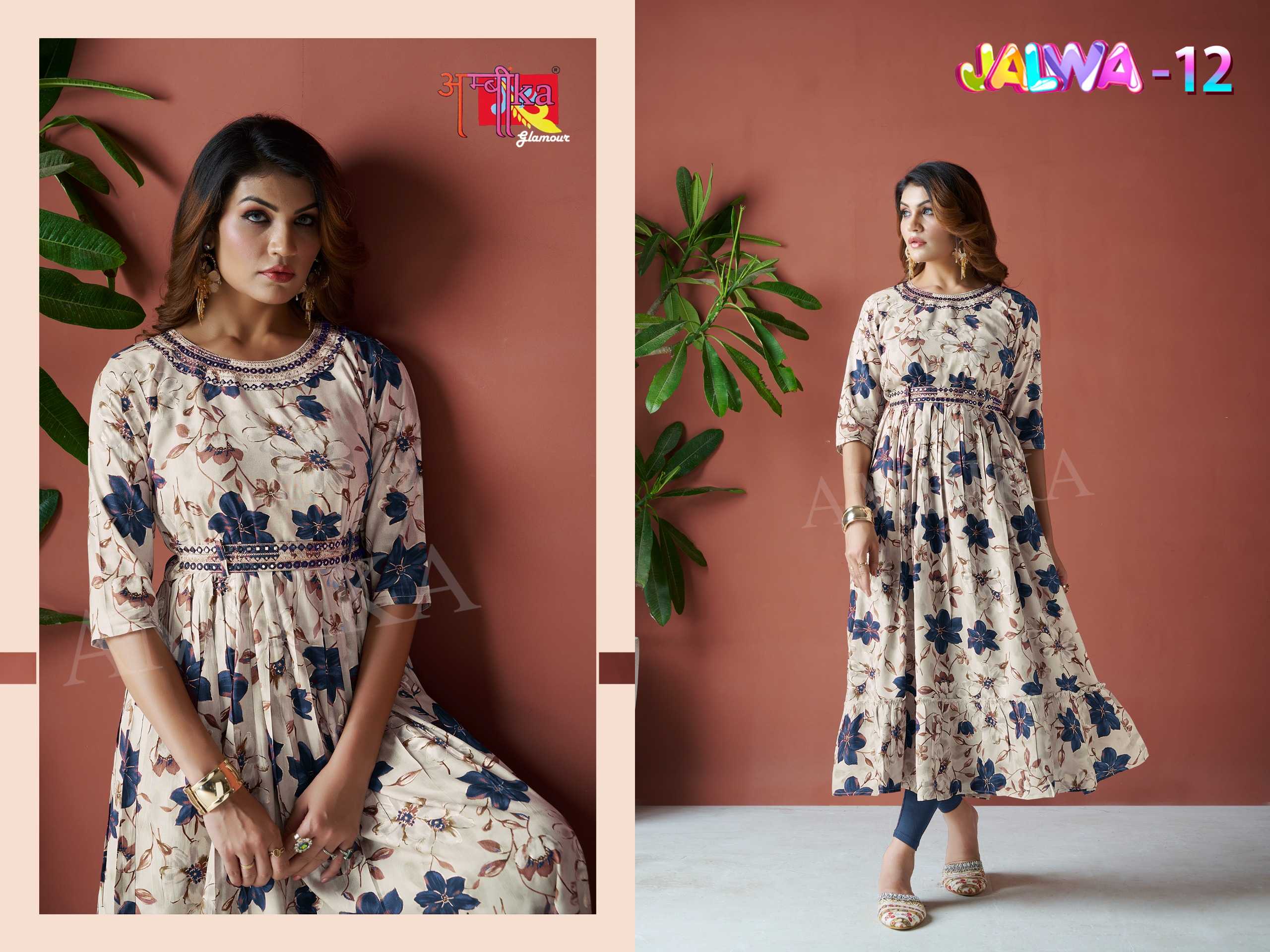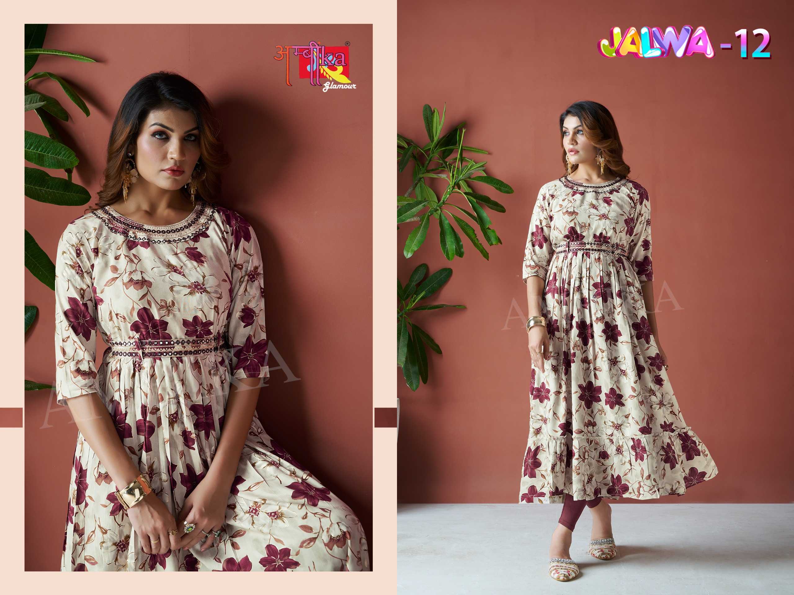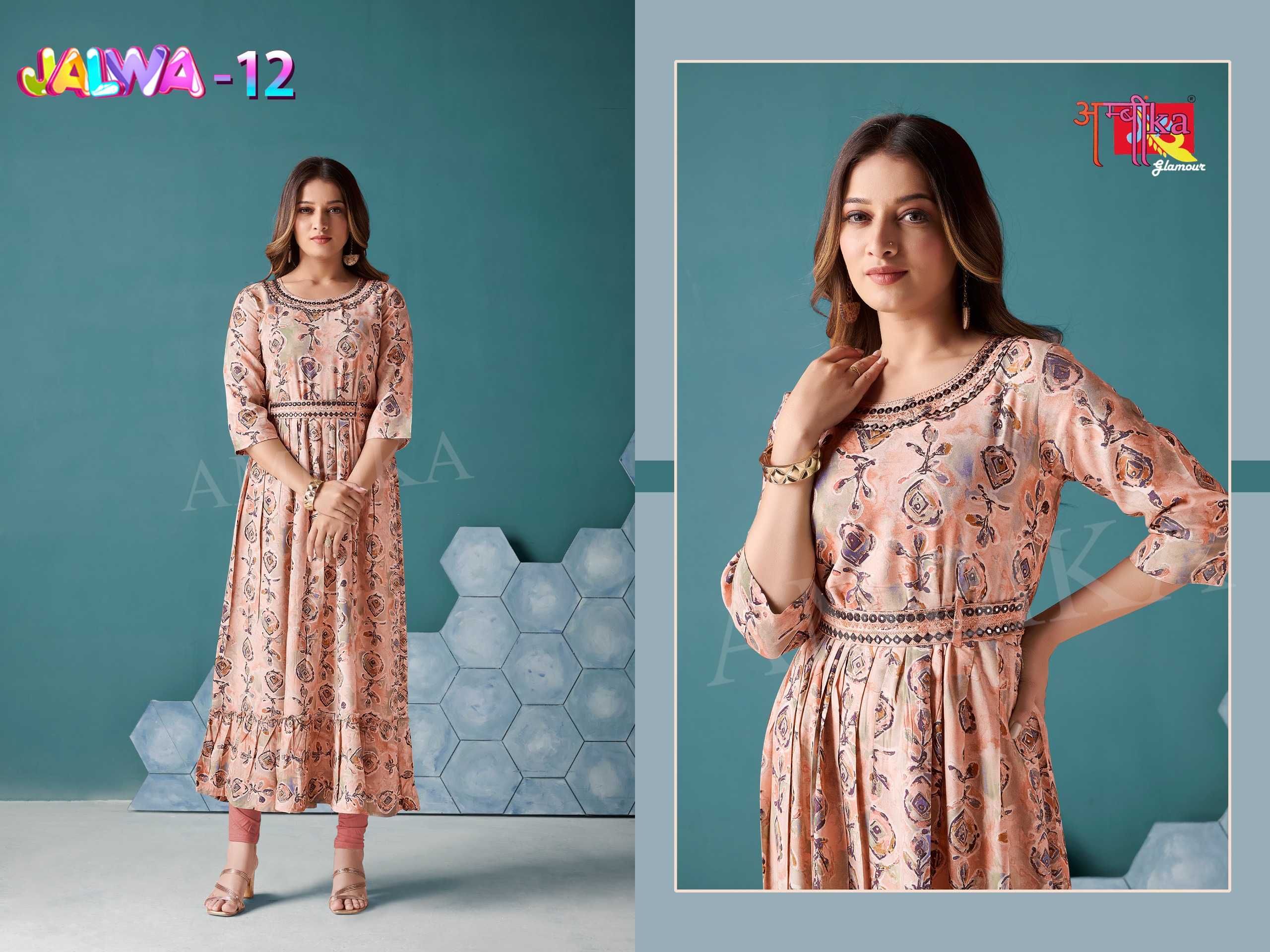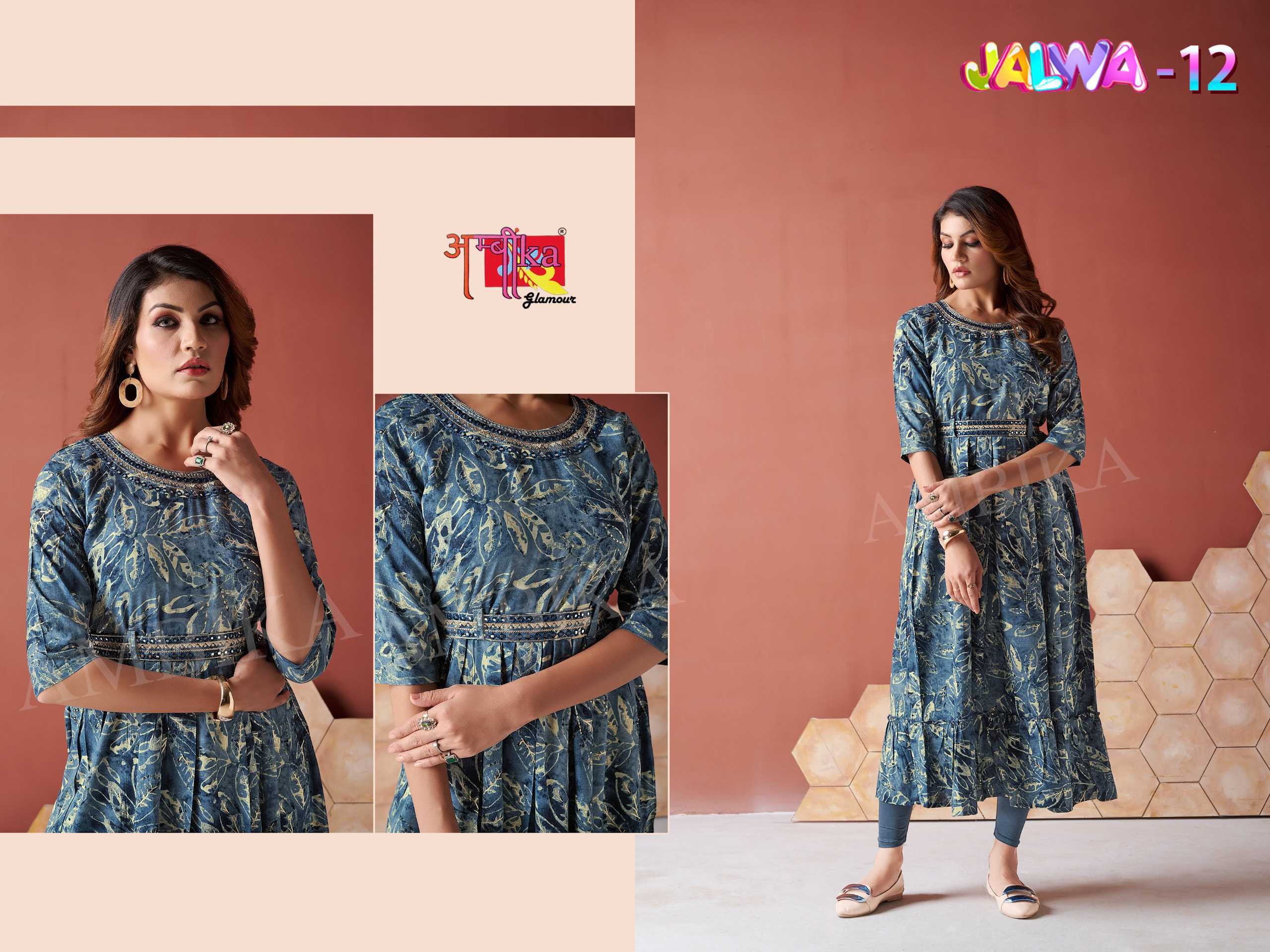 ambika kurtis jalwa vol 12 exclusive nayra full ghera with belt full stitch dress combo set