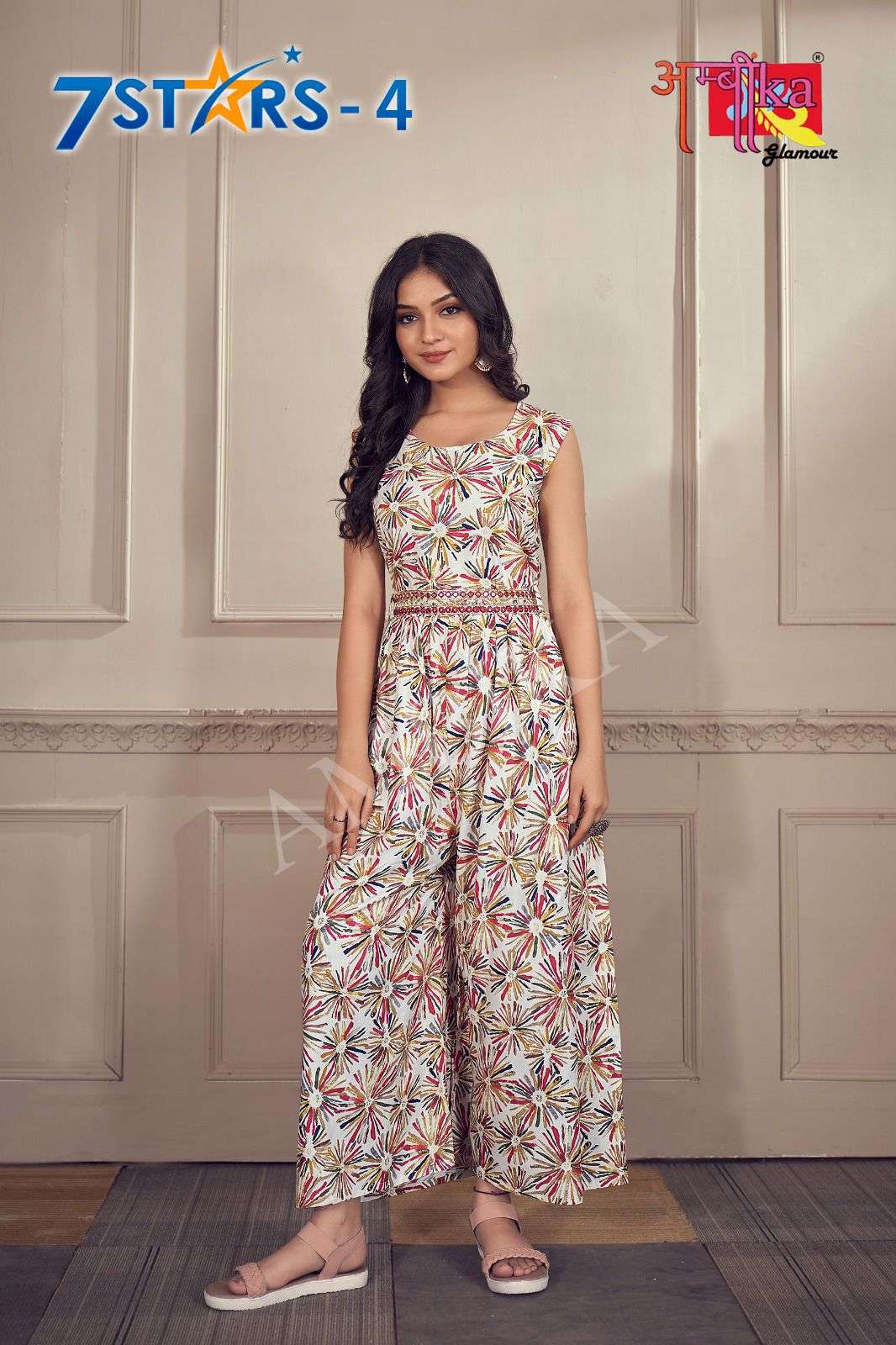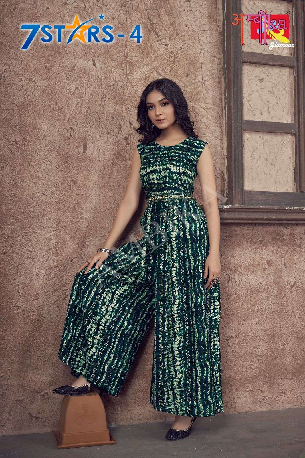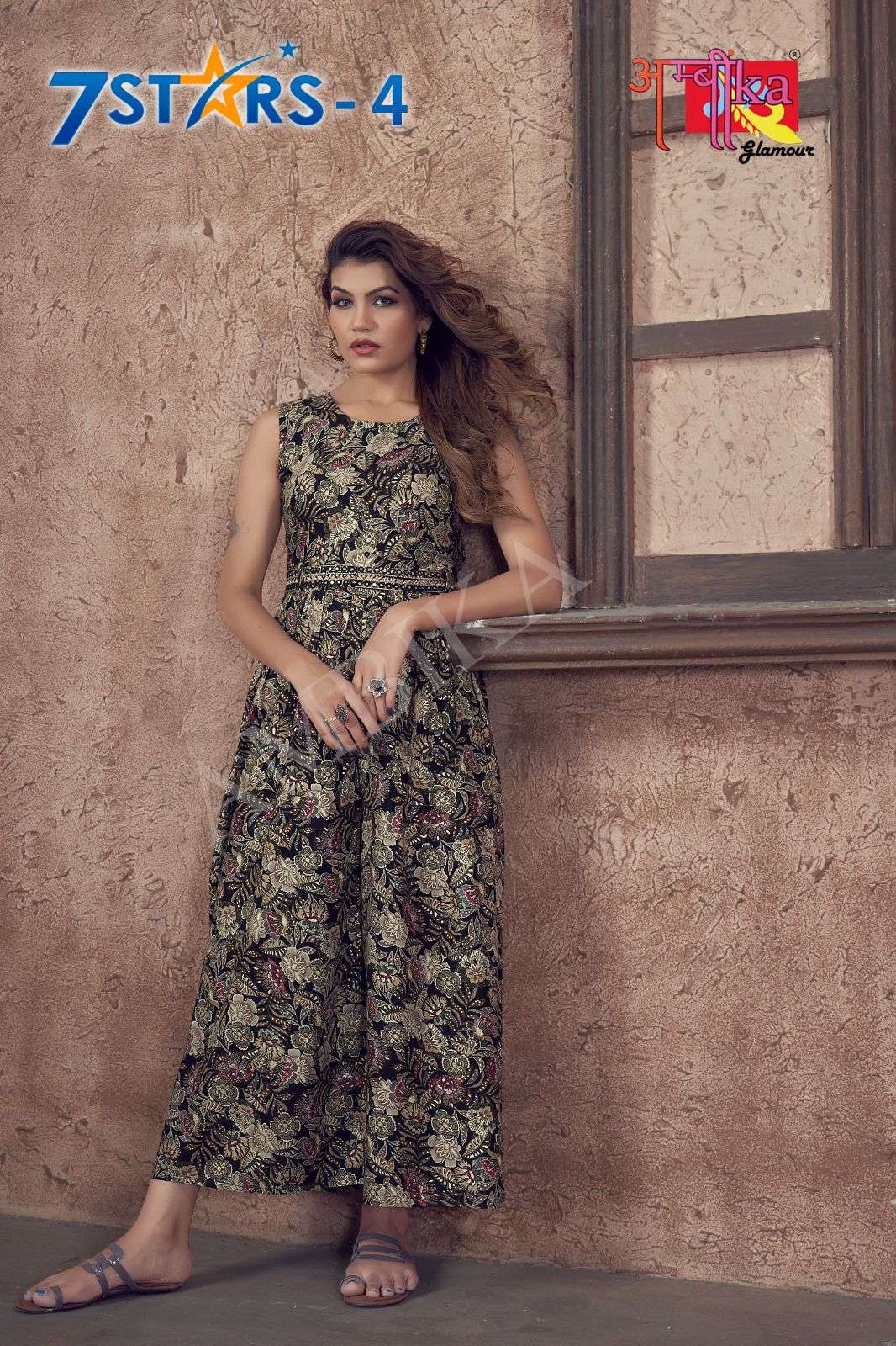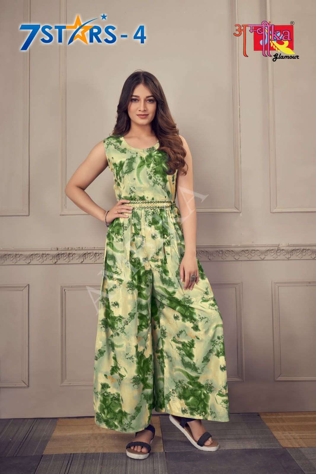 ambika kurtis present 7 stars vol 4 fancy wear jumpsuit with separate belt combo set