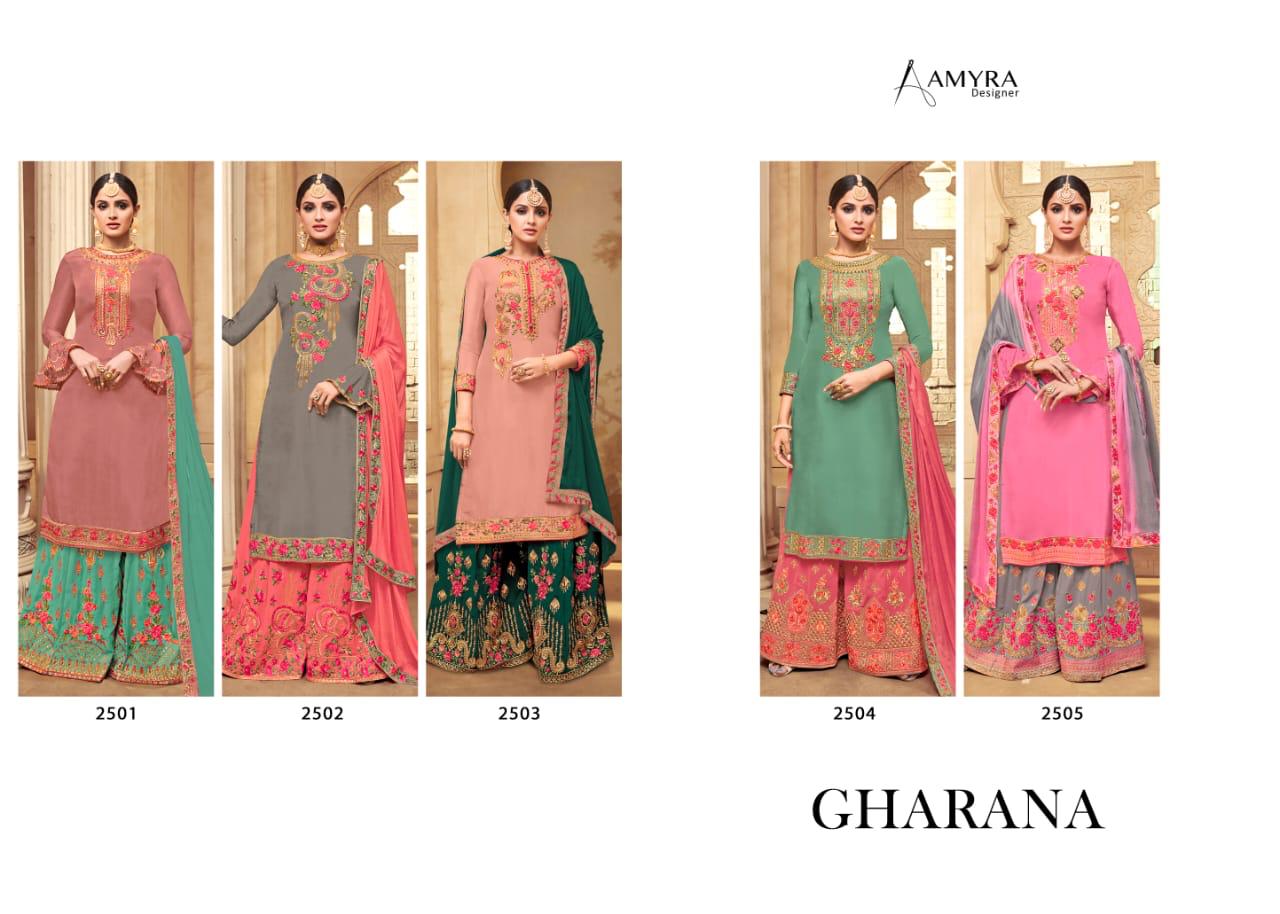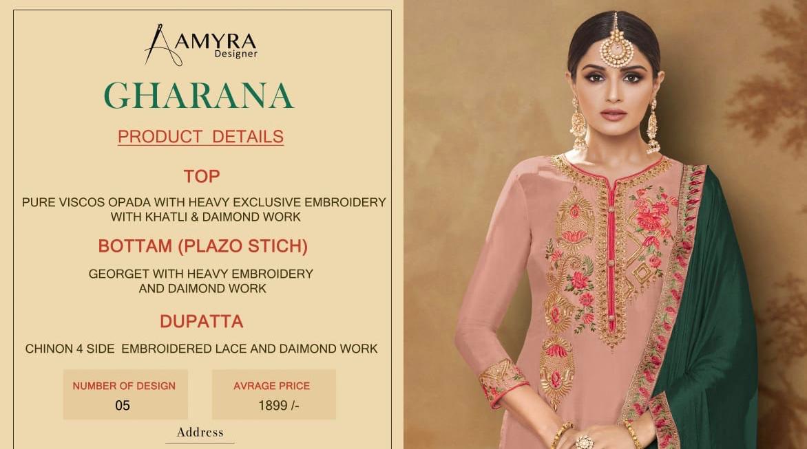 Amyra Designer.⣠Presents âÂÂà ¤Âà ¤°à ¤¾à ¤¨à ¤¾â GHARANA Top: Pure viscos OPADA with heavy exclusive embroidery with Khatli & daimond work Bottom(Plazo stich)- Georget with Heavy embroidery and Daimond work Dupatta: Chinon 4 side embroidered lace and Daimond Designs 05 Special- Rich & Beautiful colours Prize-@ 1899/-+ Gst 5 Percent Extra. Set To Set. Dispatch- 10/9/19 Book your order fast |