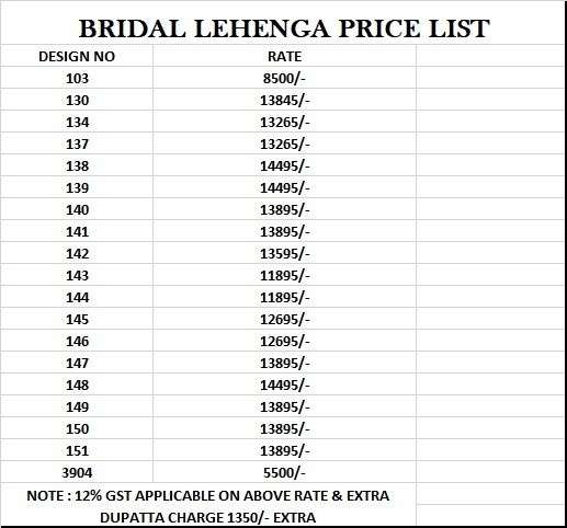 TATHASTU BRIDAL HIT LEHENGA COLLECTION BRAND : TATHASTU CATALOG : ANAARA BRIDAL WEAR RATE : ATTACHED +12% GST EXTRA LEHENGA FABRIC : HEAVY BRIDAL SILK WITH KHATLI EMBOIDERY & HEAVY WORK BLOUSE FABRIC : SILK WITH HEAVY WORK DUPPATA : NET WITH WORK EXTRA DUPATTA CHARGE 1350/- READY TO SHIP DESIGN PLS NOTE : ONLY 1 DUPATTA COME WITH LEHENGA EXTRA DUPATTA CHARGE WIL BE 1350/- |