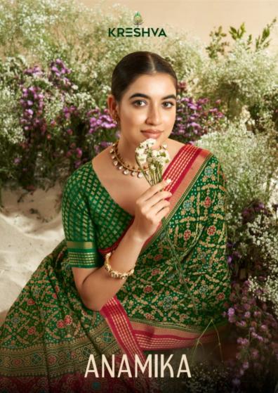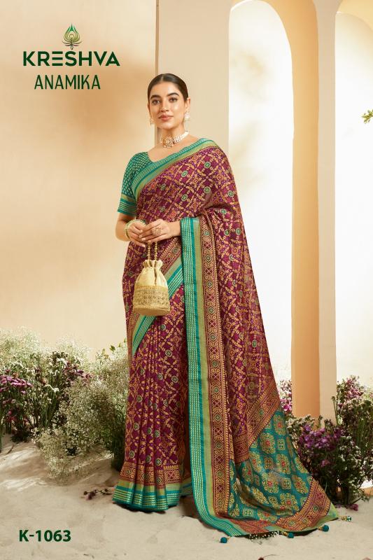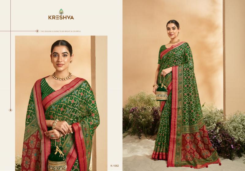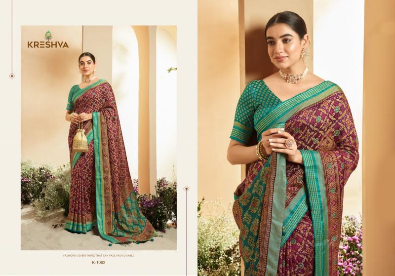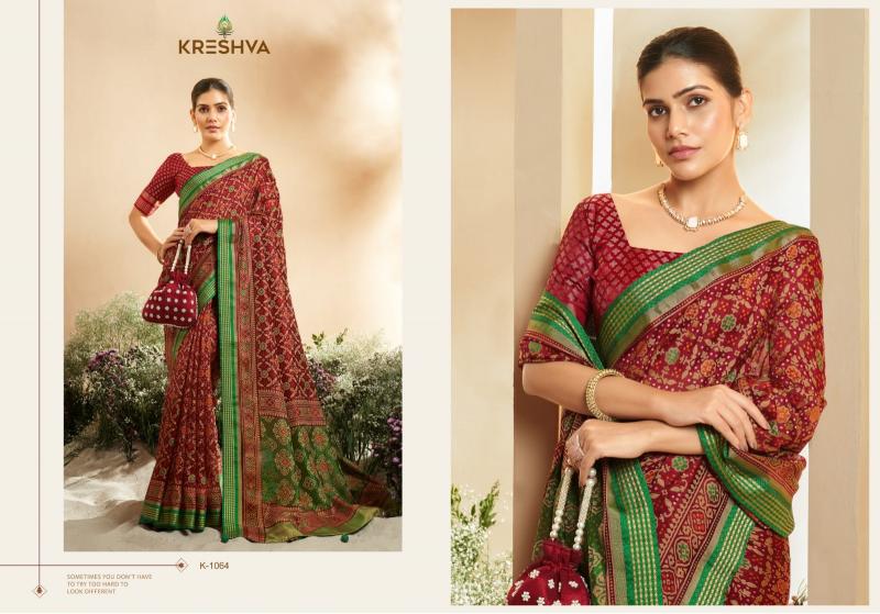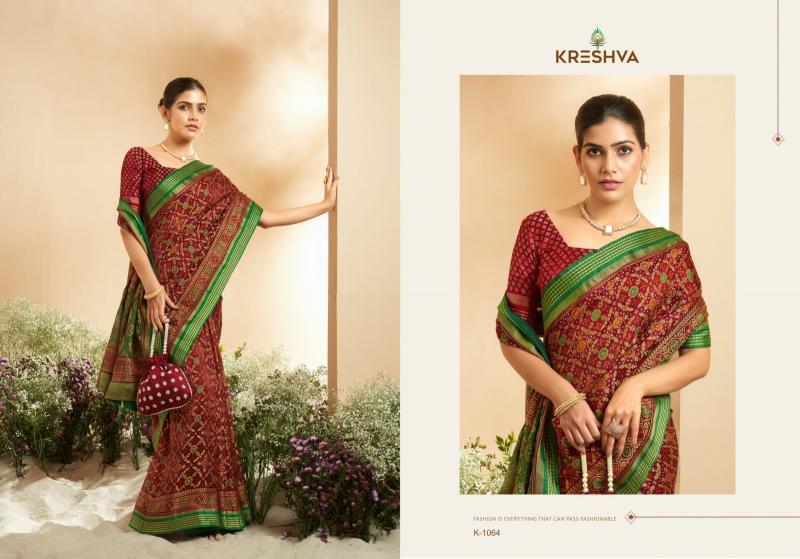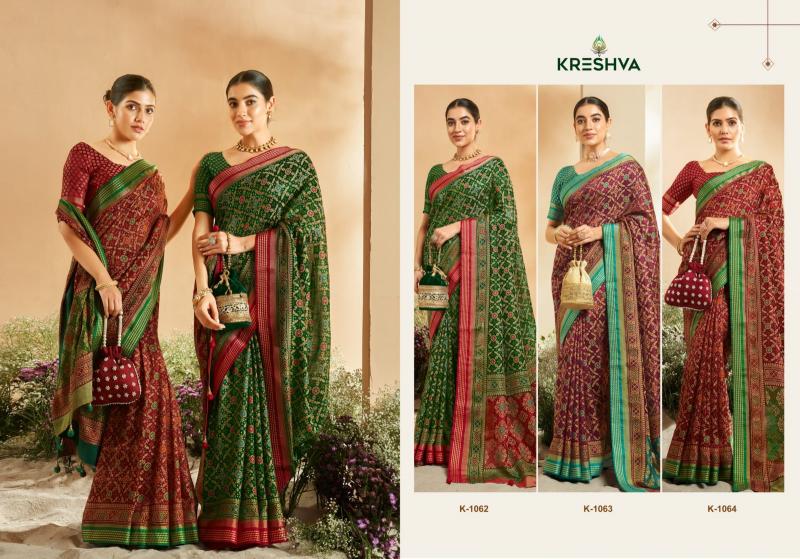 Brand : Kreshva Catalog: Anamika Series : 1062 To 1064 Saree : Lux P.V. Georgette With Burnout With Traditional Design With Warnish Soft Finish Blouse : Lux P.V. Georgette Price : 995/- +5%GST Occasion : Party Wear ,Festival Wear |
