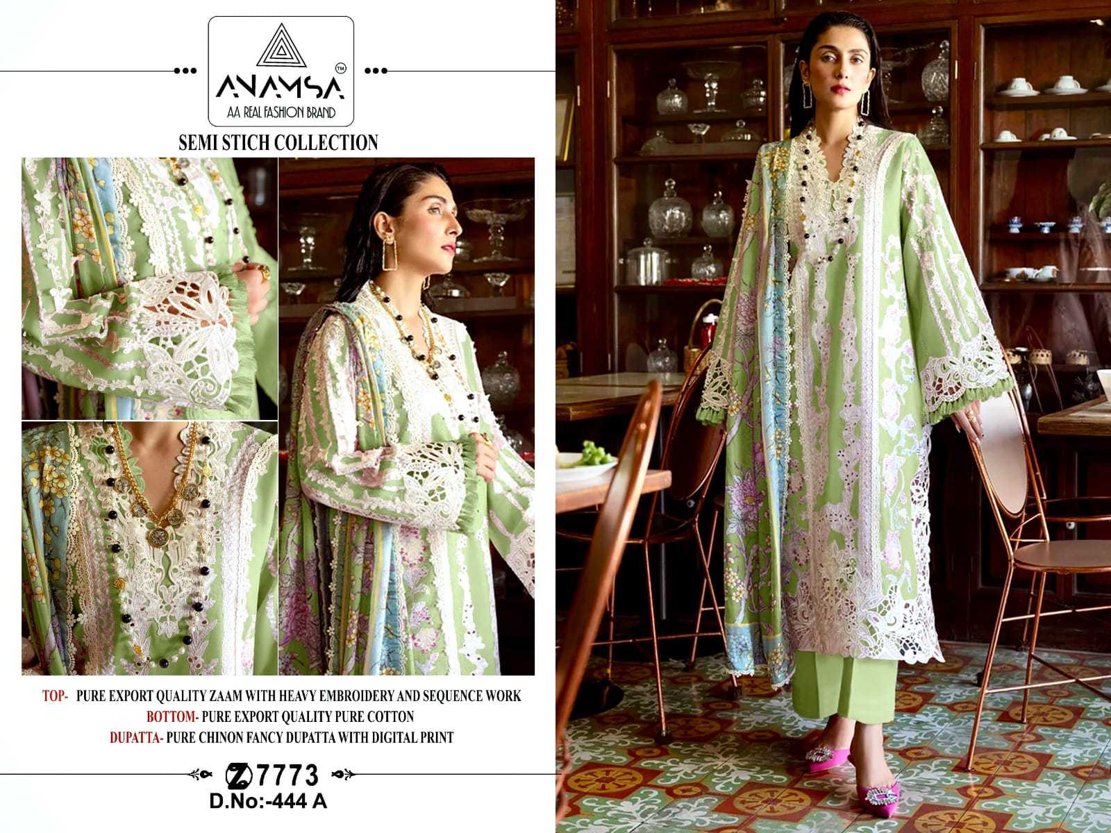 ANAMSA®️ 7773 👚 Semi Stitched *😍Anamsa-444-ANAMSA HITS BEAUTIFUL COLORS 👚 Heavy Pure Export Quality Zaam With Heavy Embroidered Very Beautiful Design And Sequence Work 🤩 Very Beautiful Semi Stitched Outfit 👖Unstitched Heavy Quality Pure Cotton 🧣 Very Beautiful Pure Chinon Fancy Dupatta With Fancy Digital Print