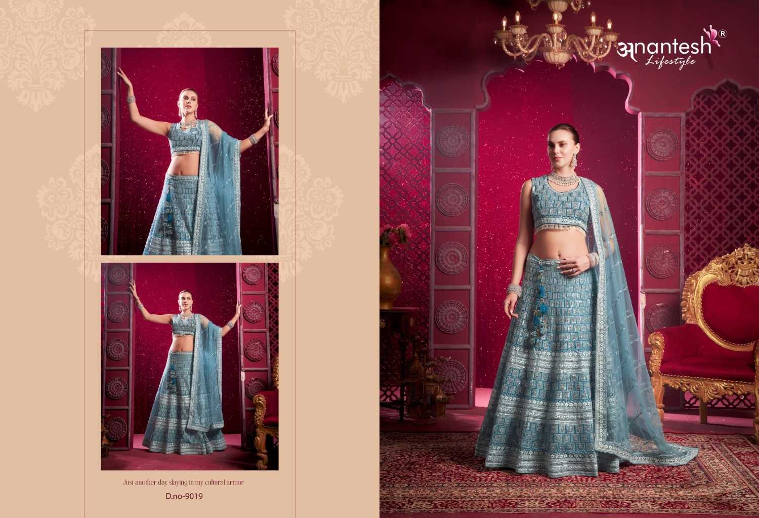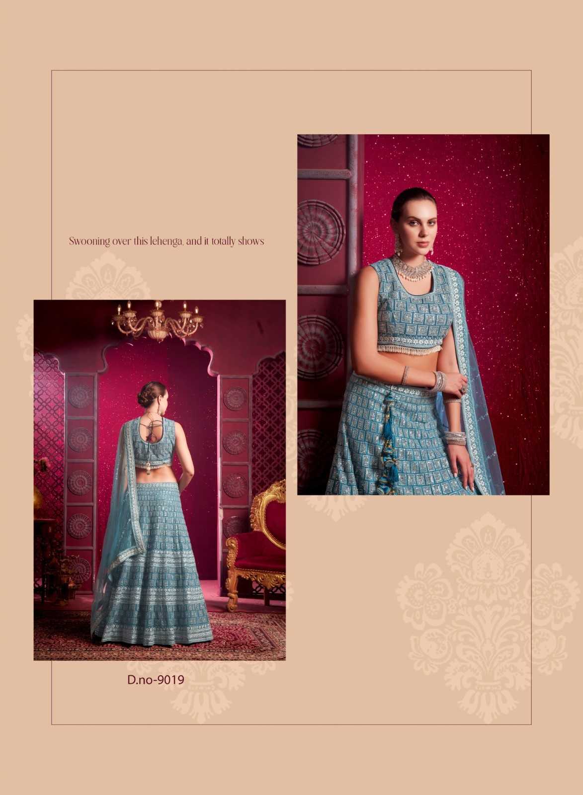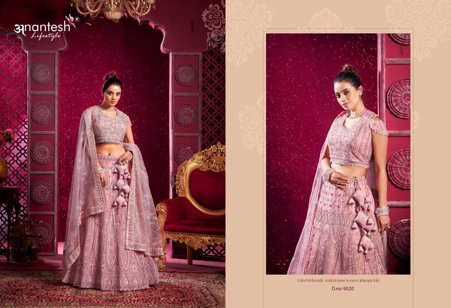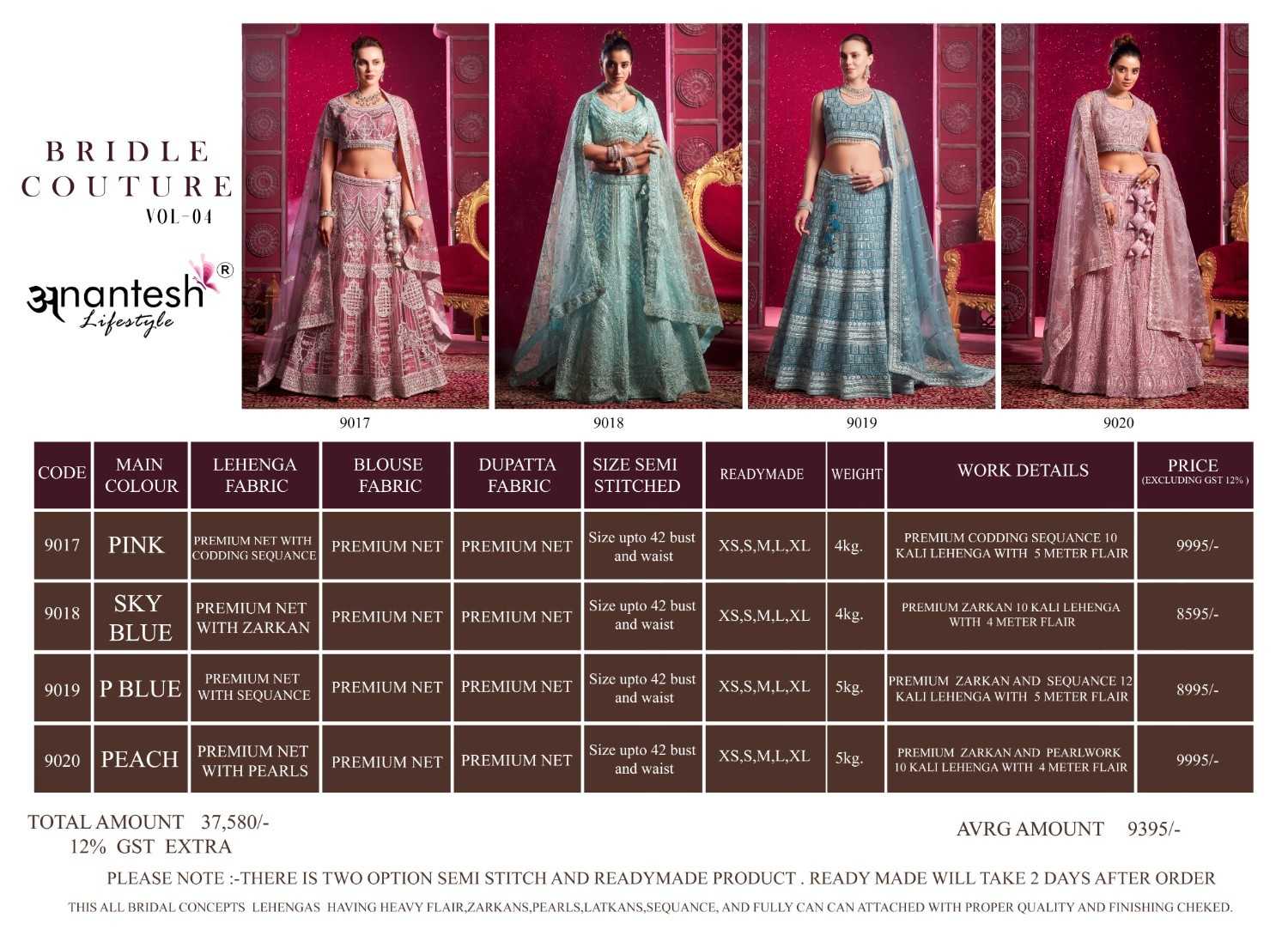 ANANTESH ®️ LIFESTYLE BRIDAL COUTURE VOL 4 SERIES 9017 TO 9020 LEHENGAS WITH BIG METER PLUS FLAIR,HEAVY LATKANS, ZARKANS,MIRROR HAND WORK,BRIDAL CONCEPT FOR ENGAGEMENT,WEDDING, SIDERS,PRE-WEDDING PARTIES RATE CARD AND FABRIC DETAILS ATTACHED GST 12% TAX EXTRA READY MADE AND UNSTICH BOTH OPTION IS AVAILABLE READ DETAILS CAREFULLY AND ORDER ACCORDING TO YOUR REQUIREMENT FULL CATLOGUE AVAILABLE |
