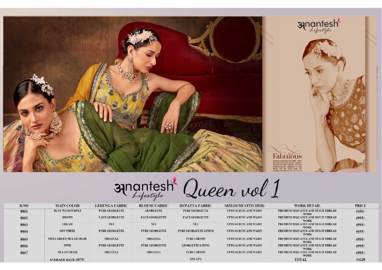 🎉 ANANTESH® 🥳 QUEEN VOL 1 🆕 SERIES 8001 TO 8007 ✨ ✅ RATE LIST AND FABRIC DETAILS ATTACHED ❤ 😅 GST 12% EXTRA ⏩ SEMI STITCHED LEHENGA CHOLIS SIZE UPTO 42 WAIST AND BUST PREMIUM SUPER GOOD QUALITY FABRIC FULL SET READY |