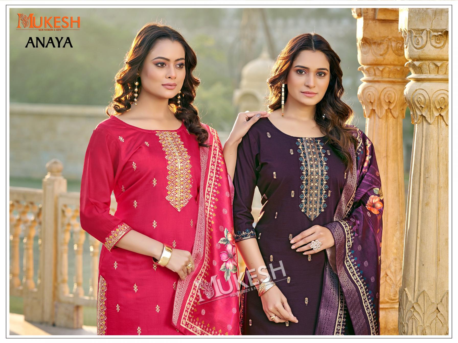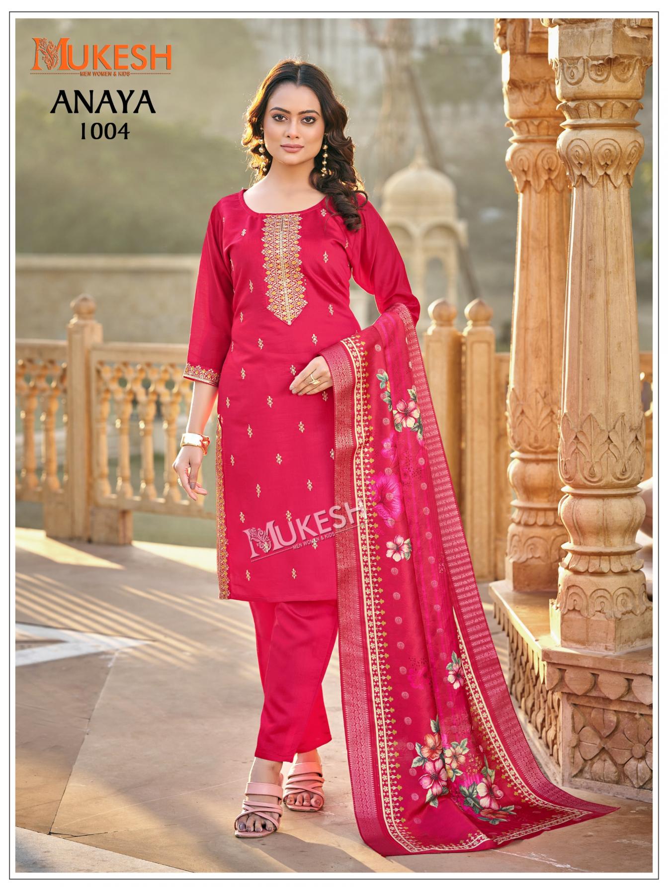Brand _ Mukesh š ANAYA KURTI + PENT + DUPATTA TOP :- GADHWAL SILK WITH HEAVY EMBROIDERY SEQUENCE WORK PENT :- GADHVAL SILK DUPATTA :- PURE VISCOSE WEAVING JAQUARD WITH DIGITAL PRINT SIZE :- M(38) L(40) XL(42) XXL(44) 3XL(46) 4XL(48) 5XL(50) Rate : 850/- per pcs GST EXTRA Set to set |