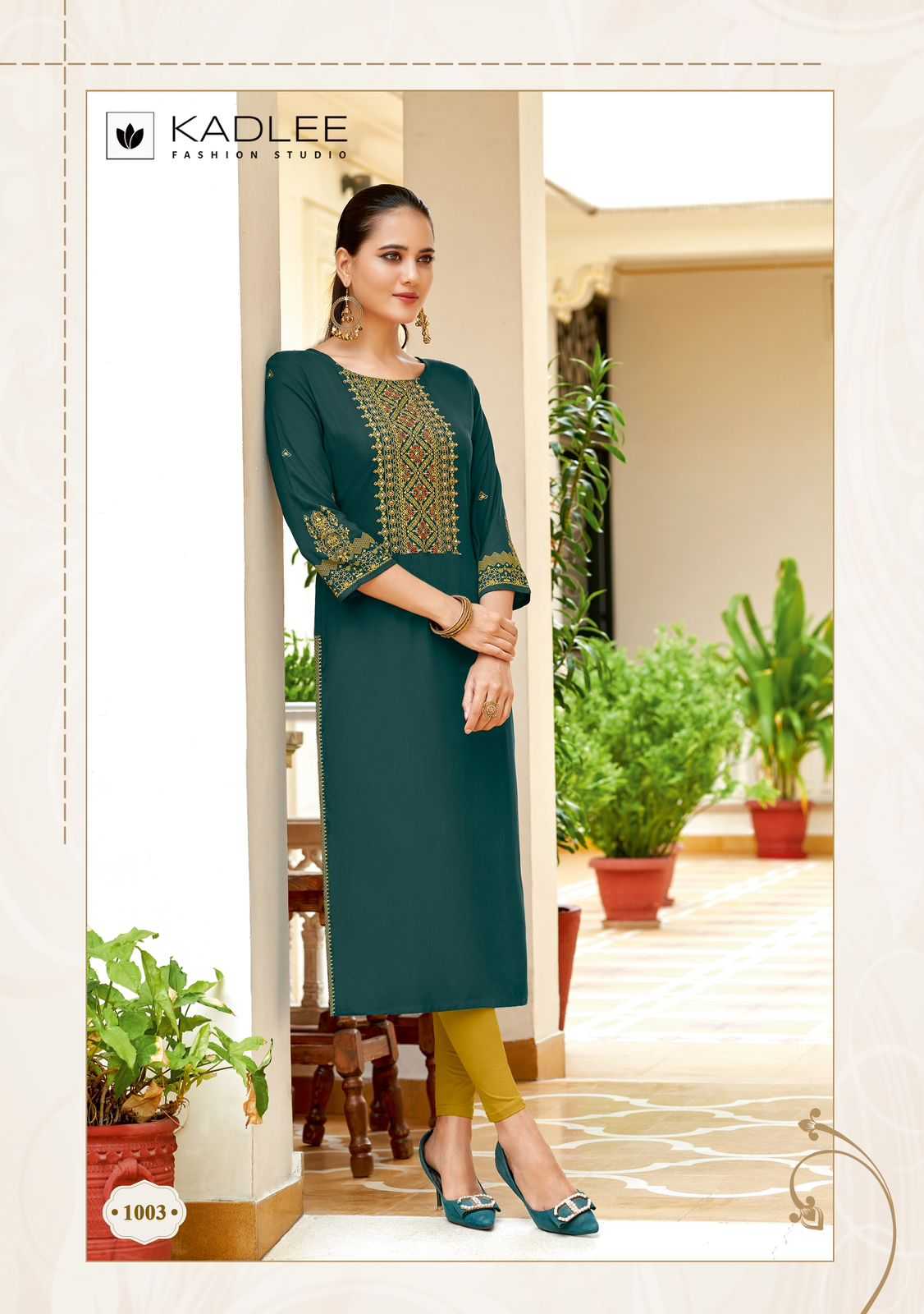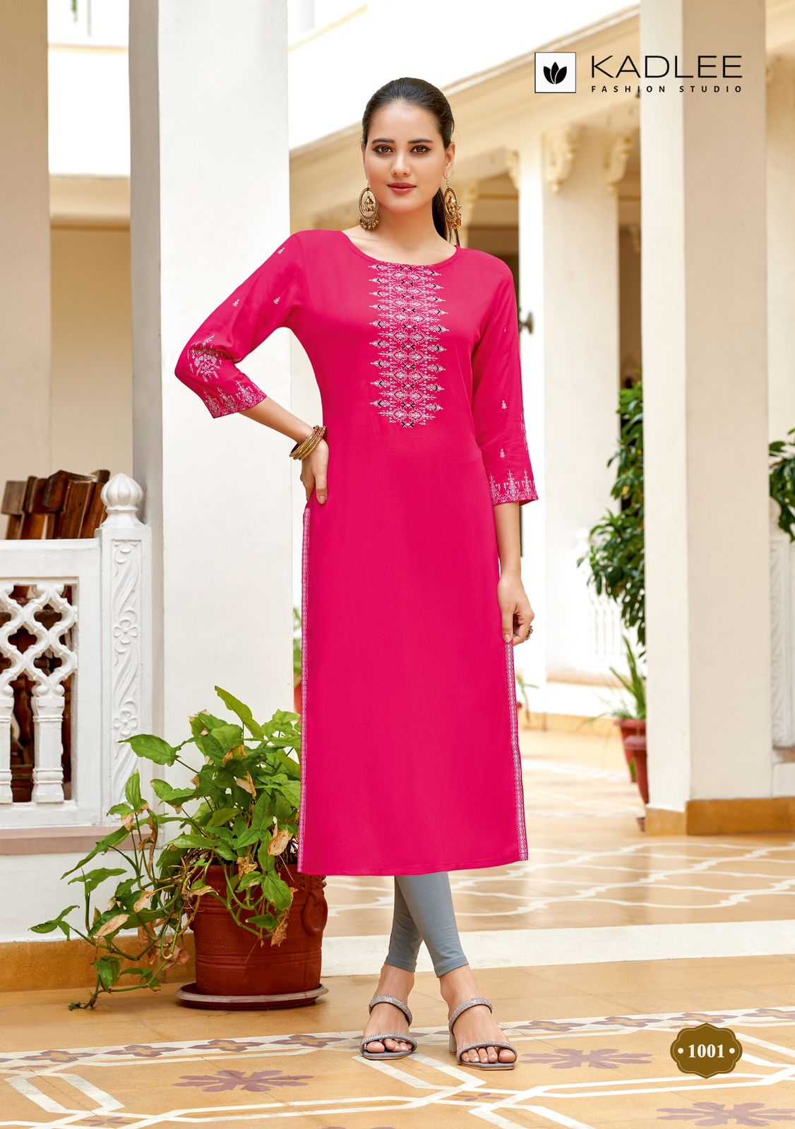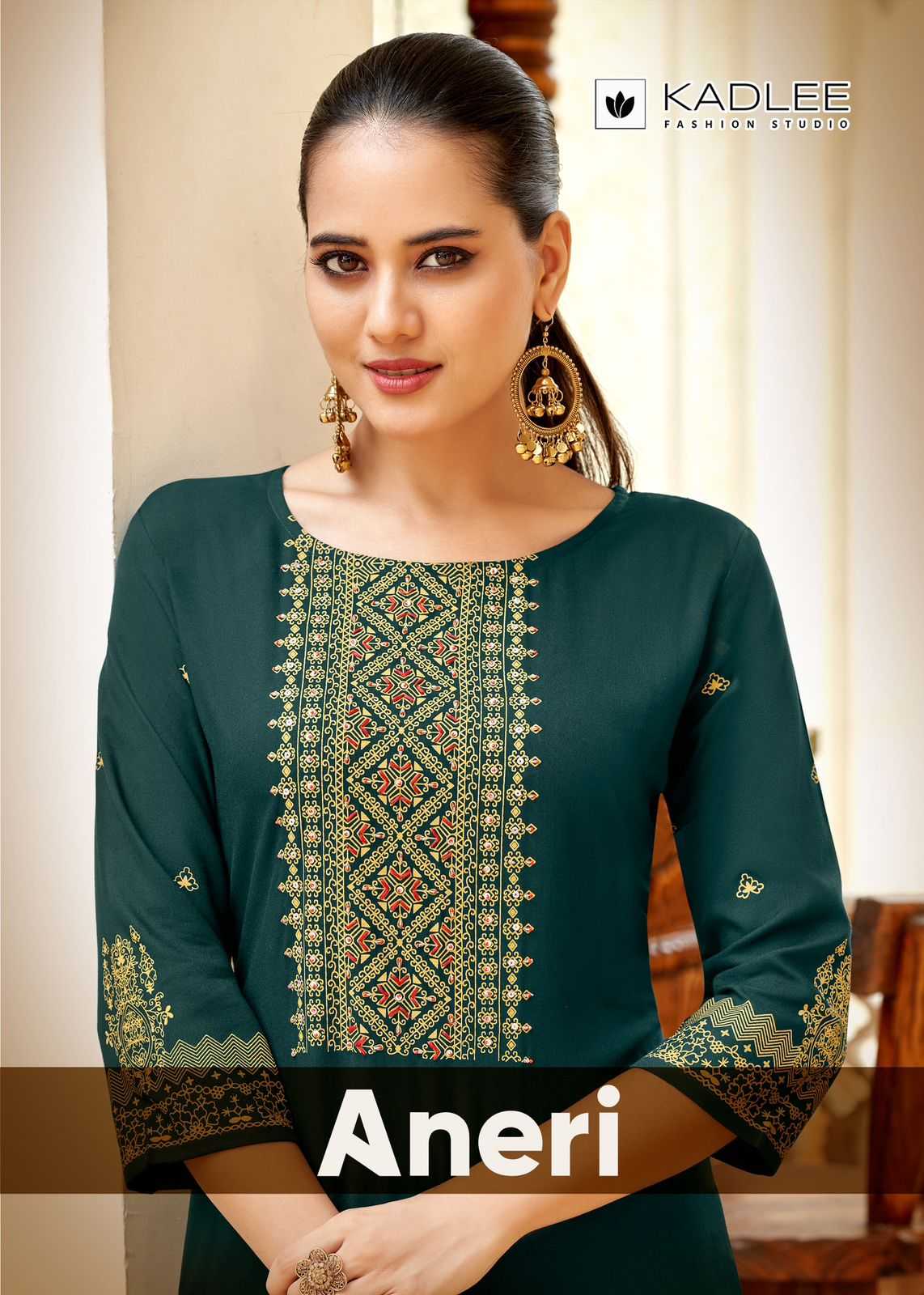 aneri by kadlee rayon casual wear full stitch thread work long kurti