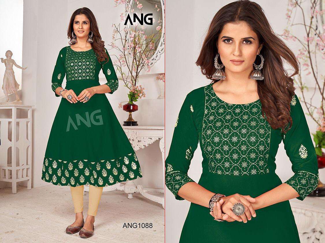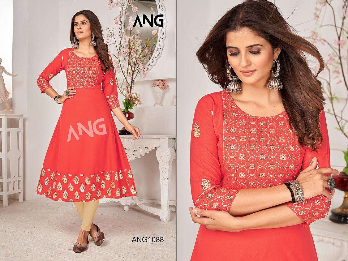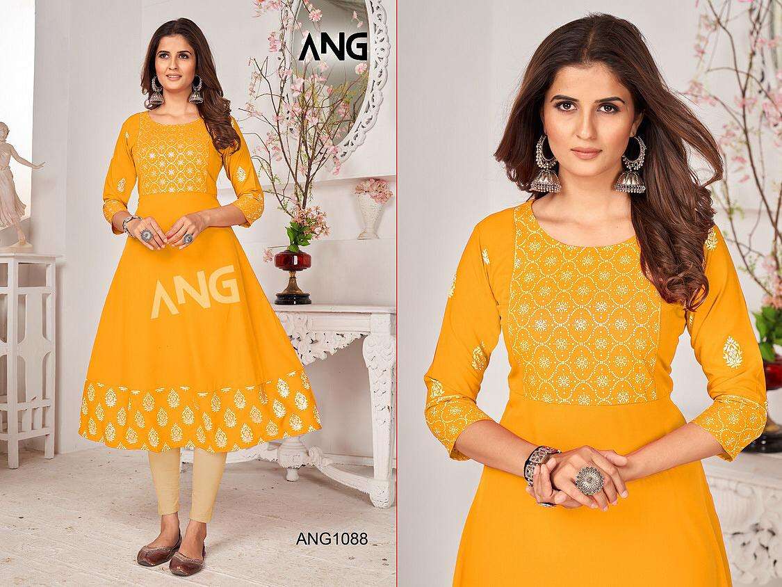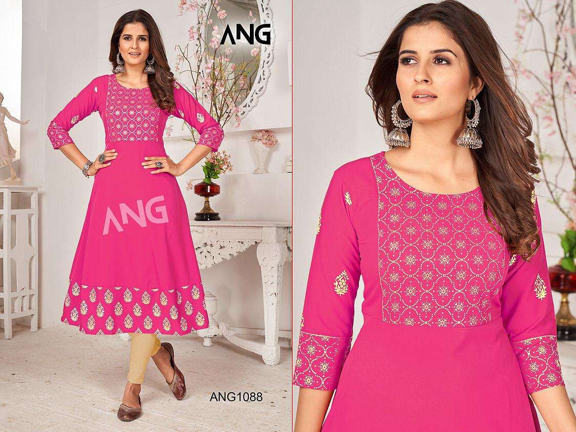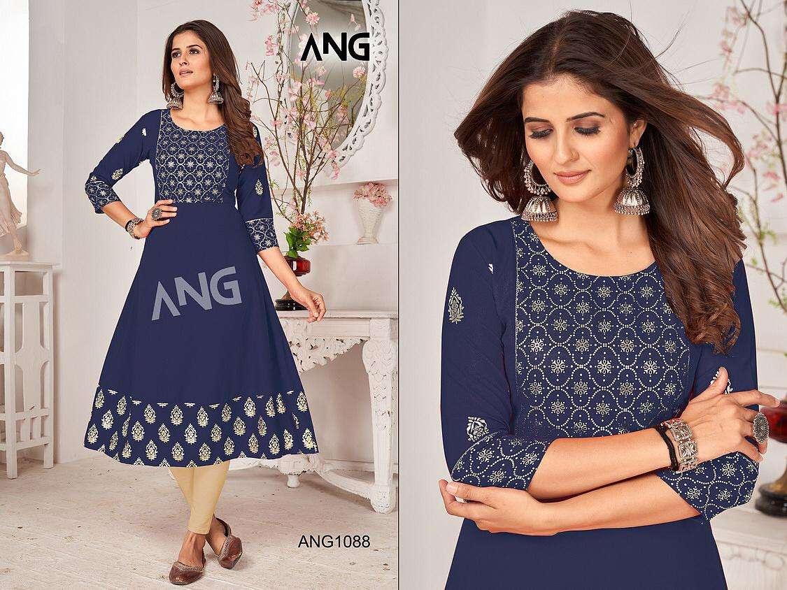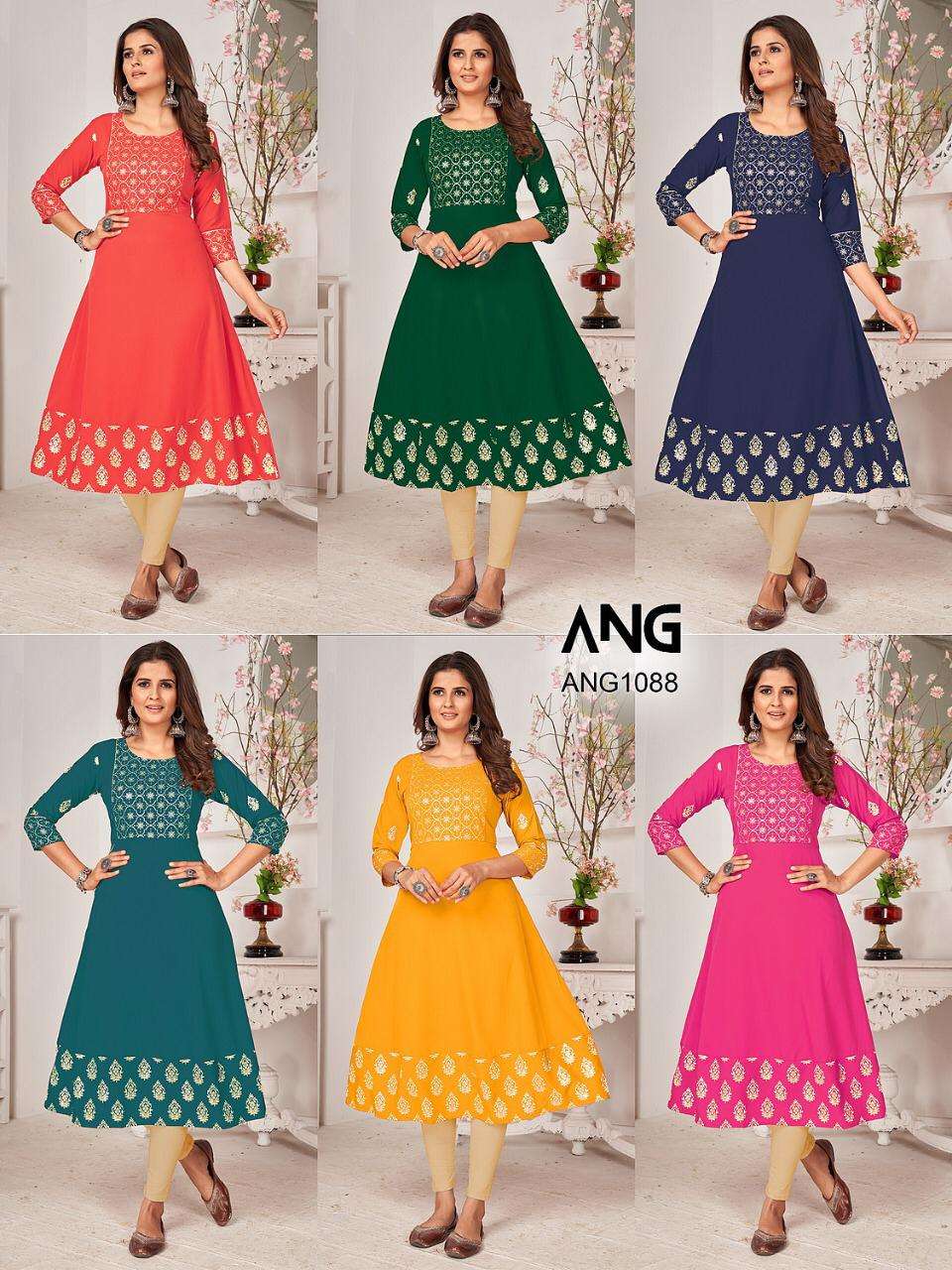 Brand Name : ANG Catalog:ANG-1088 Design : 6 piece set Top : Malai crap with Gold print Langhte: 47ins + Size : M. L. Xl. XXL. 3Xl Rate: 359/- |