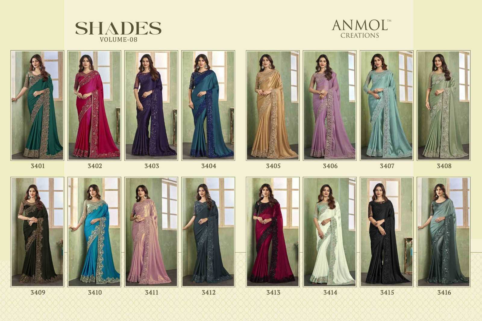anmol creation shades vol 8 3401-3416 designer wedding wear brand new sarees collection