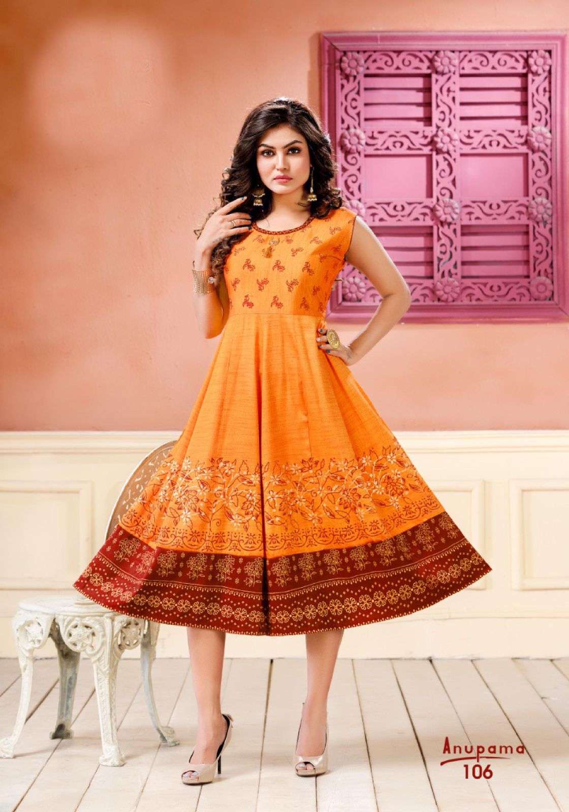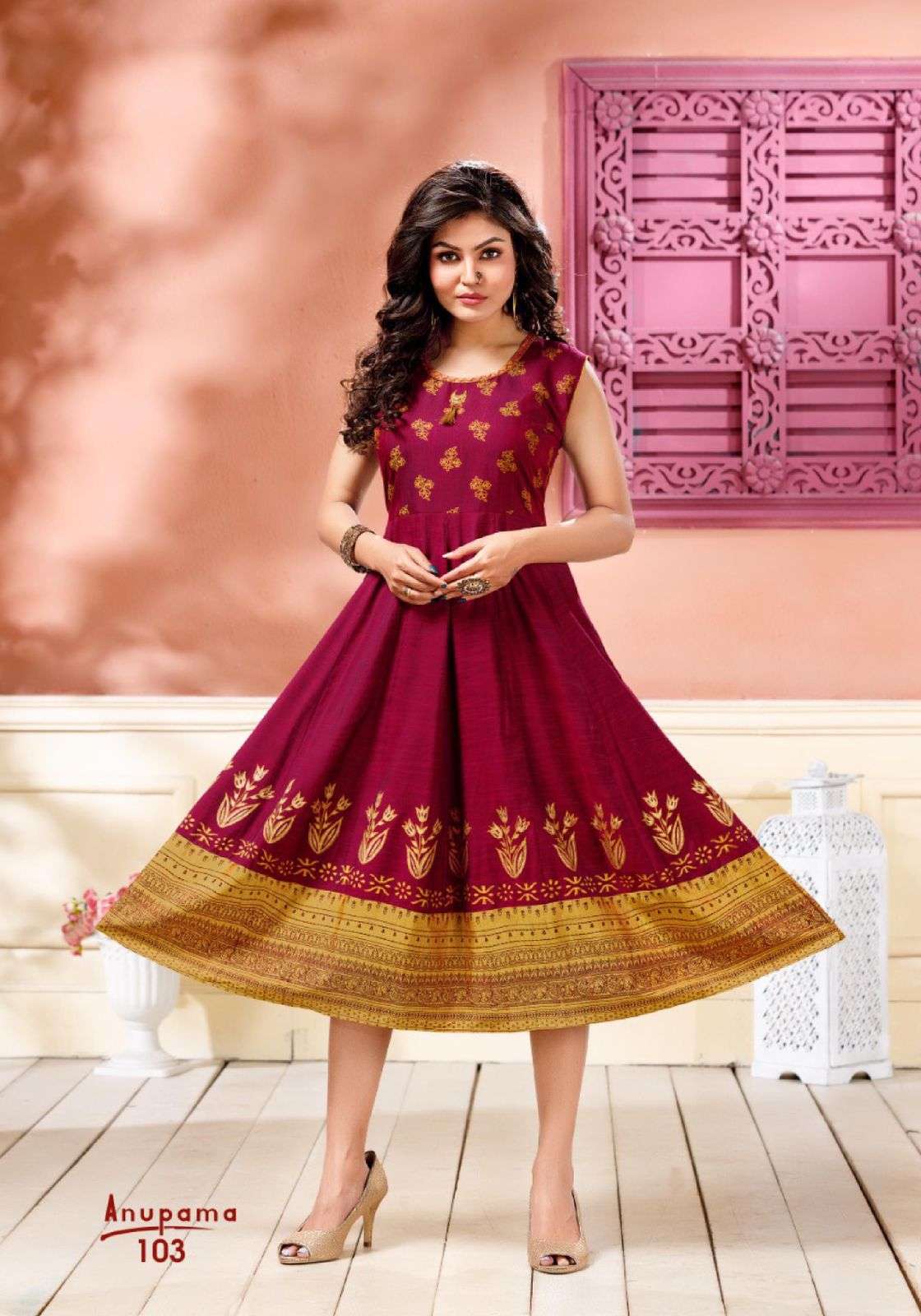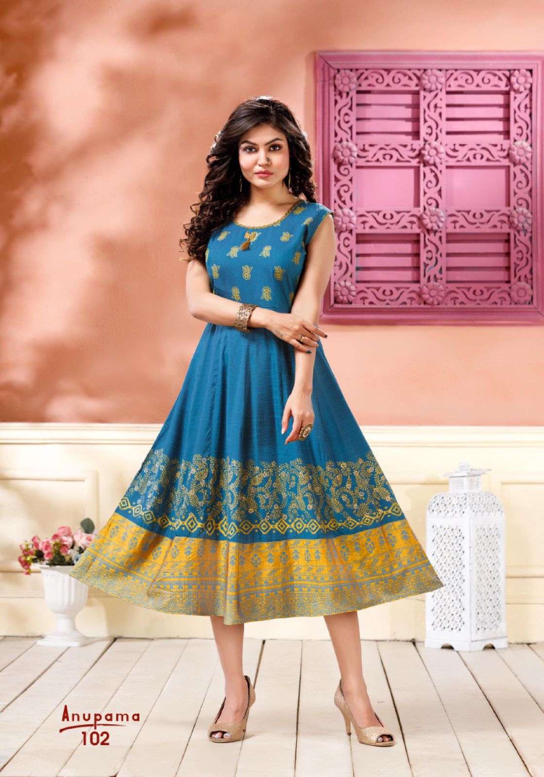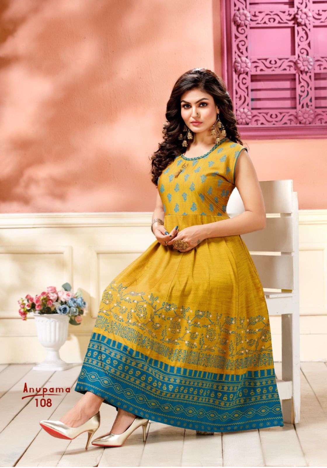 ANUPAMA HEAVY RAYON SILK FABRIC KURTI CATALOG WHOLESALER BEST RATE