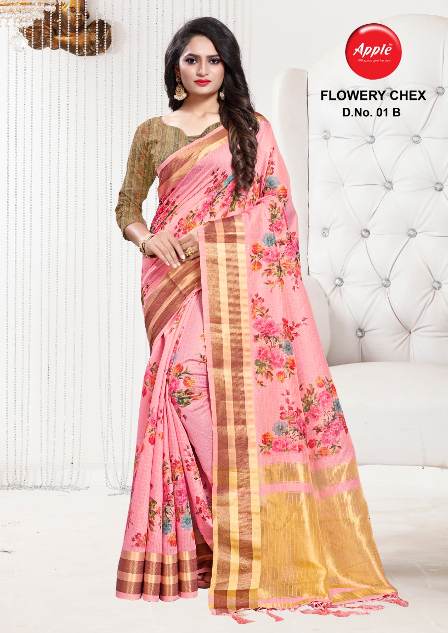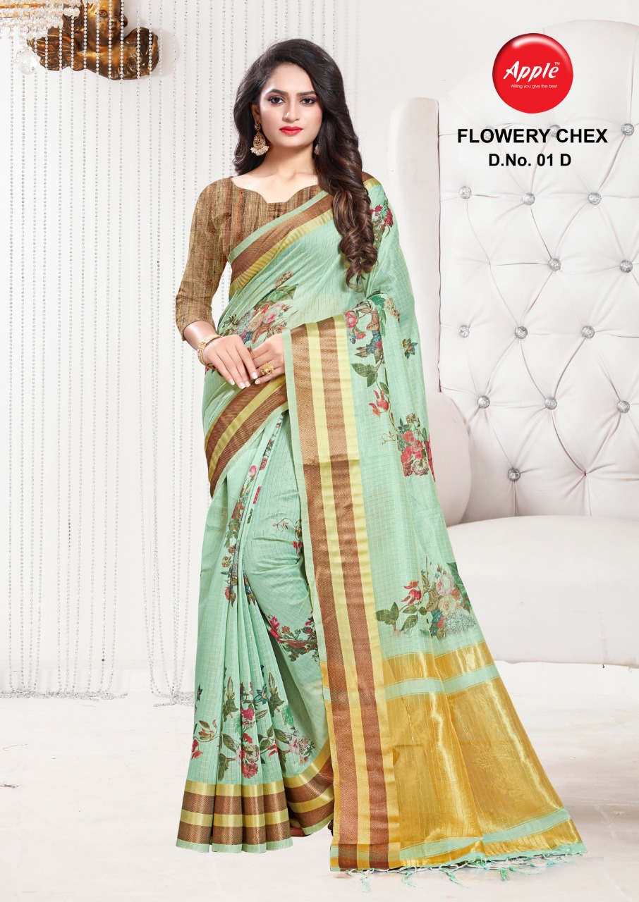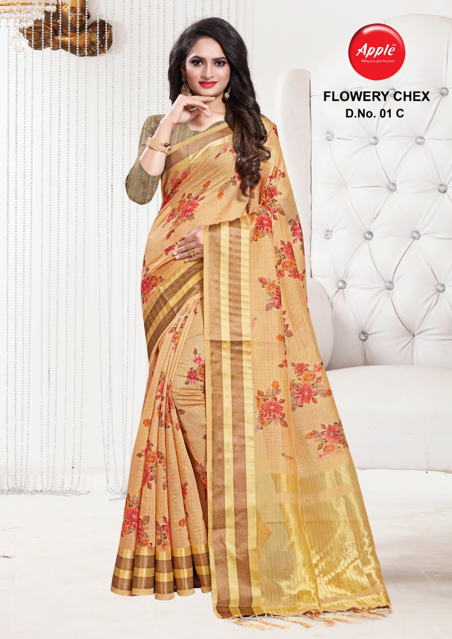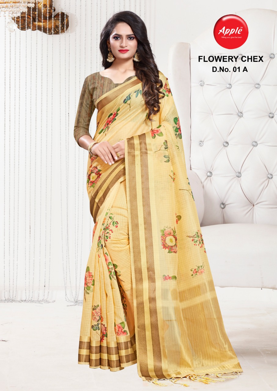 Apple Flowery Chex Cotton Digital Printed Designer Saree Wholesaler