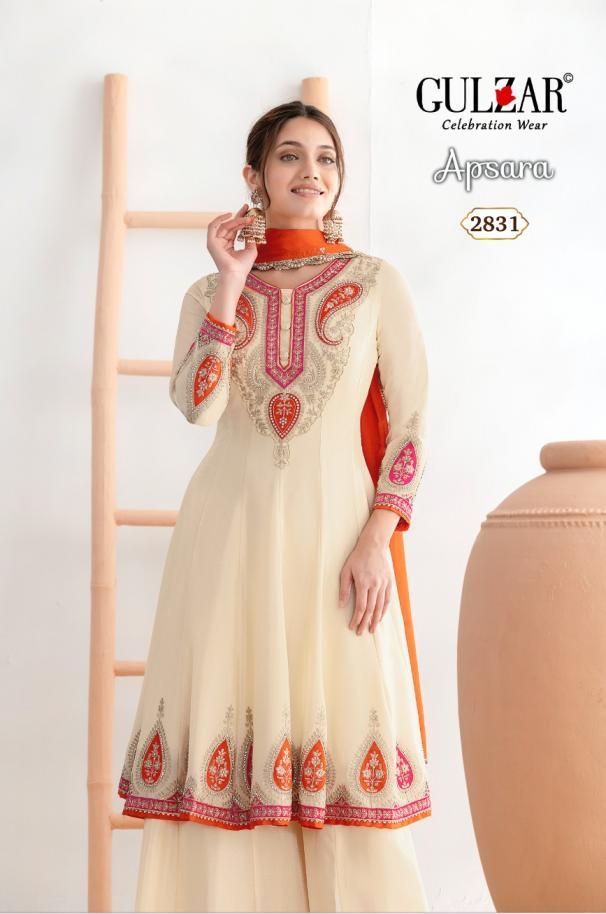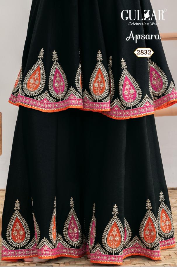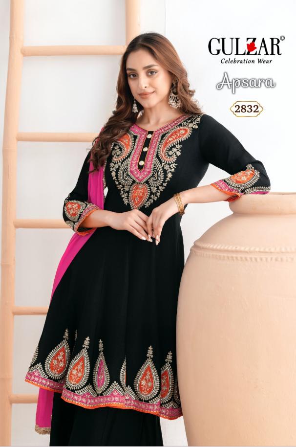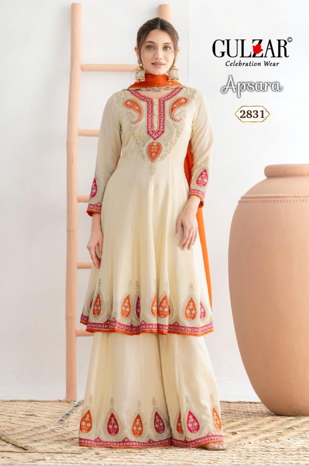 Apsara by Gulzar D.no. 2831-2832 2 colour per set Freesize Readymade Top: Premium Chinnon Kalidar Anarkali with applique style embroidery work on it Bottom: Beautiful kalidar palazzo on premium chinnon fabric Dupatta: premium chinnon dupatta with 4- side handmade moti lace Work details: Dabka zari ,applique style and swaroski work Rate : 2995/- |