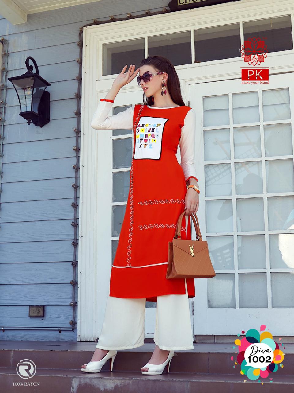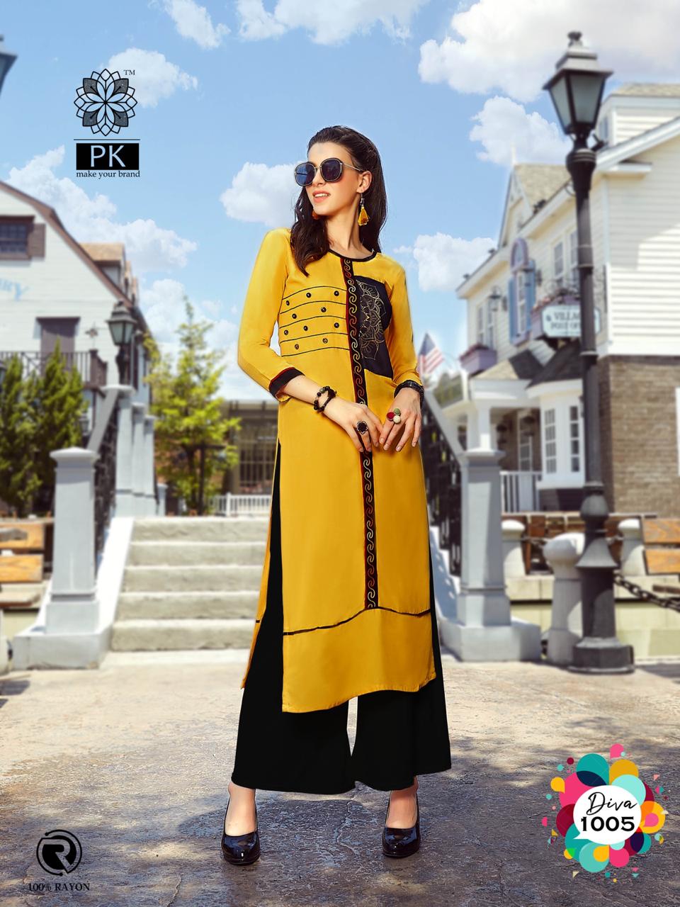 Brand - PK Catalog : FASHION DIVA VOL 1 Fabric : Heavy Rayon with work & Digital Print Sizes - M(36), L(38), XL(40), XXL(42), 3XL(44) Designs - 7 Rate - 310 Rs + 5% GST Dispatch Date - 03/08/2020 -: Thanks : - ARADHNA |