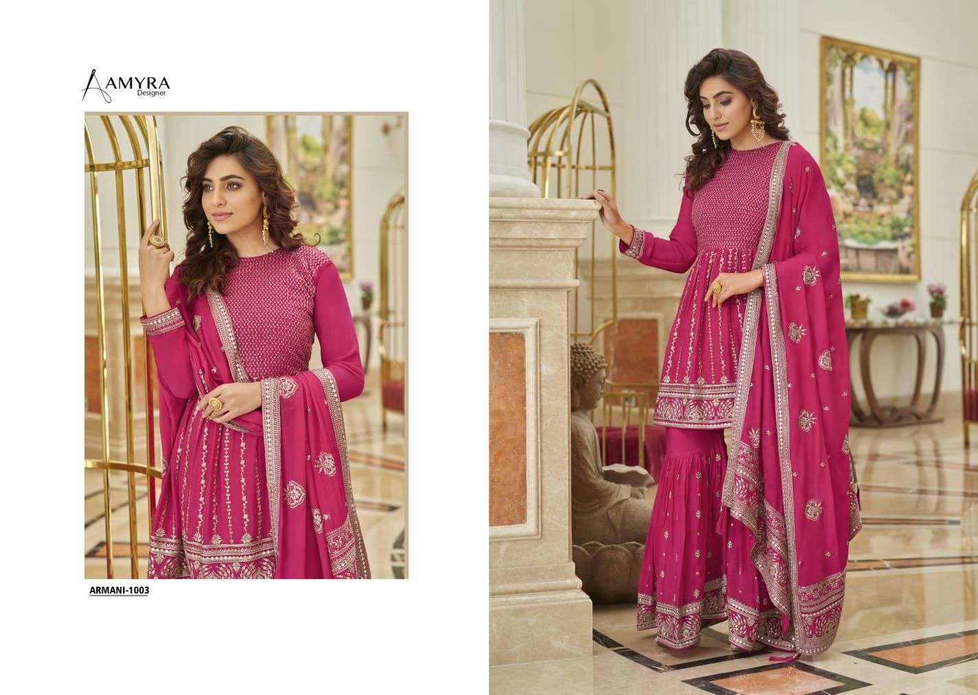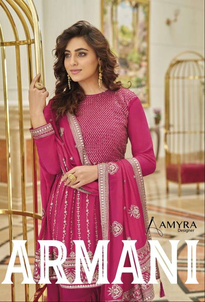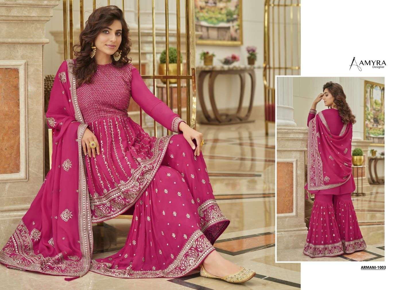 Amyra Designer Karva chouth special Armani Fabrics detail Top:-Heavy Chinon with exclusive embroidery Bottam(Garara) Heavy chinon with front back embroidery Dupptta:- Heavy chinon with heavy embroidery No of designs -03 Special Bridal colour Rate-2599/- Gst extra |