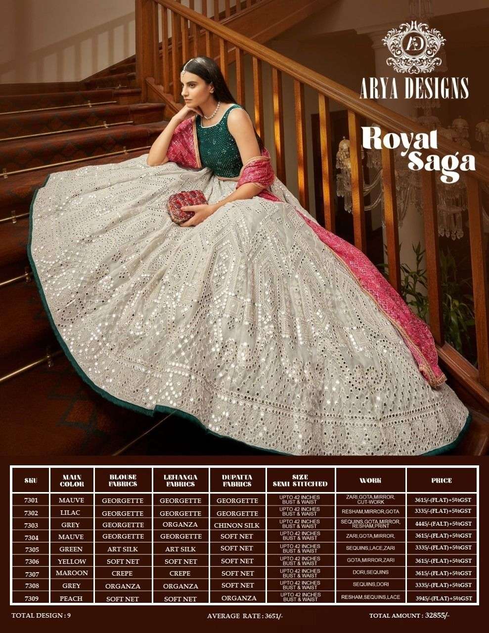 Brand - Arya . Catlog name - ROYAL SAGA . Series - 7301 to 7309. SET TO SET Delivery 2/3 days |