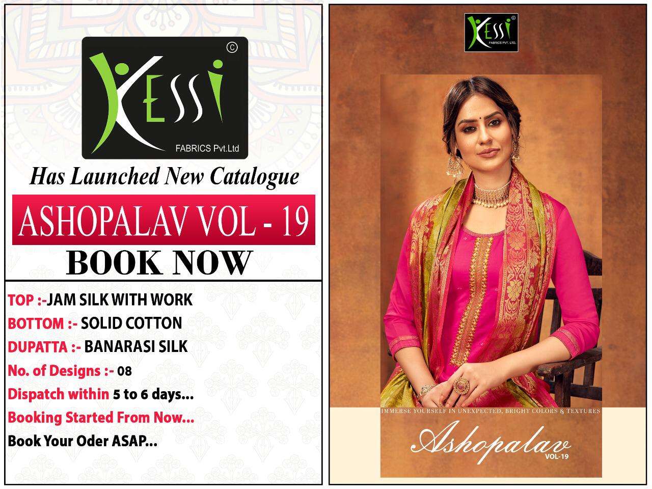 Kessi Fabrics Pvt. Ltd.  has launched  Catalog name:  ASHOPALAV vol 19 Fabric Details Top:- Jam Silk with Embroidery Work Bottom:- Cotton Silk Dupatta:- Banarasi Silk Total Design:- 8  Rate - 899/- Set to set Dispatching 5 to 6 days later |