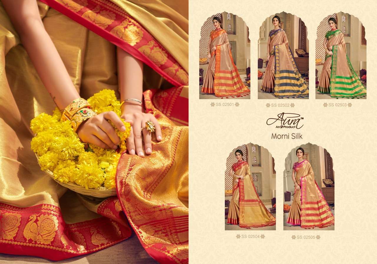 AURA PRESENTS ITS LATEST DESIGNER SAREE CATALOGUE MORNI SILK SILK FABRICS Cut-6.30 Mtrs 05 PC CATALOG 1130/- Rate + 5%GST APPLICABLE SET TO SET ONLY DELIVERY 3-4 days |