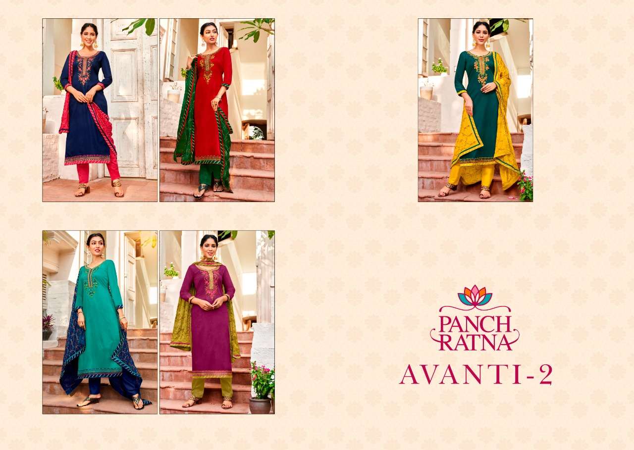 Panch Ratna  has launched  Catalog Name:  AVANTI-2 Fabric Details Top:- Cottan Satin Work With Hendwork Bottom:- Cottan Dupatta:- Chinon Work With Four Side Border Total Design:- 5  Rate- 699 per pcs : Set to set Dispatching 5 to 6 days later |