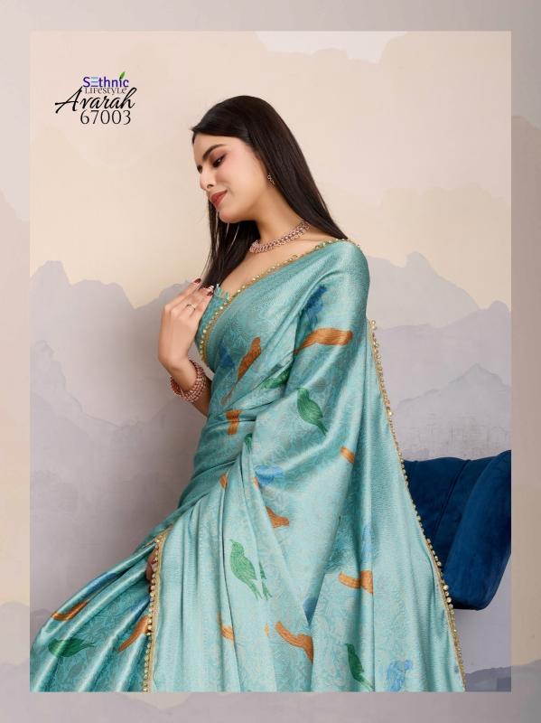 A statement partywear saree collection in exquisite double mysore brocade silk. Paired with a regal brocade butta blouse, enhanced with fancy stone work lace and designer tassels for a majestic allure. Brand - Sethnic Lifestyle Catalog : Avarah Series : 67001 To 67004 Saree Fabric Detail : Double Mysore Brocade Silk with Rich Stone Work Lace & Designer Tassles Blouse : Brocade Royal Butta Base with Sleeve Lace Rate : 1199/- Gst 5% extra Style : Party Wear, Festival Wear |