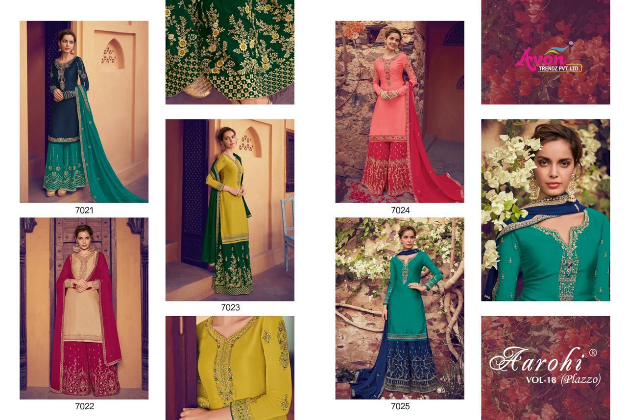 AAROHI VOL-18 ( PLAZZO ) Satin georgette with embroidery work with fancy diamond work plazzo with georgette fancy lace work Dupatta Price- 2295/- Pc - 05 Delivery 5-6 Days |