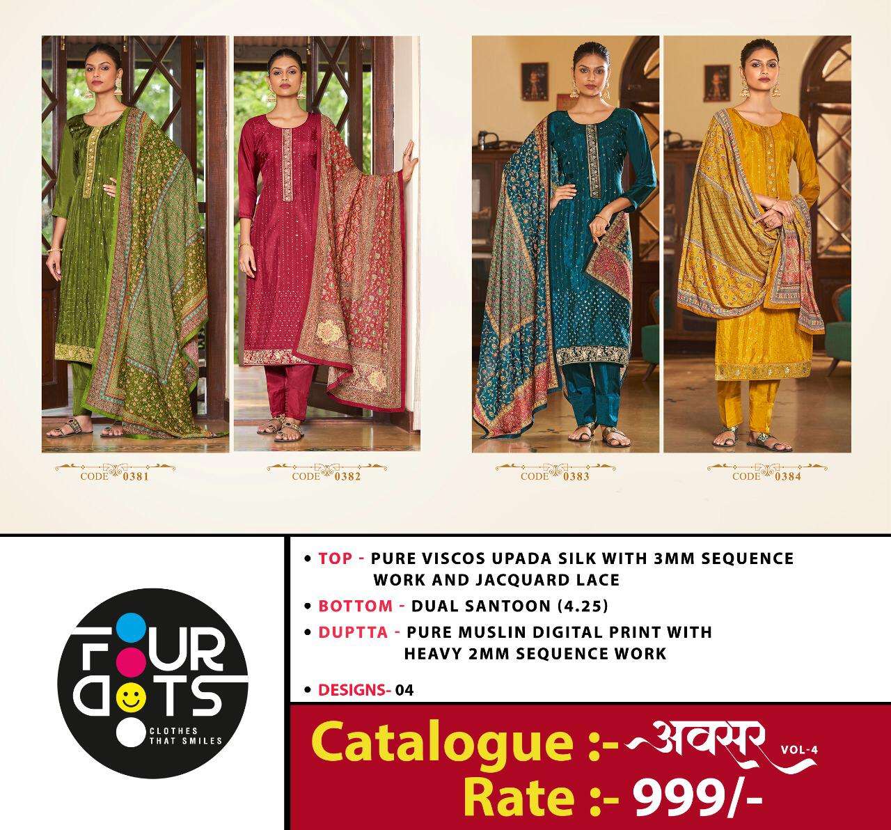 * FOURDOTS  has launched  Catalog name :  * AVSAR VOL-4 * Fabric Details Top:- Pure Viscose Upada Silk With 3MM Sequence Work And Jecquard Lace Bottom:- Dual Santton (4.25) Dupatta:- Pure Muslin Digital Print With Heavy 2MM Sequence Work           Total Design:- 4  Rate:- 999 per pcs . Set to set. GST 5 Percent Extra Dispatching 5 to 6 days later |
