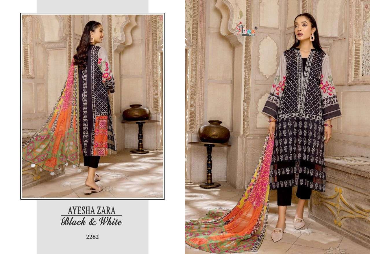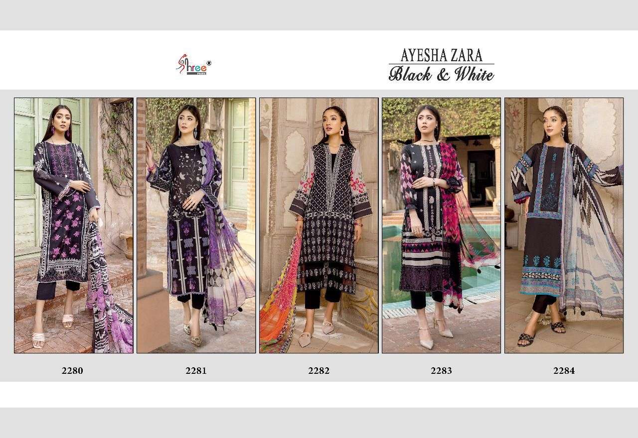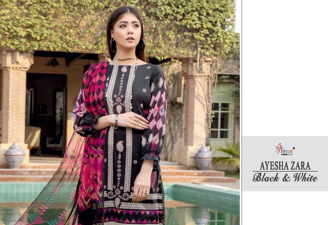 AYESHA ZARA BLACK & WHITE TOP PURE COTTON PRINT WITH PATCH EMBRODERY BOTTOM SEMILAWN DUPPTA SILVER/ COTTON DESIGNS 5 RATE 599+gst SIFFON 650+gst COTTON SHREE FABS SURAT®️ |