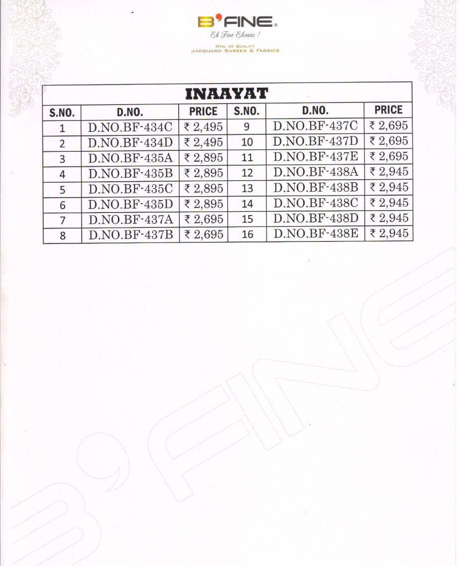 Brand. - B FINE . Catlog name - Â INAAYATÂ Fabric- Silk . ONLY FULL SET PRICE LIST HAS ATTACHED GST 5 Percent Extra. Delivery from today |