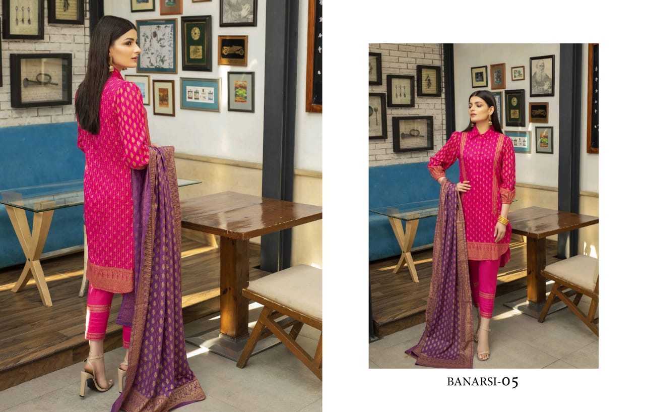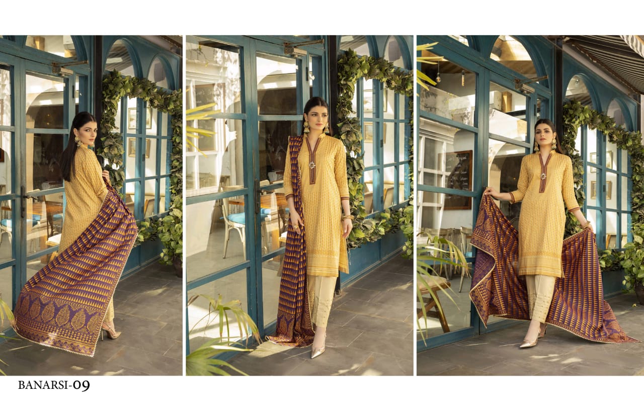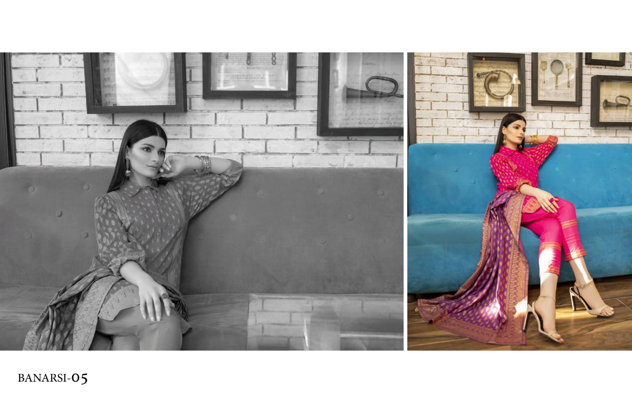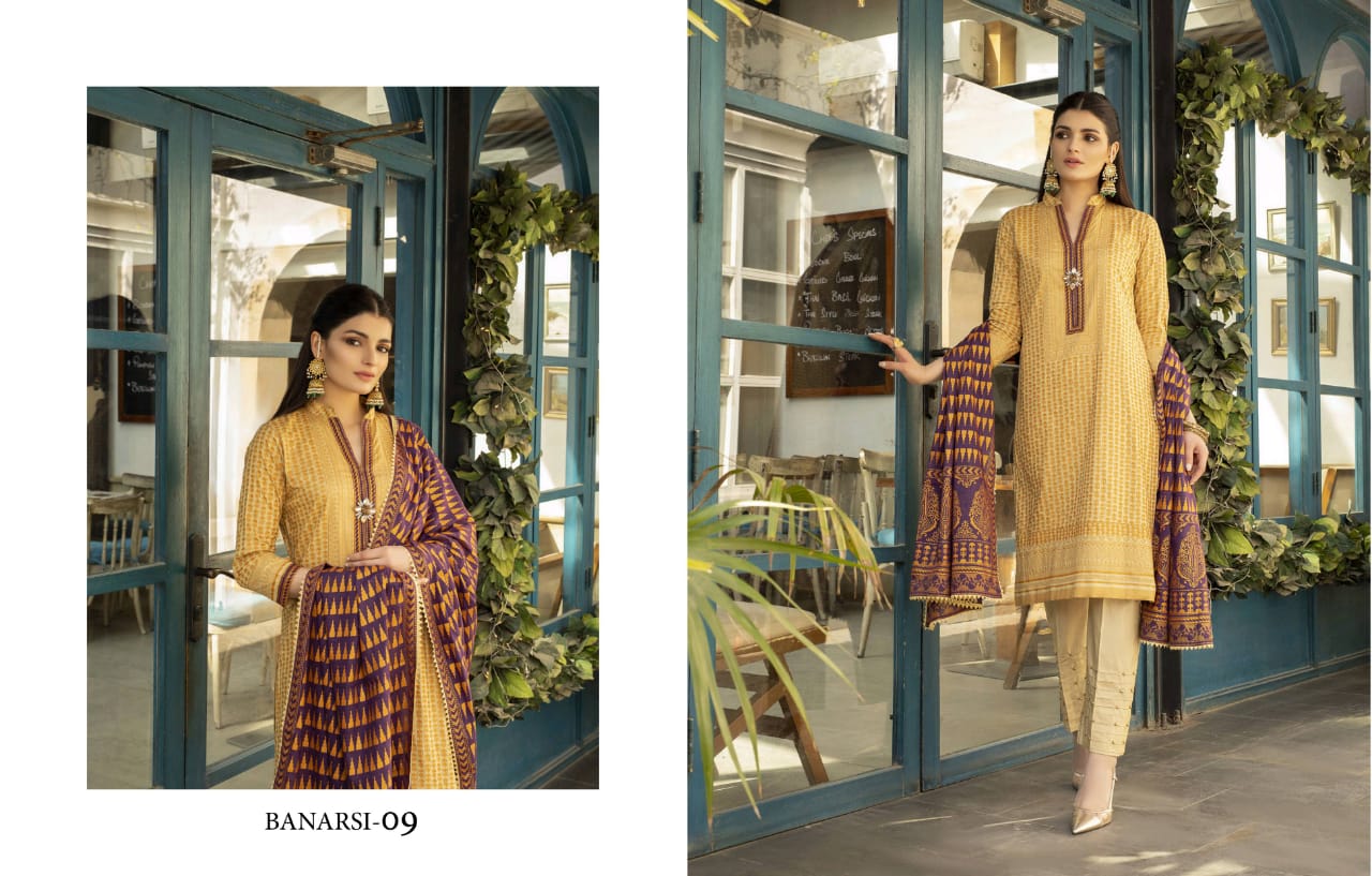 BANARSI Printed Collection By ZS Textile Description:- Printed Lawn Shirt, Printed Lawn Dupattas, Dyed Cambric Trouser. 10 Designs Single Colour, 10 pieces Set With packing & photo Rate ~ 1050/-₹ |