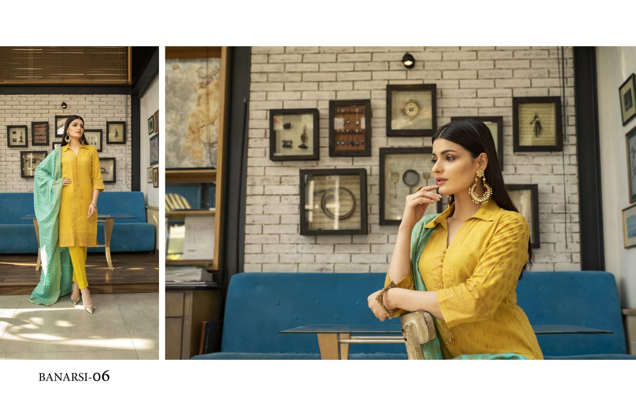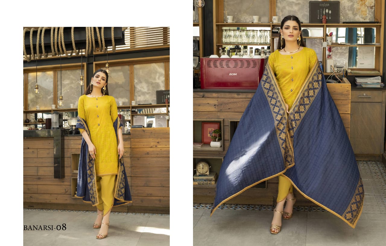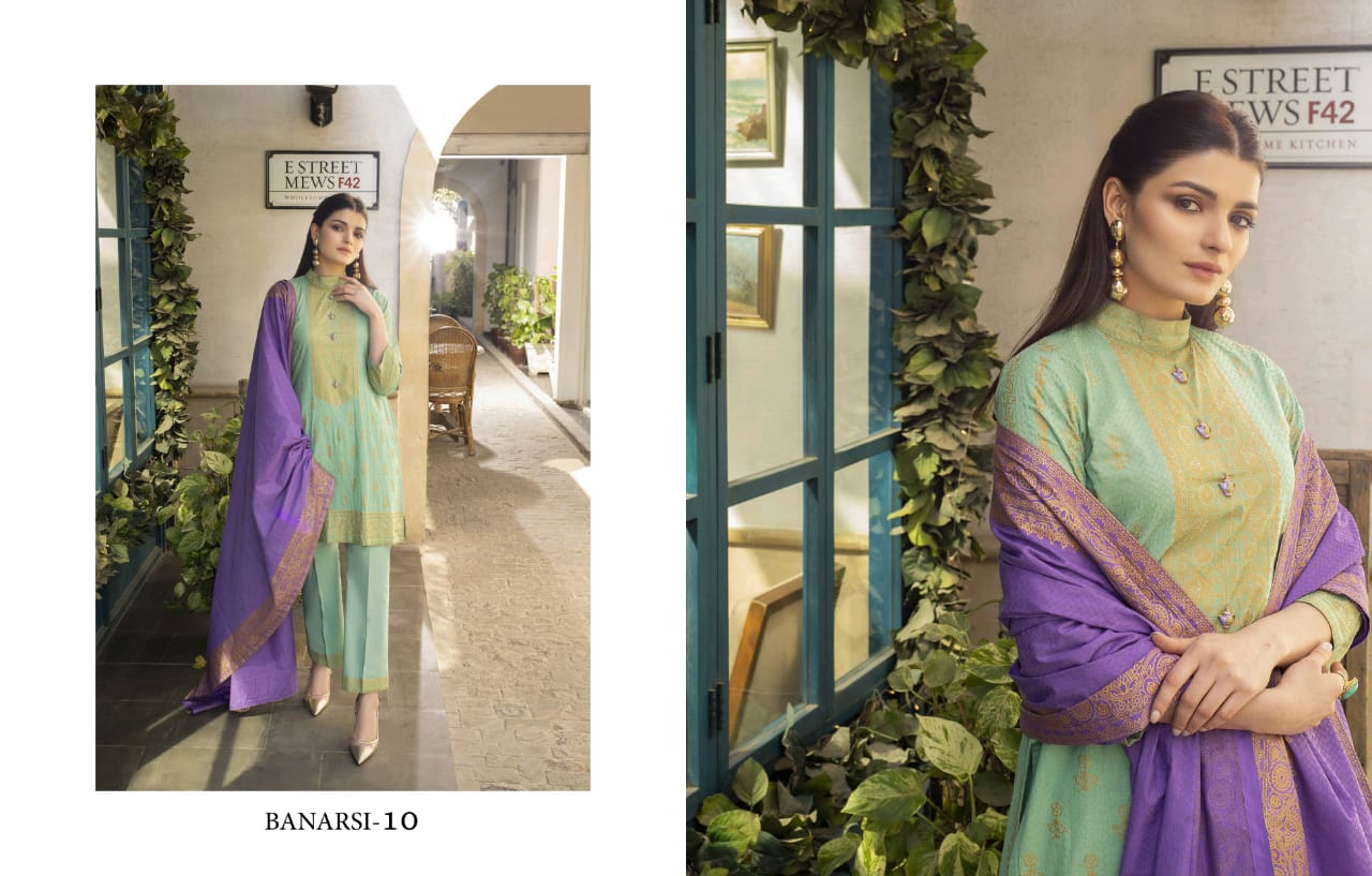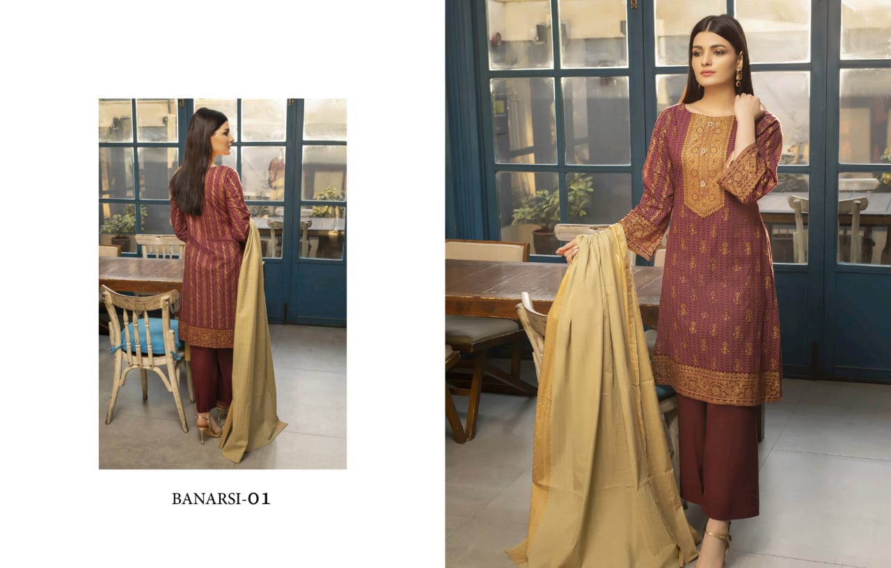 BANARSI Printed Collection By ZS Textile Description:- Printed Lawn Shirt, Printed Lawn Dupattas, Dyed Cambric Trouser. 10 Designs Single Colour, 10 pieces Set With packing & photo Rate ~ 1050/-₹ |