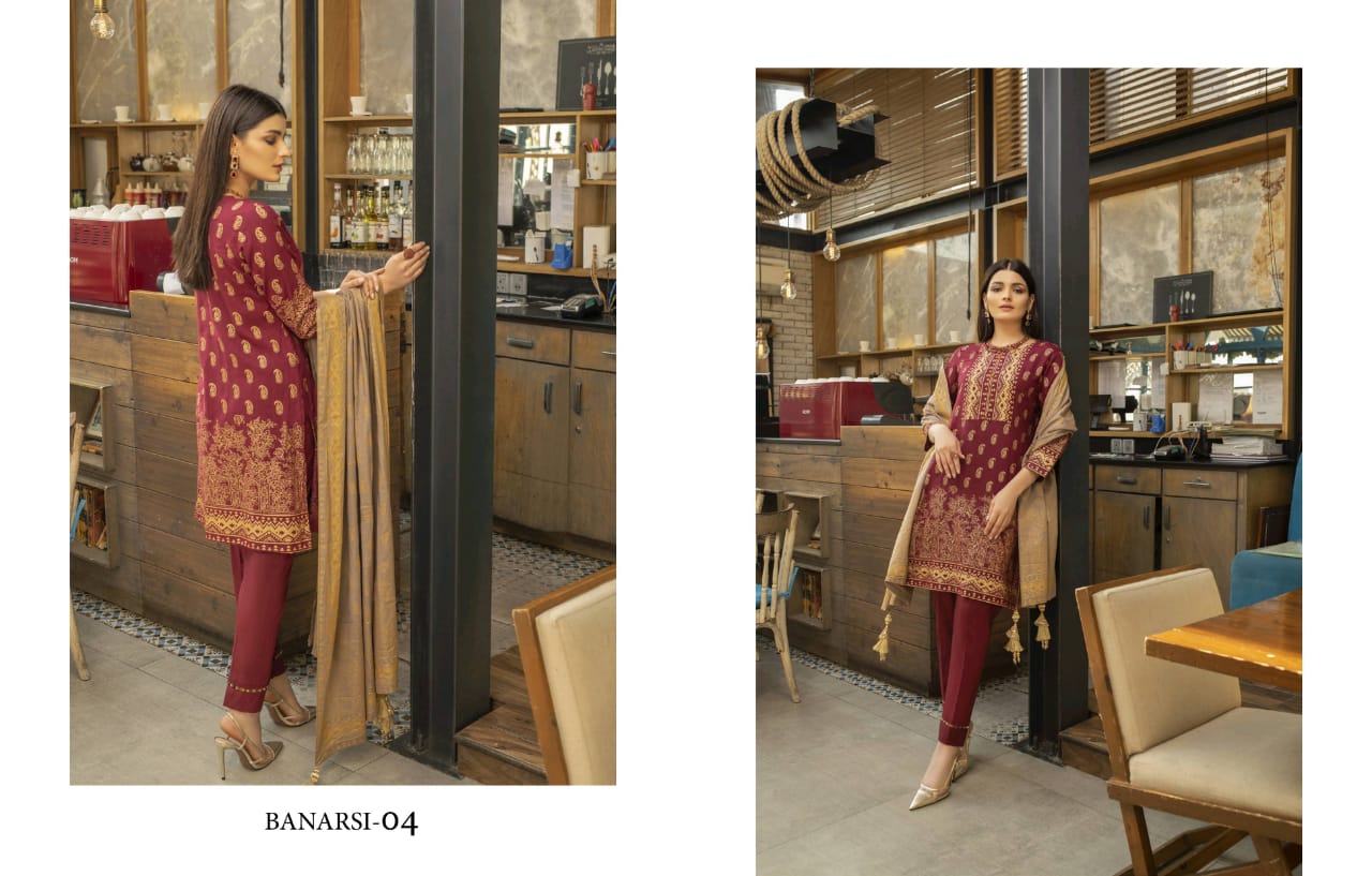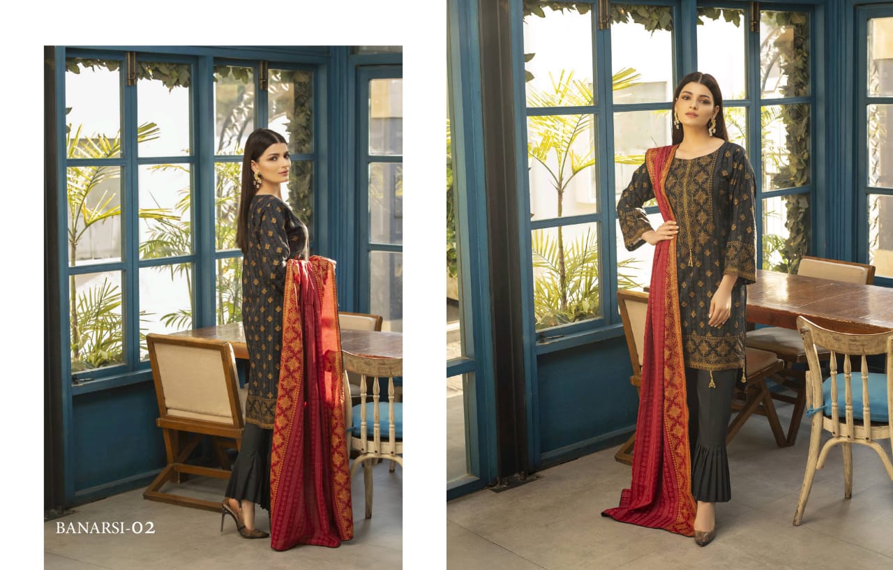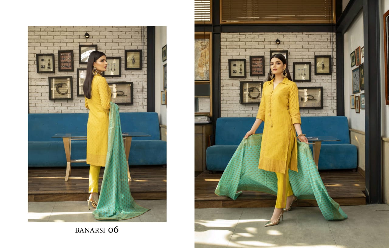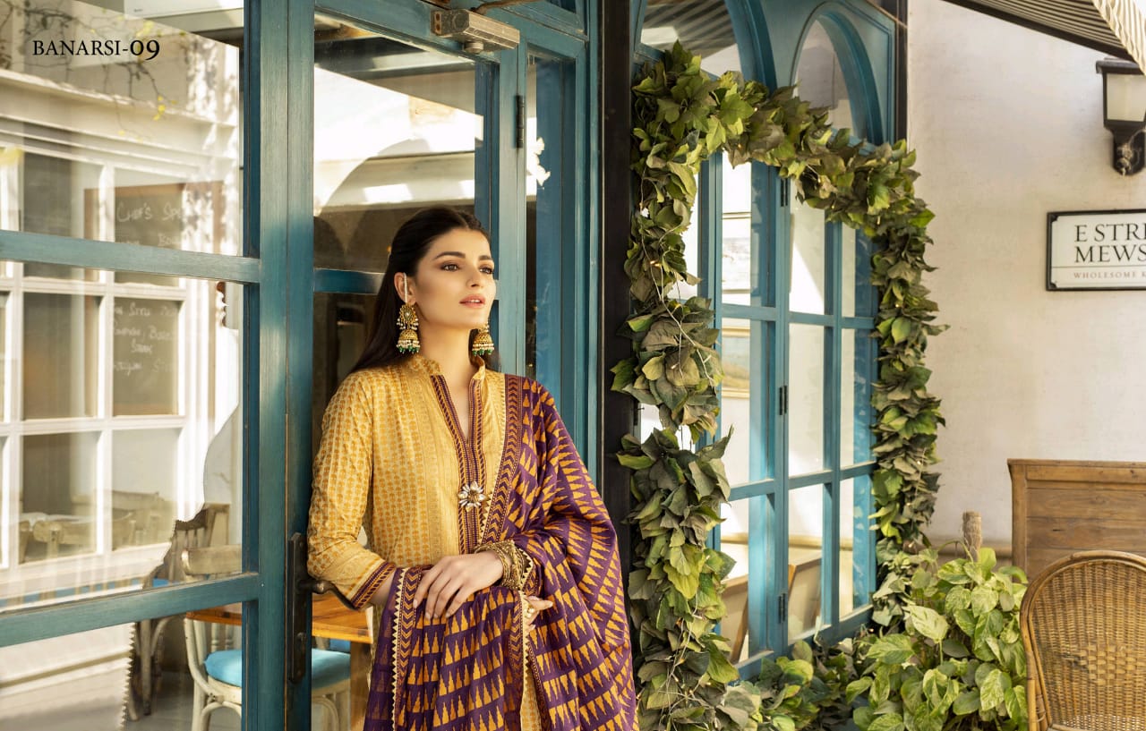 BANARSI Printed Collection By ZS Textile Description:- Printed Lawn Shirt, Printed Lawn Dupattas, Dyed Cambric Trouser. 10 Designs Single Colour, 10 pieces Set With packing & photo Rate ~ 1050/-₹ |