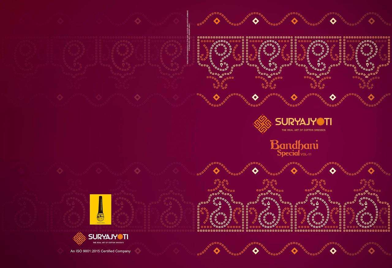 | Other Details | Dear Customers, Welcome to SURYAJYOTI LAUNCHING OF SURYAJYOTI 'S    new catalog CATALOGUE : BANDHANI SPECIAL VOL-11 CLOTH : CAMBRIC COTTON PRINT DUPATTA :COTTON CONCEPT : BANDHANI Cut :2.5-2.0-2.25 Rate : 425/- Packing :* POUCH WITH BAG PACK*  Always with you... Team SURYAJYOTI THANKS SIR/MADAM.. |