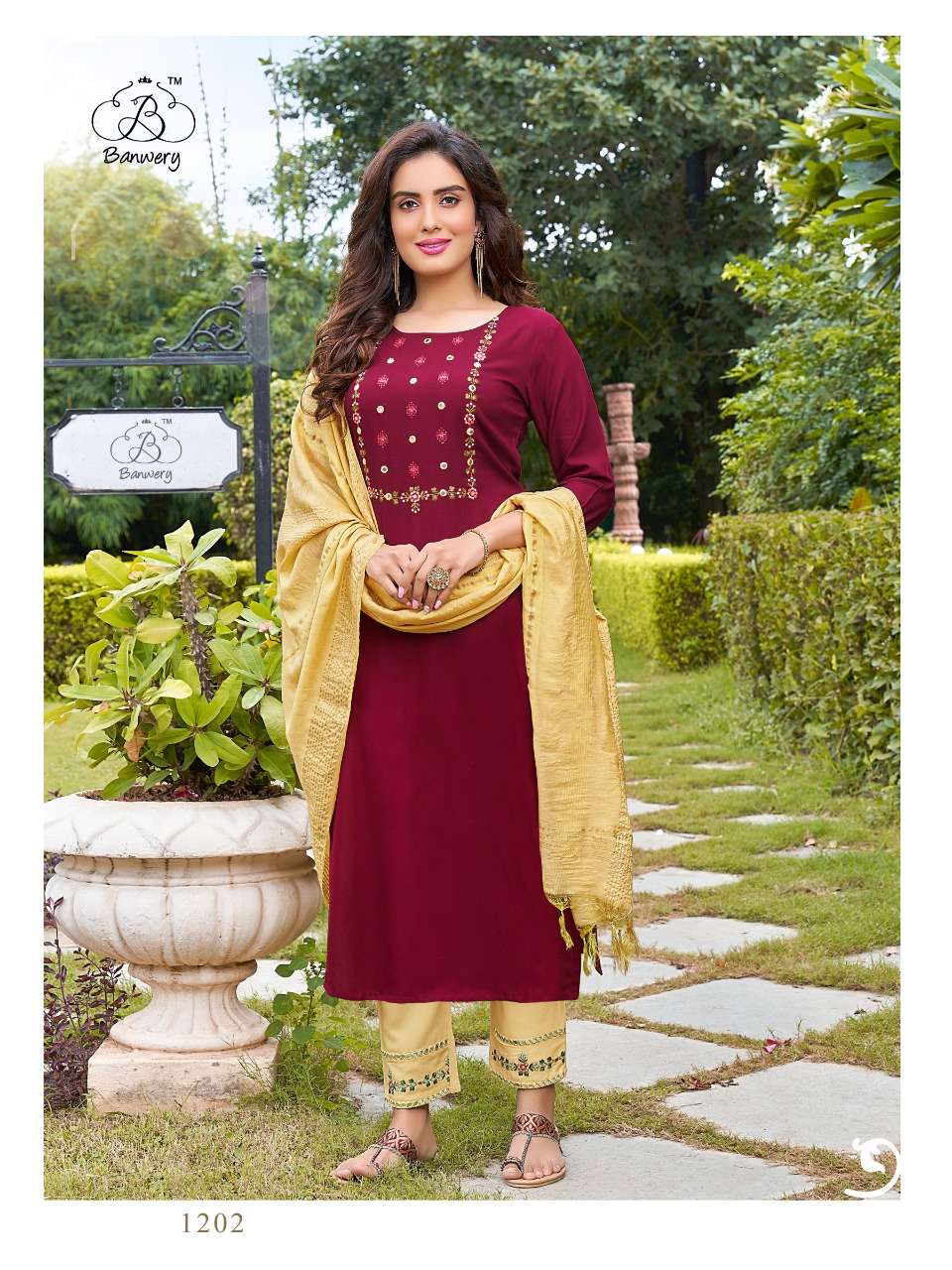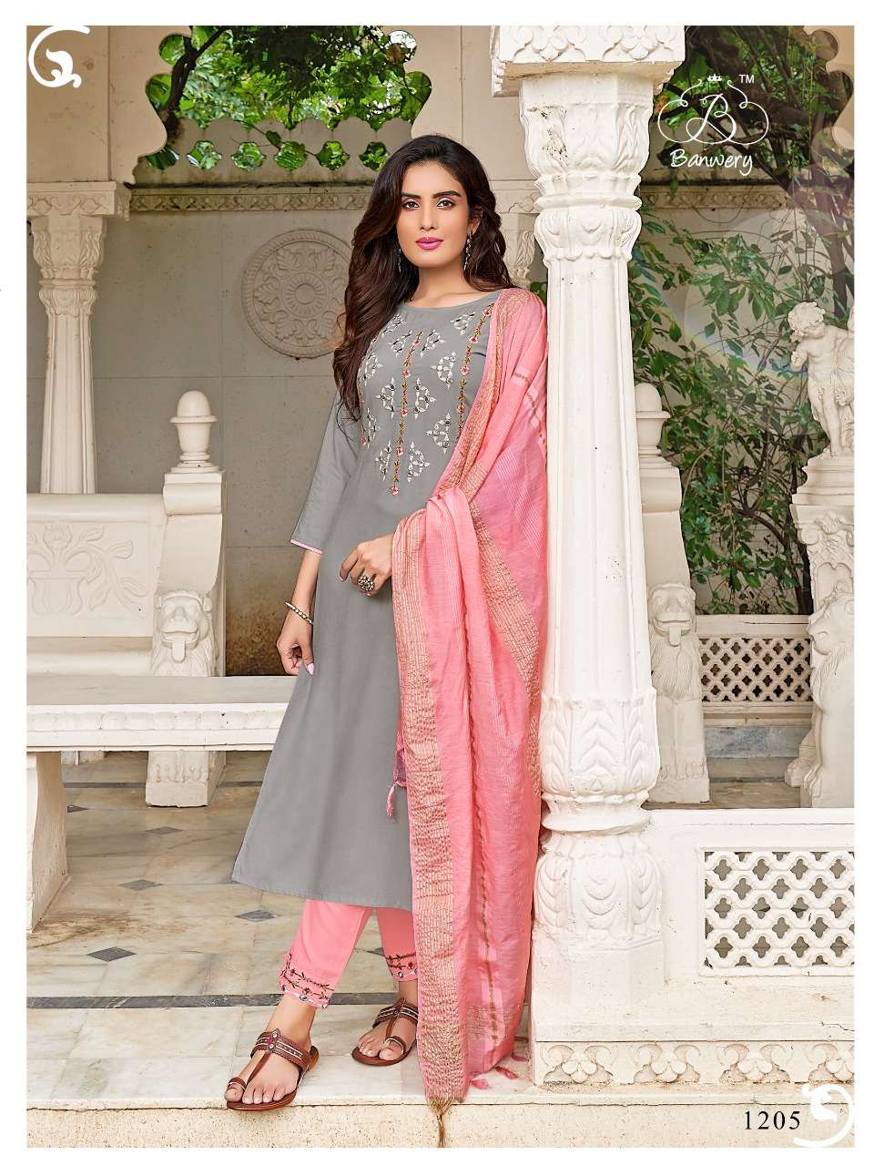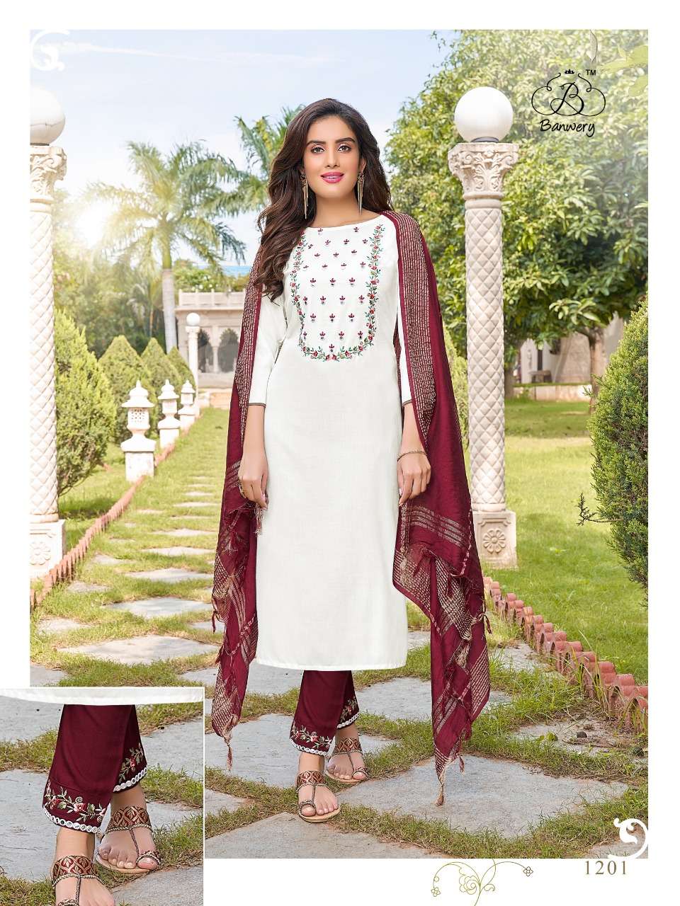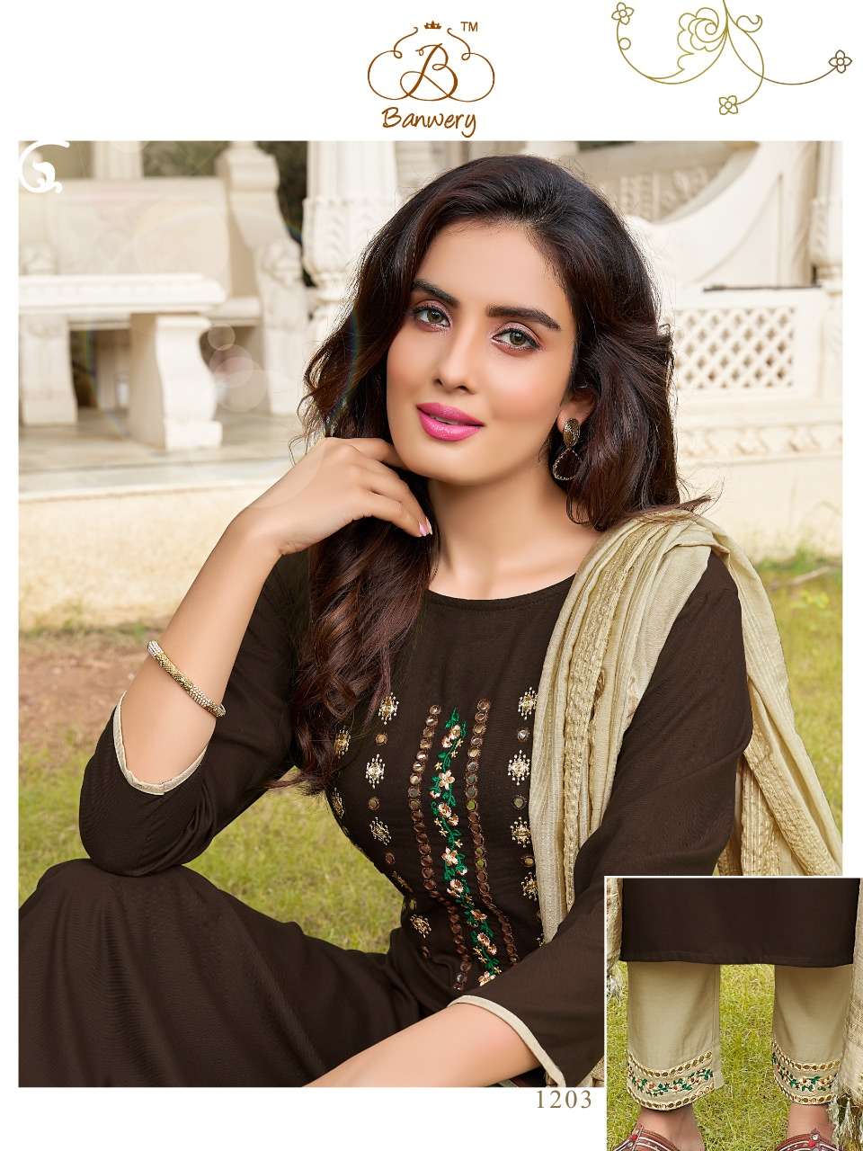 🔥🔥BANWERY🔥 THREE PIECE CATALOGUE KURTI WITH PENT WITH DUPATTA - TOP - PENT - DUPATTA - WORK - TOP 46" inch length Color : 6 Color 💢RATE - 850/- + 5%GST