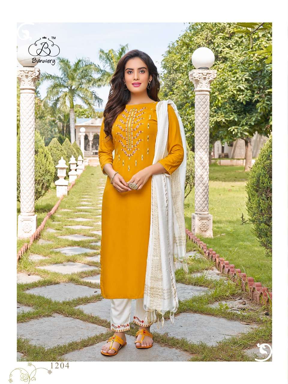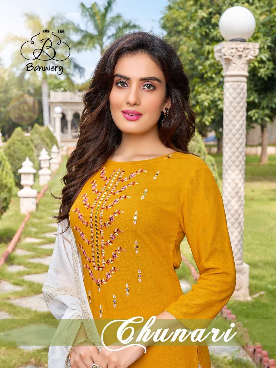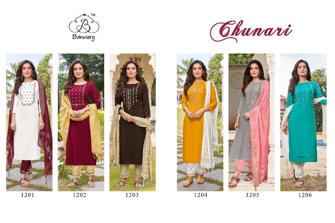 🔥🔥BANWERY🔥 THREE PIECE CATALOGUE KURTI WITH PENT WITH DUPATTA - TOP - PENT - DUPATTA - WORK - TOP 46" inch length Color : 6 Color 💢RATE - 850/- + 5%GST