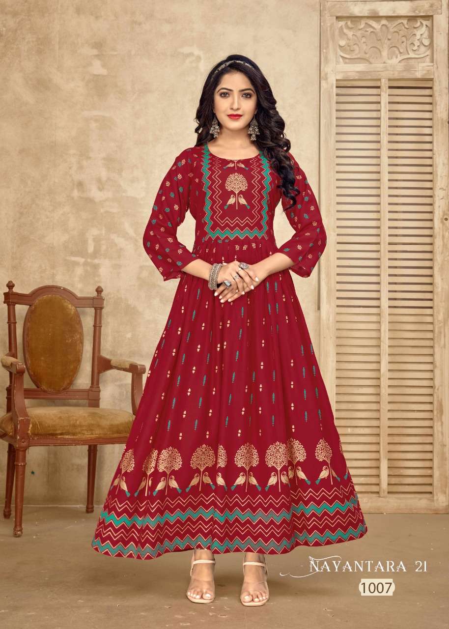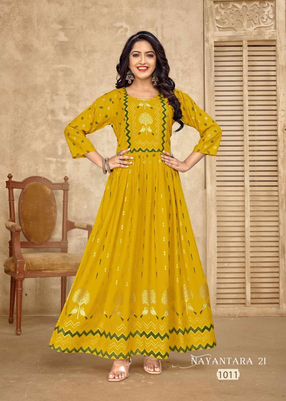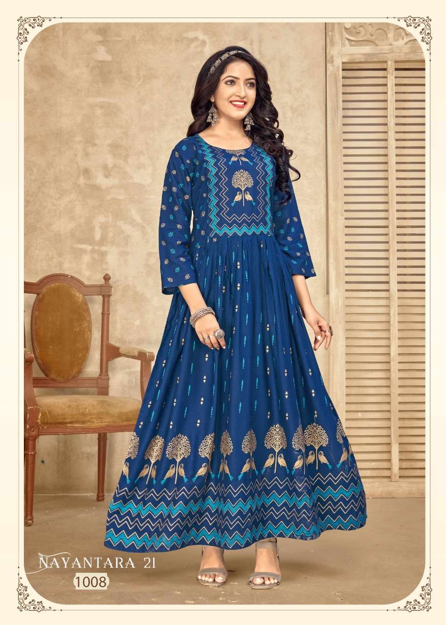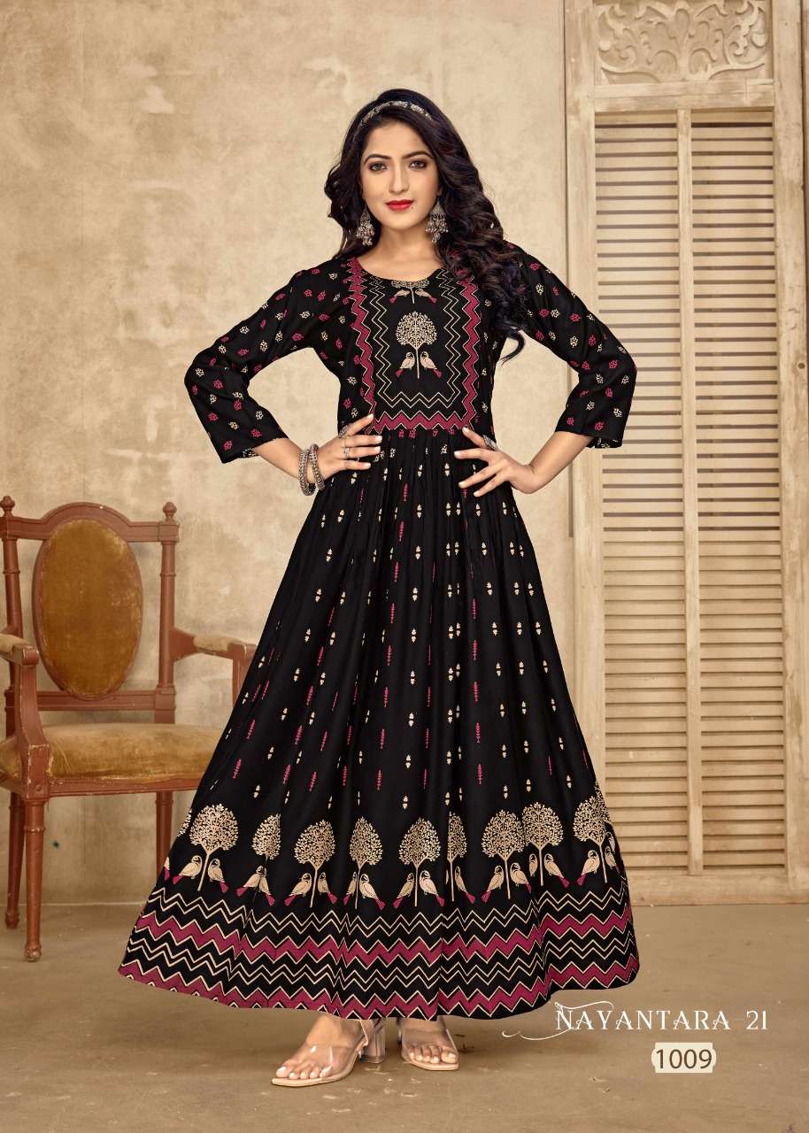 Banwery fashion Present NAYANTHARA V-21 Foil Print Flair Gown Fabric: 14kg Rayon with Foil Print Size: Length: 52” Price: 699/- + GST |