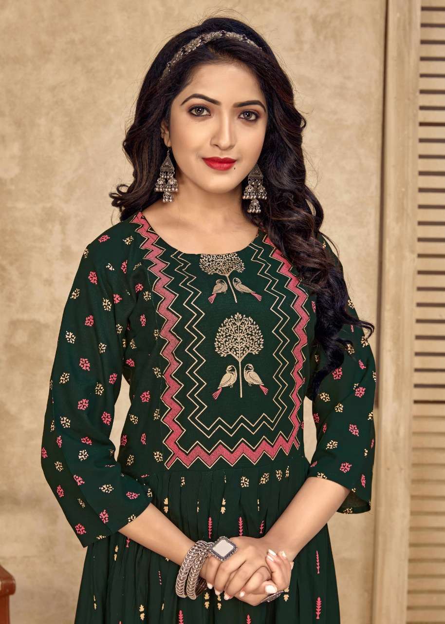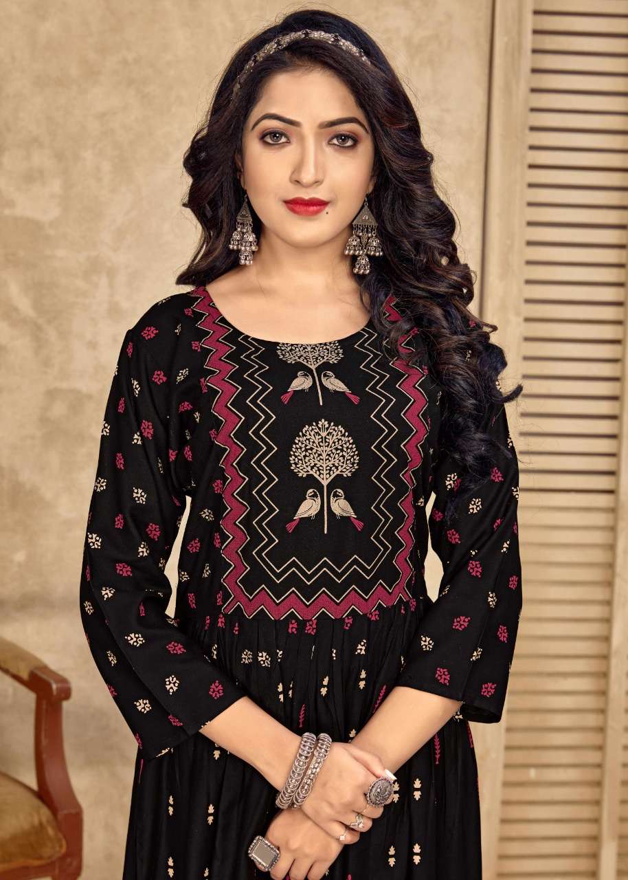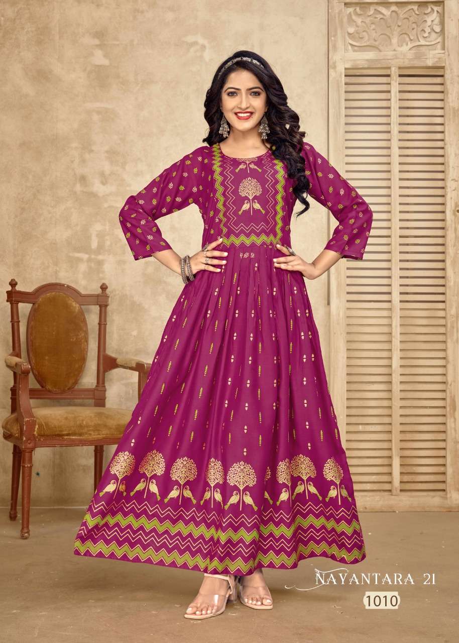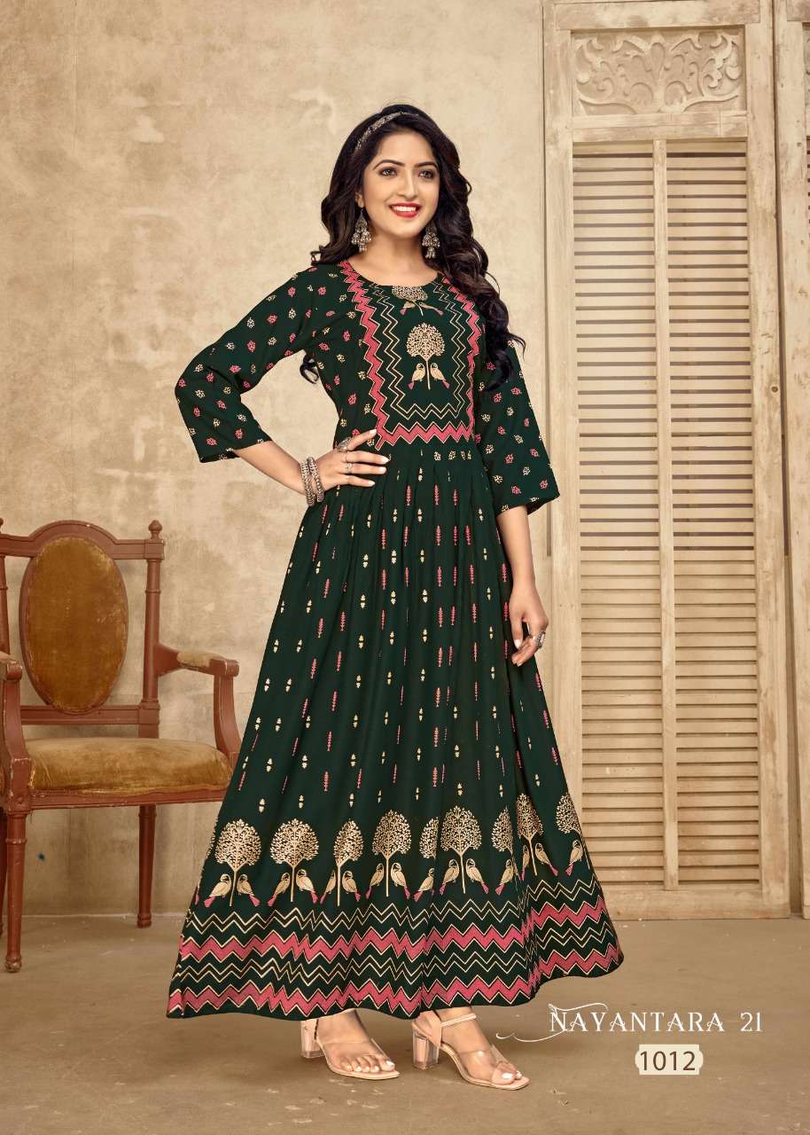 Banwery fashion Present NAYANTHARA V-21 Foil Print Flair Gown Fabric: 14kg Rayon with Foil Print Size: Length: 52” Price: 699/- + GST |