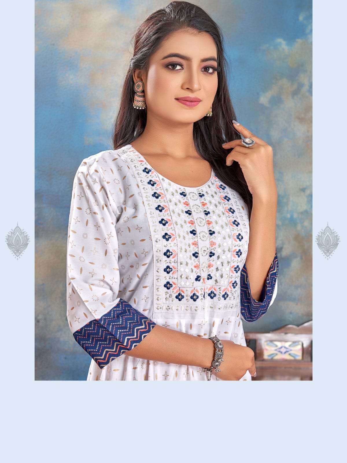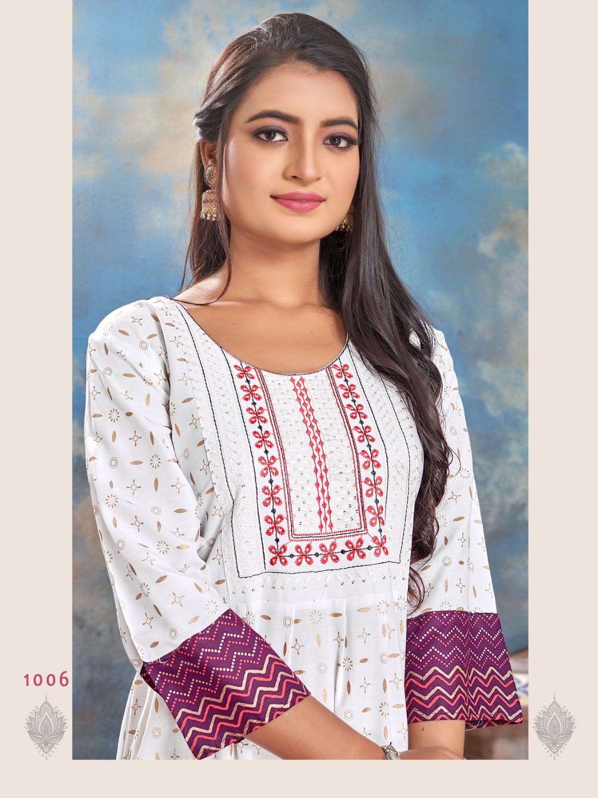 Style. : Frill Sleeves. : 3/4th sleeves Length. : 48 Sizes : M L XL XXL 3xl Colors : 6 Price : 435₹+GST |