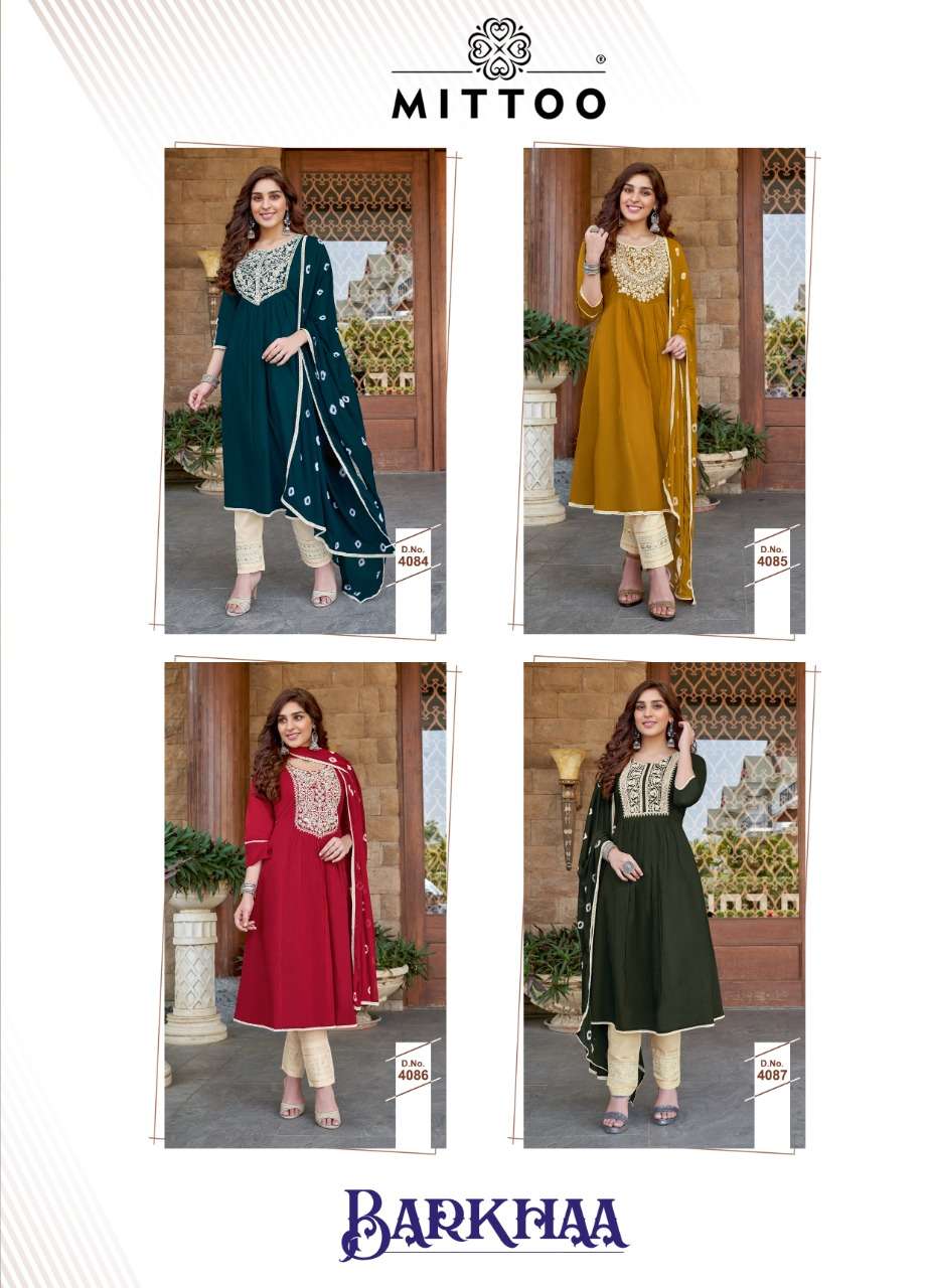 Label : Mittoo Catalog : Barkha Design : 4 Top : Mull Cotton Inner : Soft Cotton Work : Embroidery Work Bottom : Cotton Flex Dupatta : Nazmin  Size : M(38), L(40), XL(42), XXL(44), 3XL(46) Rate : 1095 / Pic + 5% GST Dispatch with in 2-3 days |