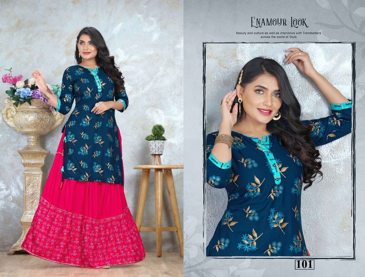 Name- BEAUTY QUEEN GARIMA Two piece catalogue Style = Top & Skirt Design:- 6 Material:- Bottom = 14 kg Slub Lenght:- Pattern:- Foil Printed Size= L XL 2XL Price= 450/- |