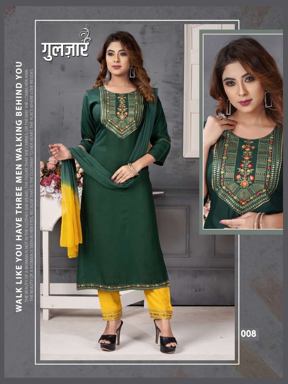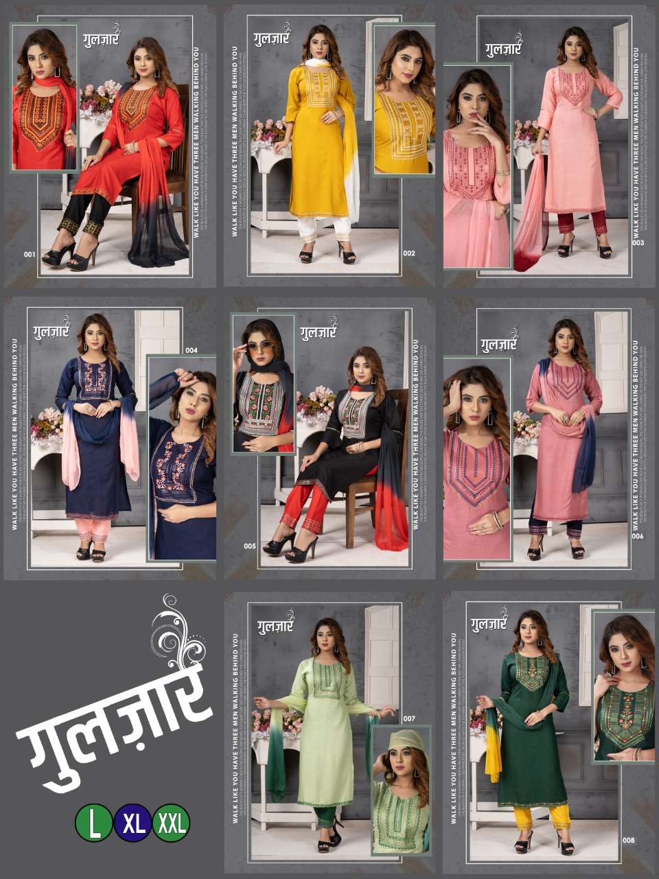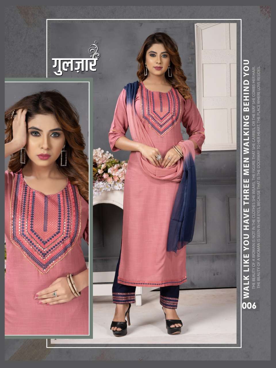 📒NAME: BEAUTY QUEEN GULZAR 👗 Fabric: Heavy Rayon Slub Concept: Heavy Sequence Work Kurti With Pant & Double Dying Dupatta Length : 44” ⚜️DESIGNS: 8 SIZES: L, XL, XXL Rate: 560/- |