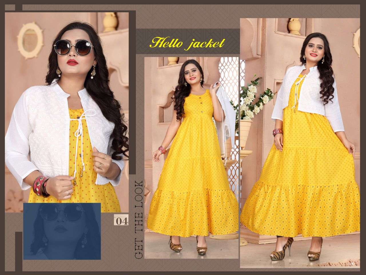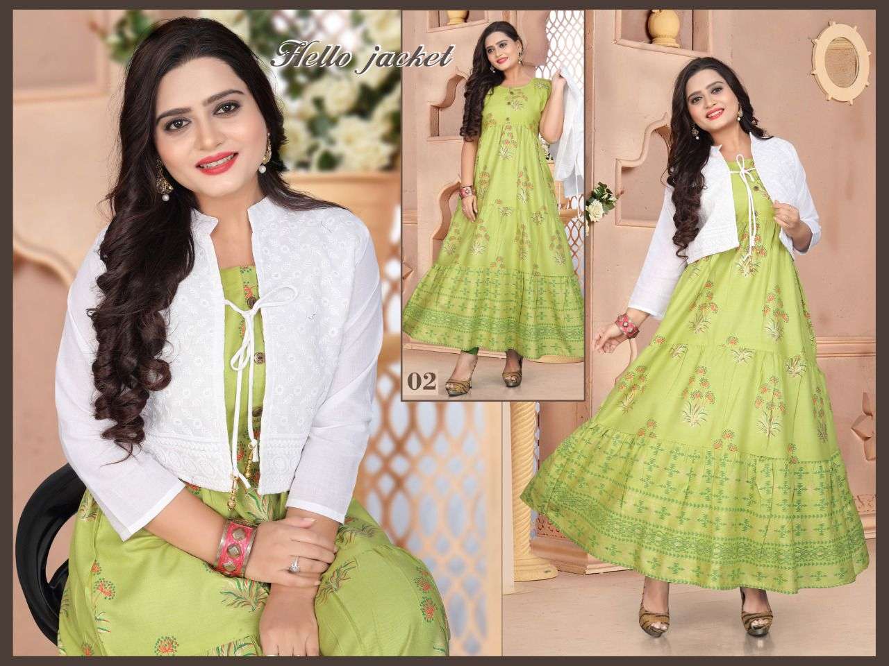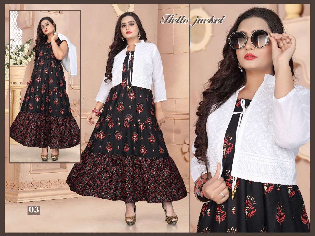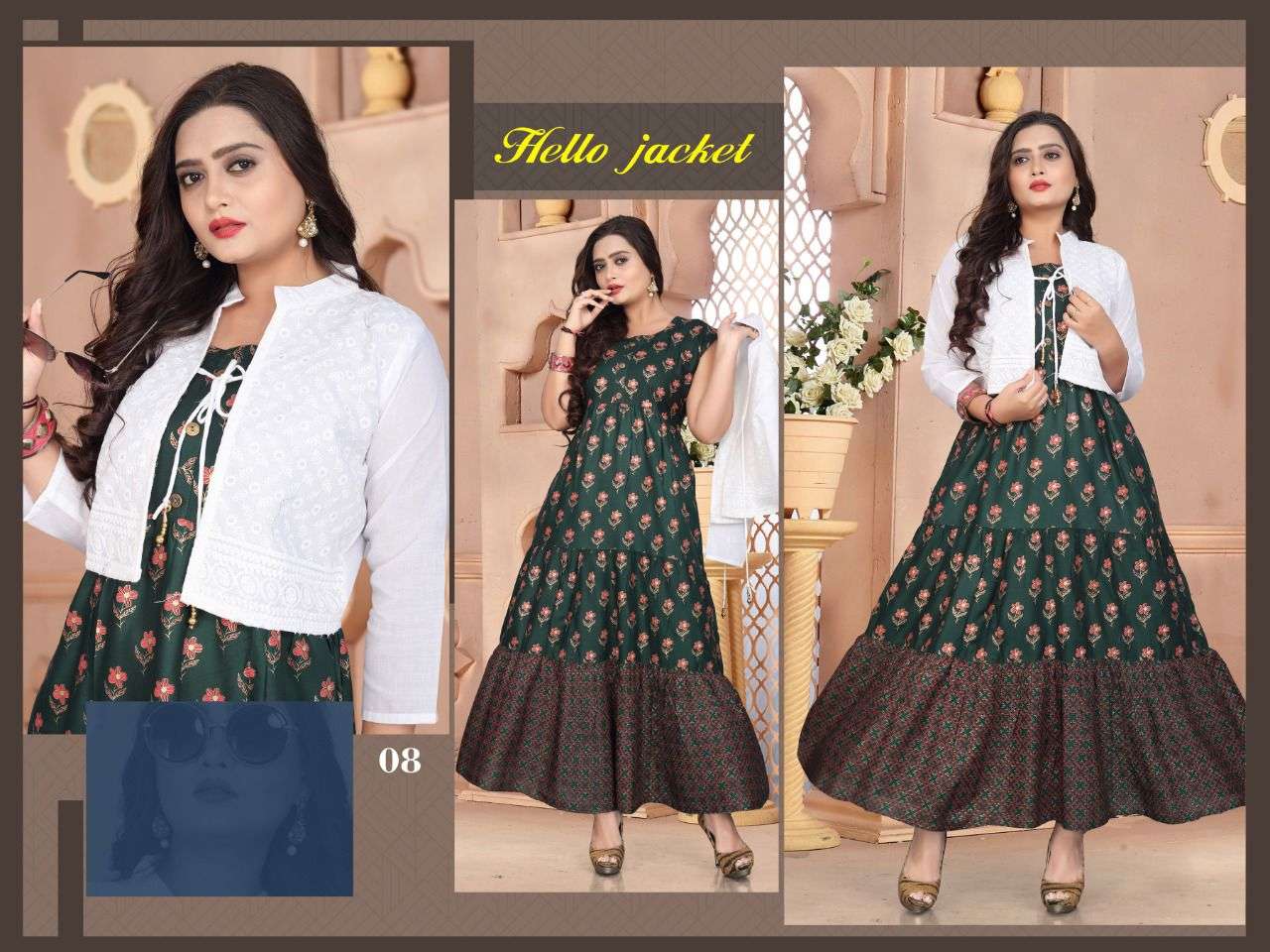 Beauty Queen Hello Jacket HEAVY RAYON PRINT TOP WITH JACKET KURTI CATALOG WHOLESALER BEST RATE