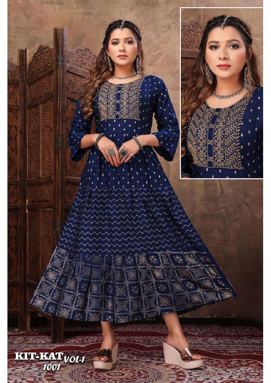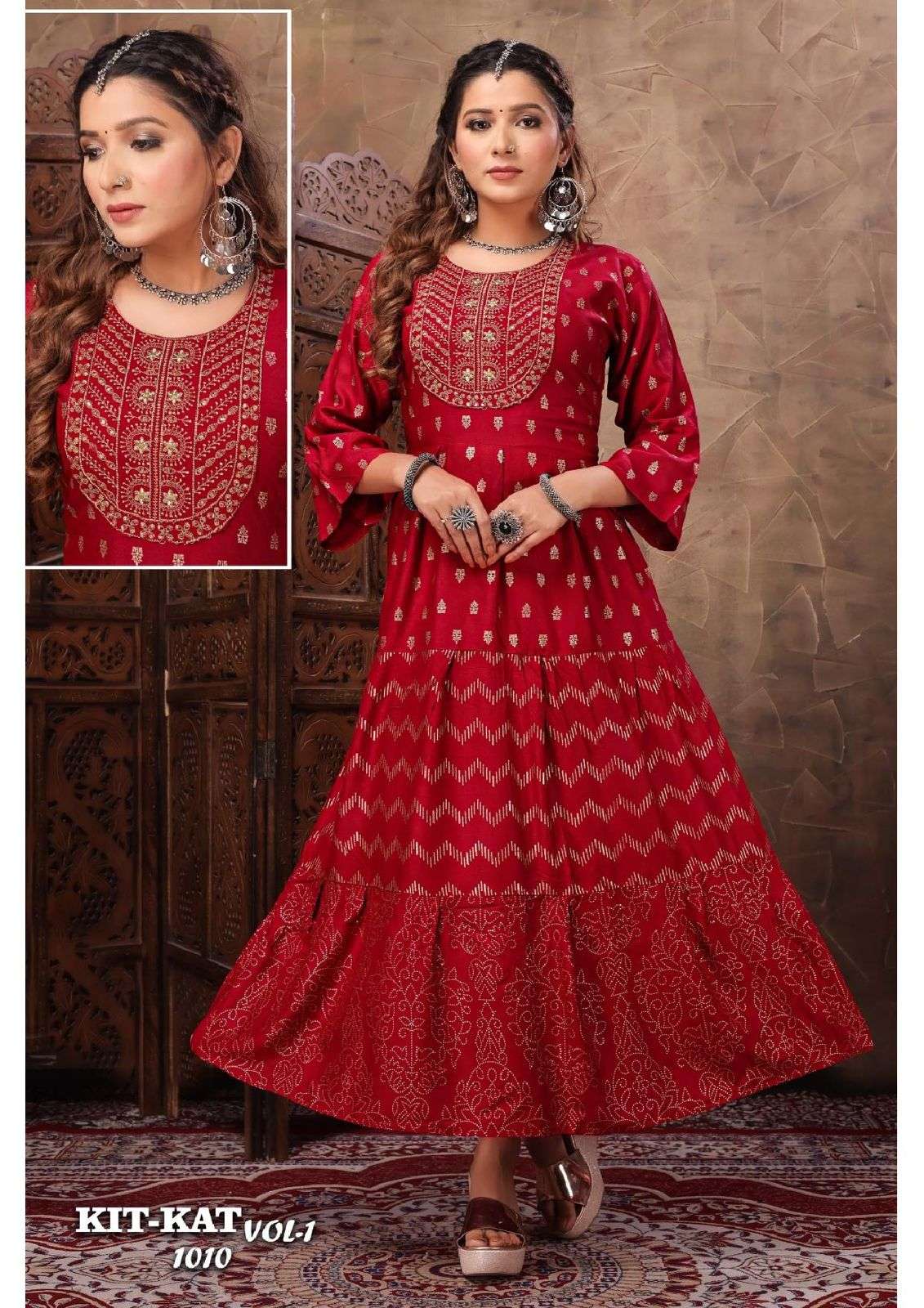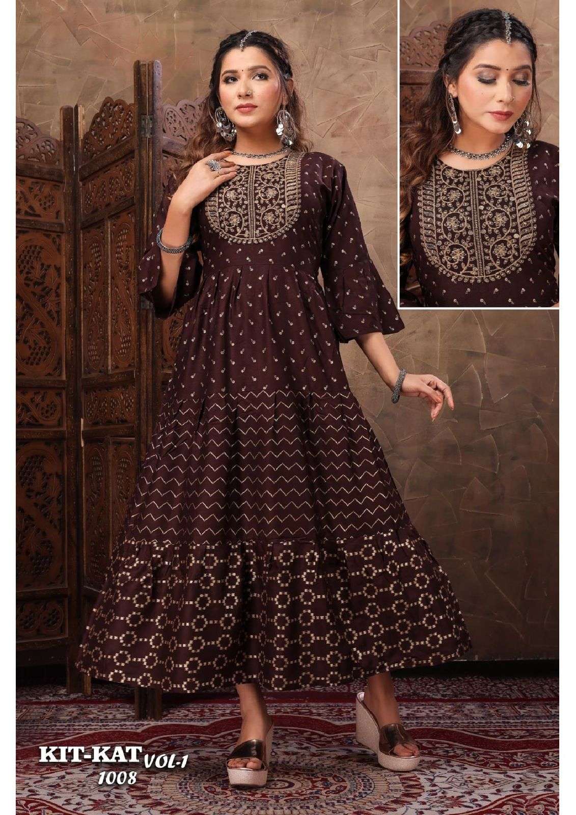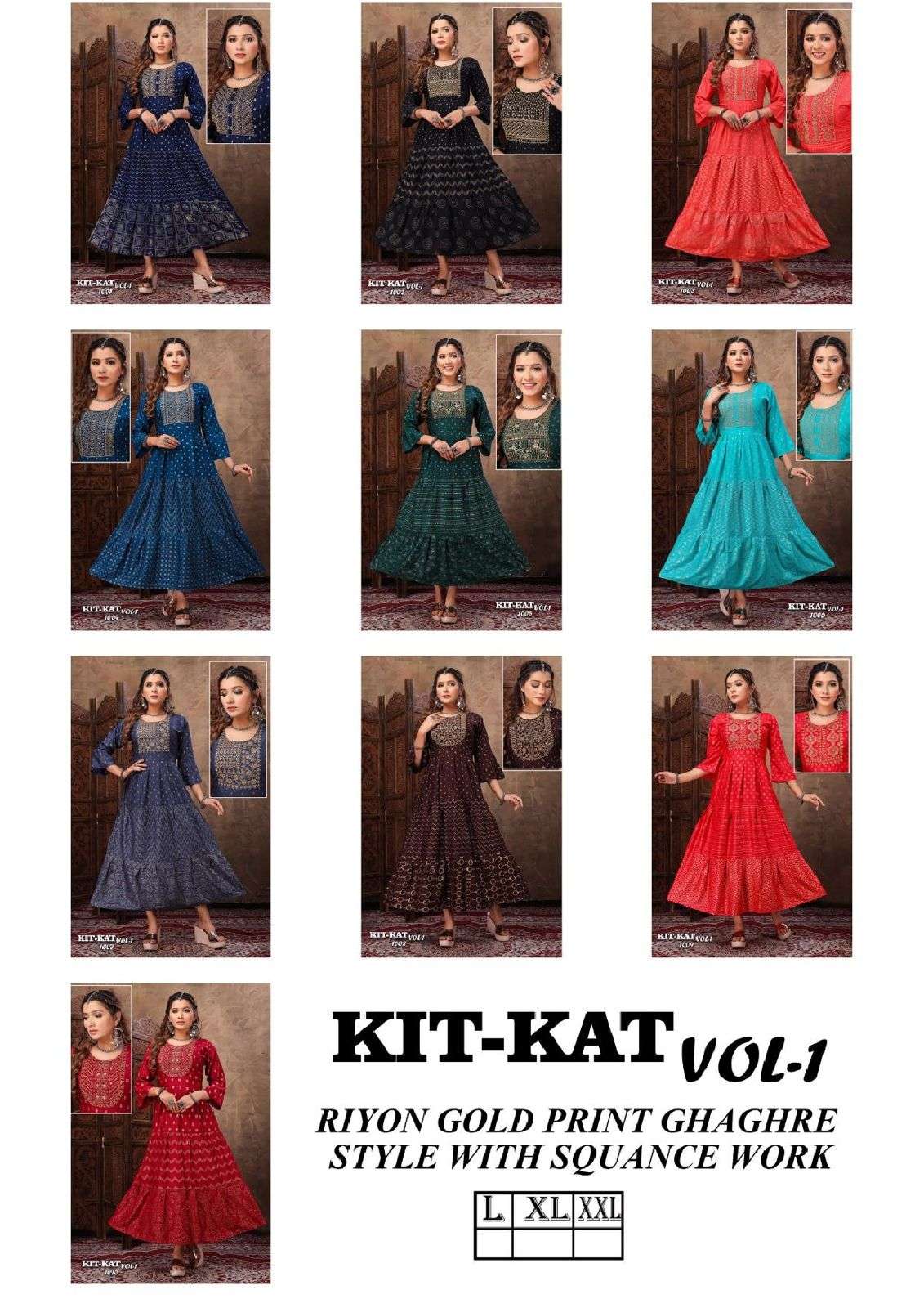 Beautu Queen Product 🎀Launch New Super Fancy Long Catalogue 🎀 📕Catalogue name :" KIT-KAT V.1 👌🏻" 💵Rate : 450/- only 💵 👗Designs : 10 ✂Sizes : L XL XXL 👘Fabric Details : Top - Finest Quality Of Rayon Prints ⏺ Gold Print Three Layer With Sequence Work |