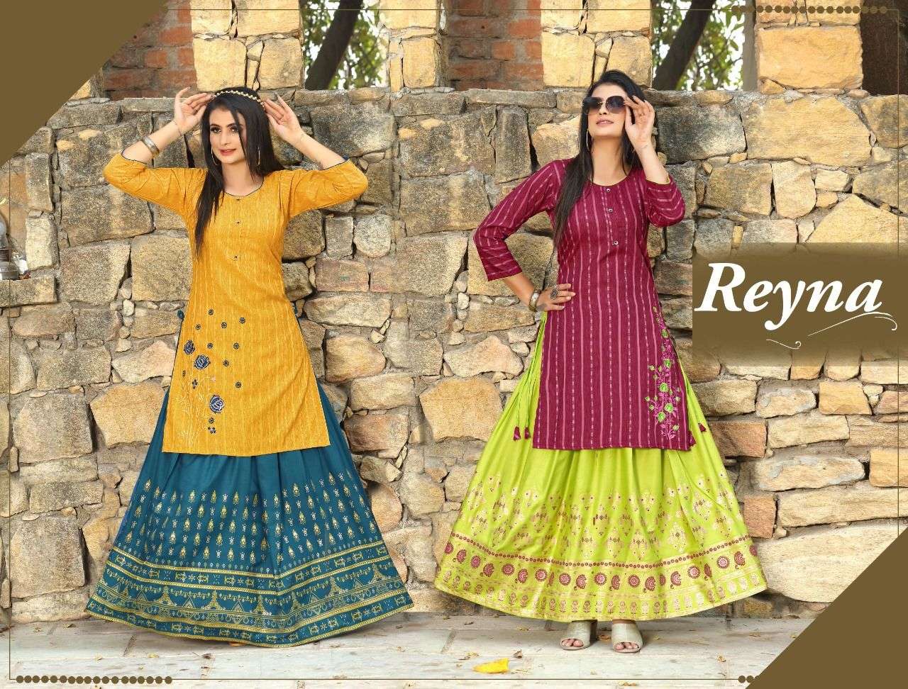 Beauty queen Reyna TOP Heavy Rayon Self Embosse 17Kg , SKIRT Rayon 17Kg Pattarn - Top Embroidered , Skirt Foil Print , CATALOG WHOLESALER BEST RATE