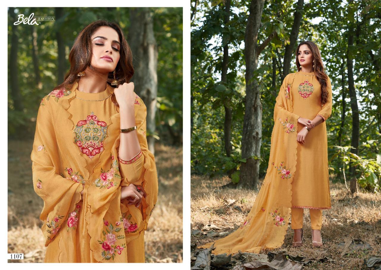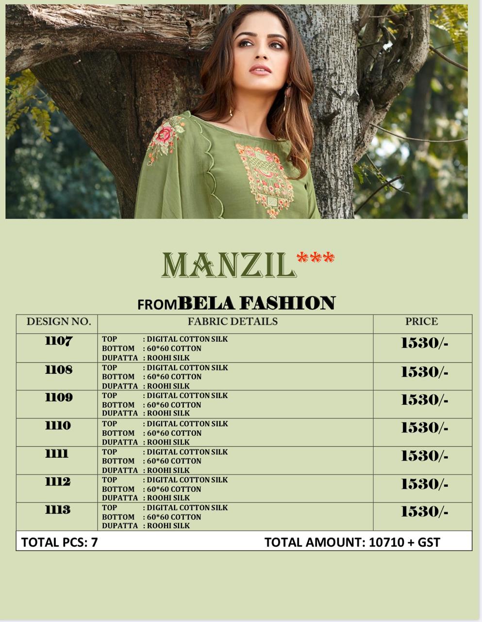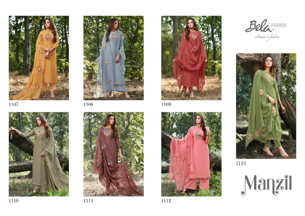 Brand - BELA . Type - suit . Catlog name - MANZIL . Series - 1107 to 1113. GST 5 Percent Extra Delivery 2 days |